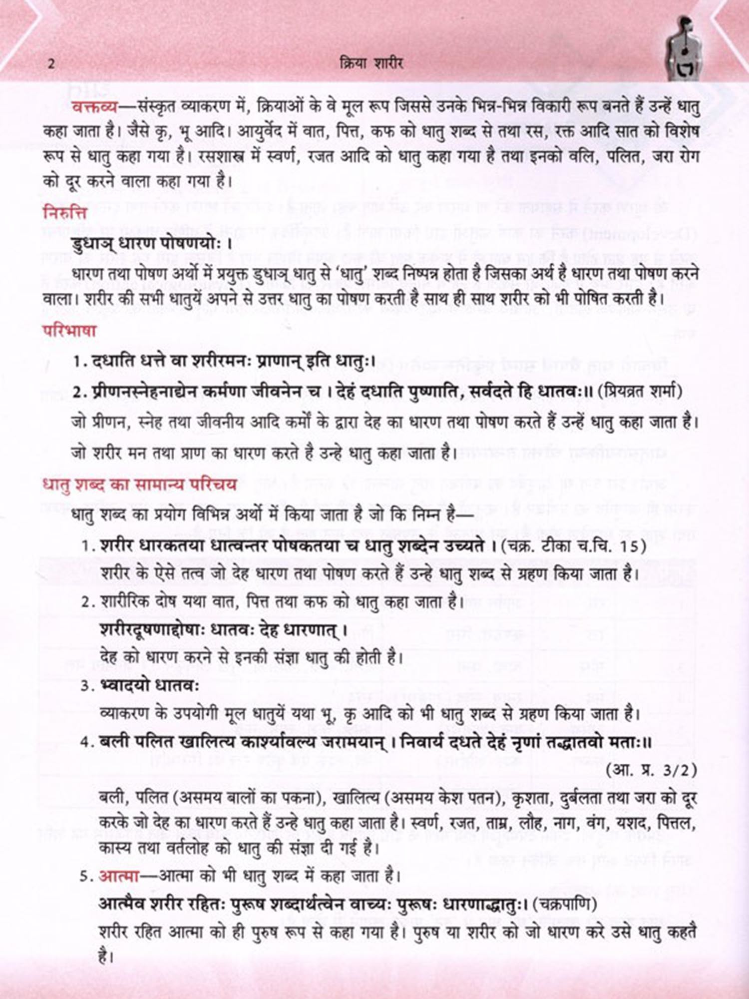 स्वस्य रहने के लिए यह आवश्यक है कि शरीर के विभित्र यंत्र तथा प्रत्यंग अपना कार्य स्वाभाविक रूप से करते रहे। शरीर के विभिन्न अंगों के स्वाभाविक कार्य का अध्ययन जिस शाख में किया जाता है उसे शरीर क्रिया विज्ञान कहा जाता है। आयुर्वेद शास्त्र का शरीर के विभित्र क्रियाओं (Physiology) के सन्दर्भ में अपना स्वतन्व सिद्धान्त है जिसके आधार पर शरीर के विभित्र क्रियाओं का वर्णन किया गया है। इसके लिए आचार्य सुश्रुत ने निम्न कहा है-