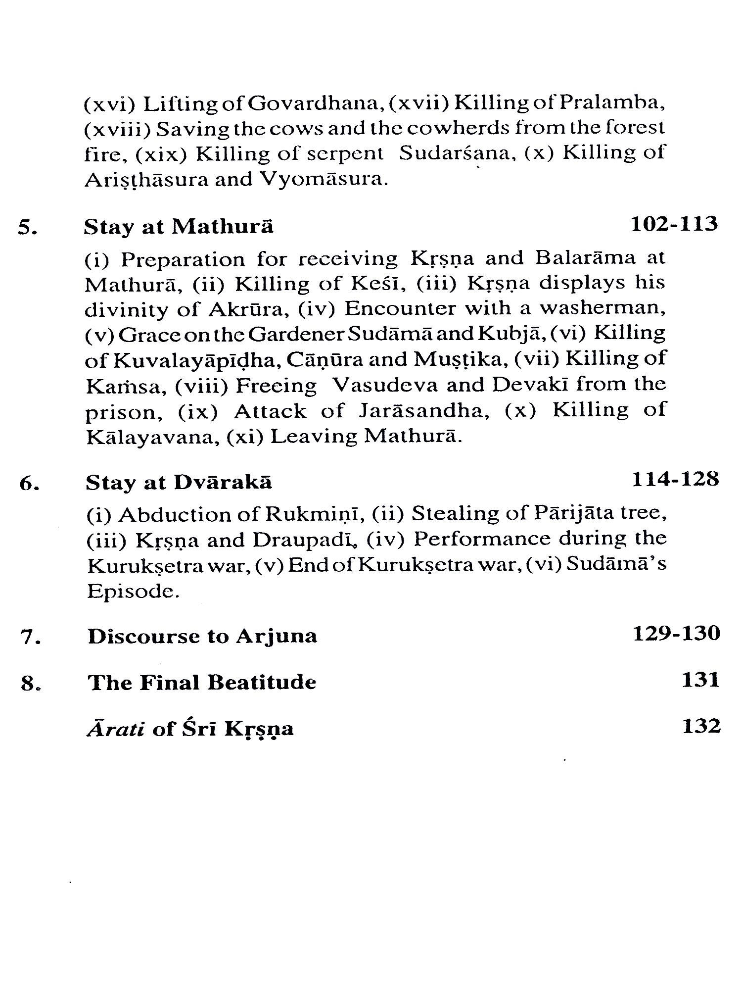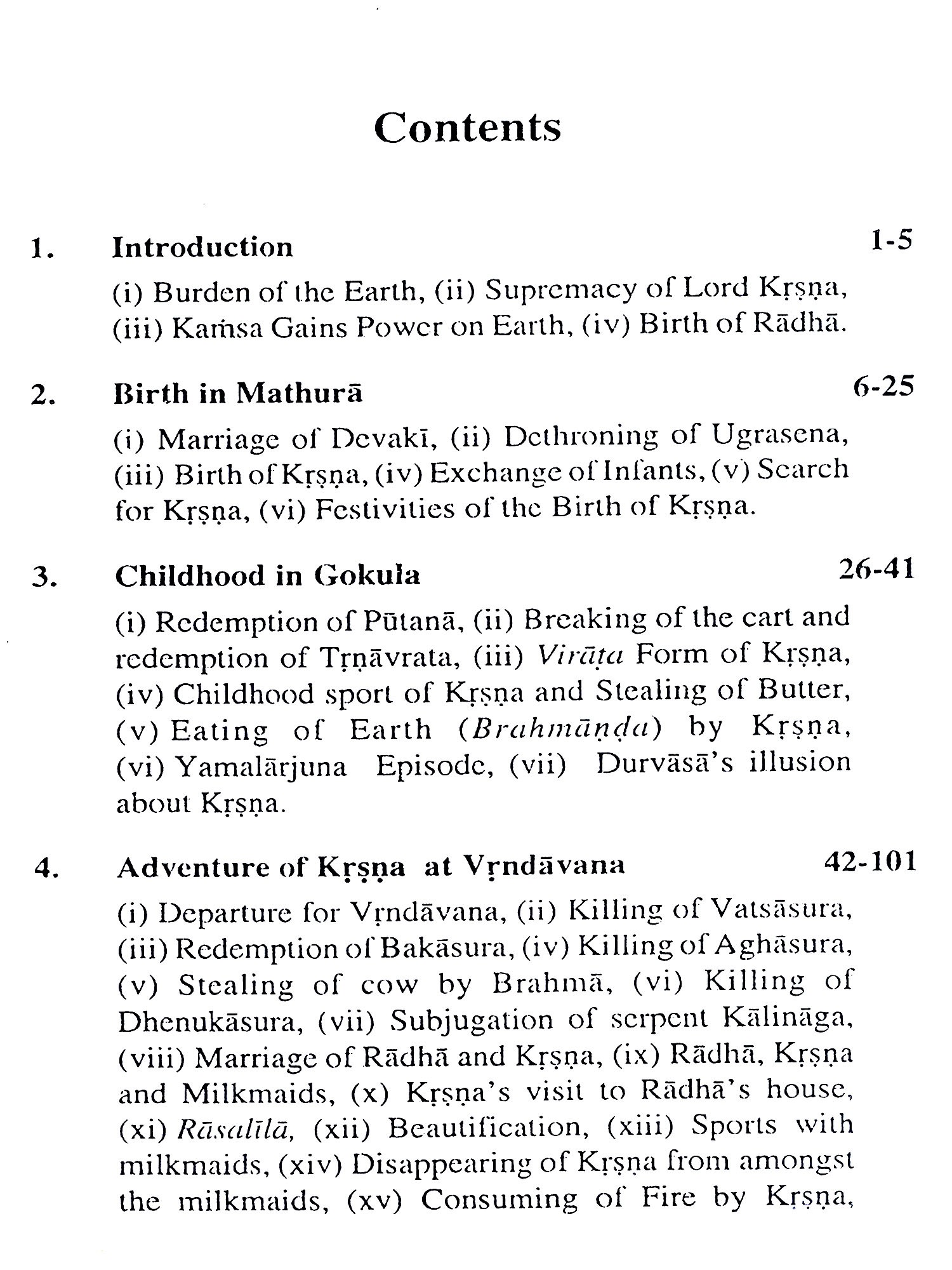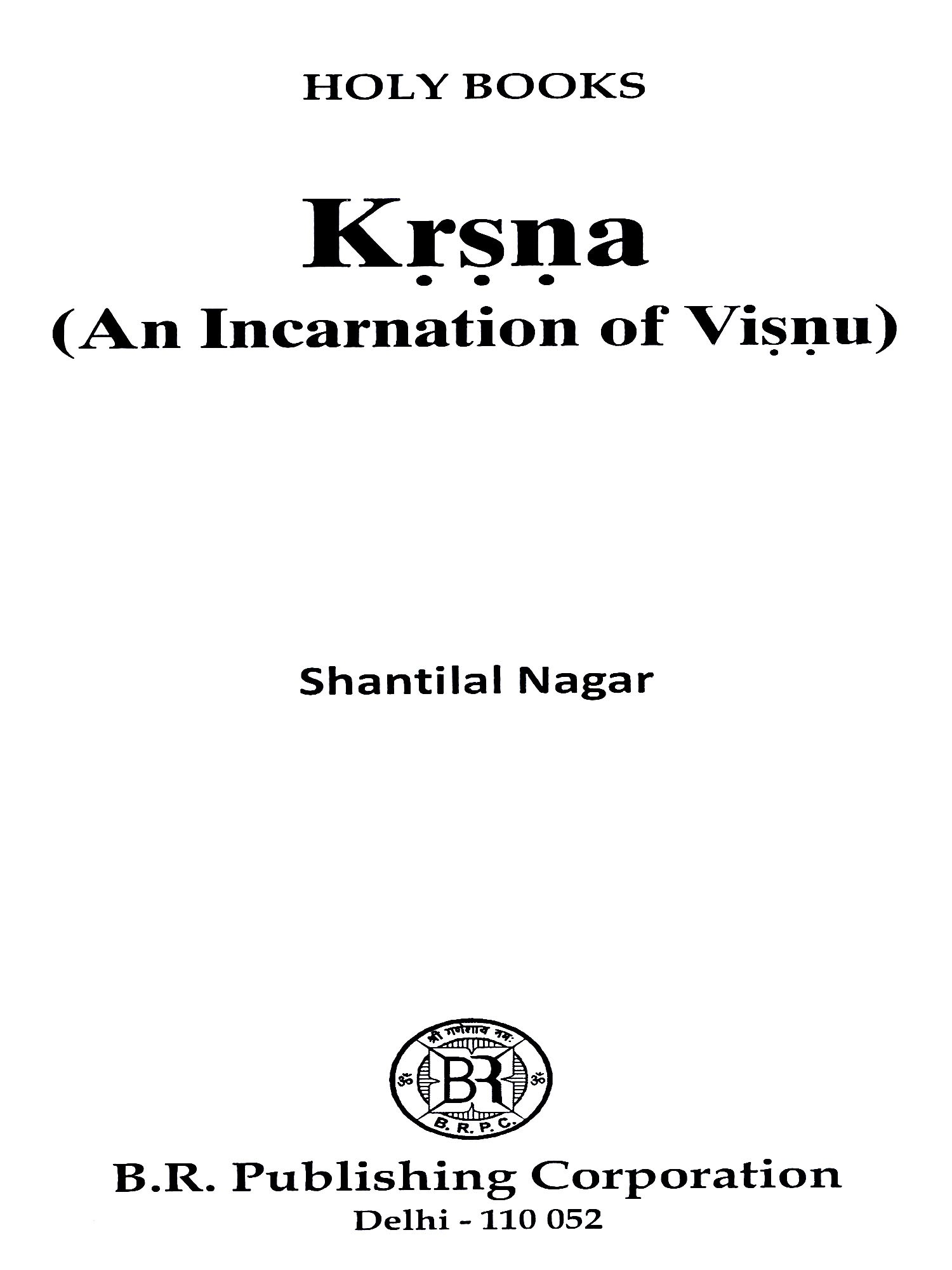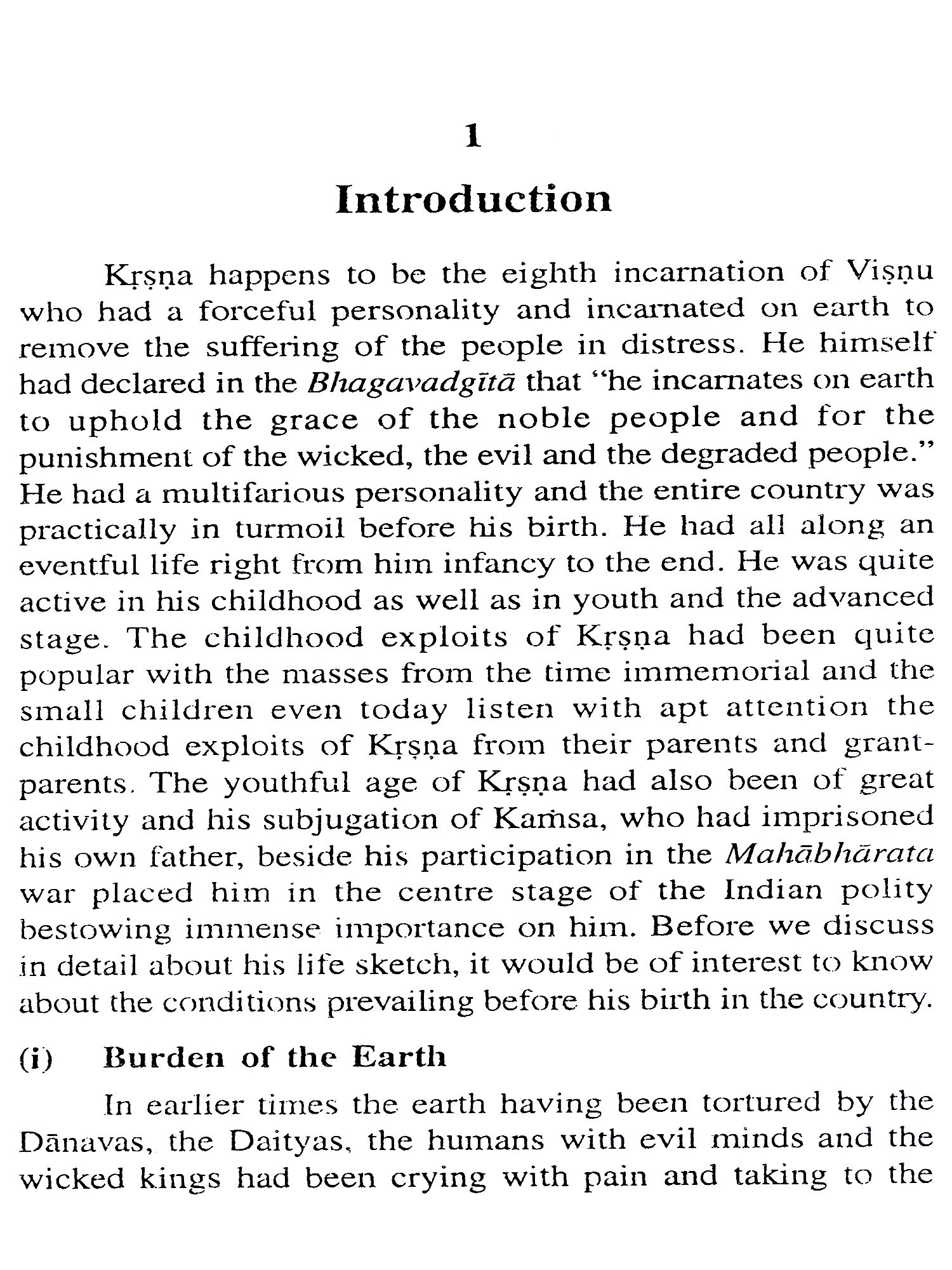 Krsna is belived to be the eighth incarnation of Visnu, who had been dominating the entire epic of Mahabharata. there is an enormous literature on Krsna, which highlights his life and events connected therewith. His popularity is still a living faith with Indian masses. His full personality is exhibited in the Puranas, more particularly in the Bhagavata and others. The work provides the glimpses of his life in brief in an interesting manner.