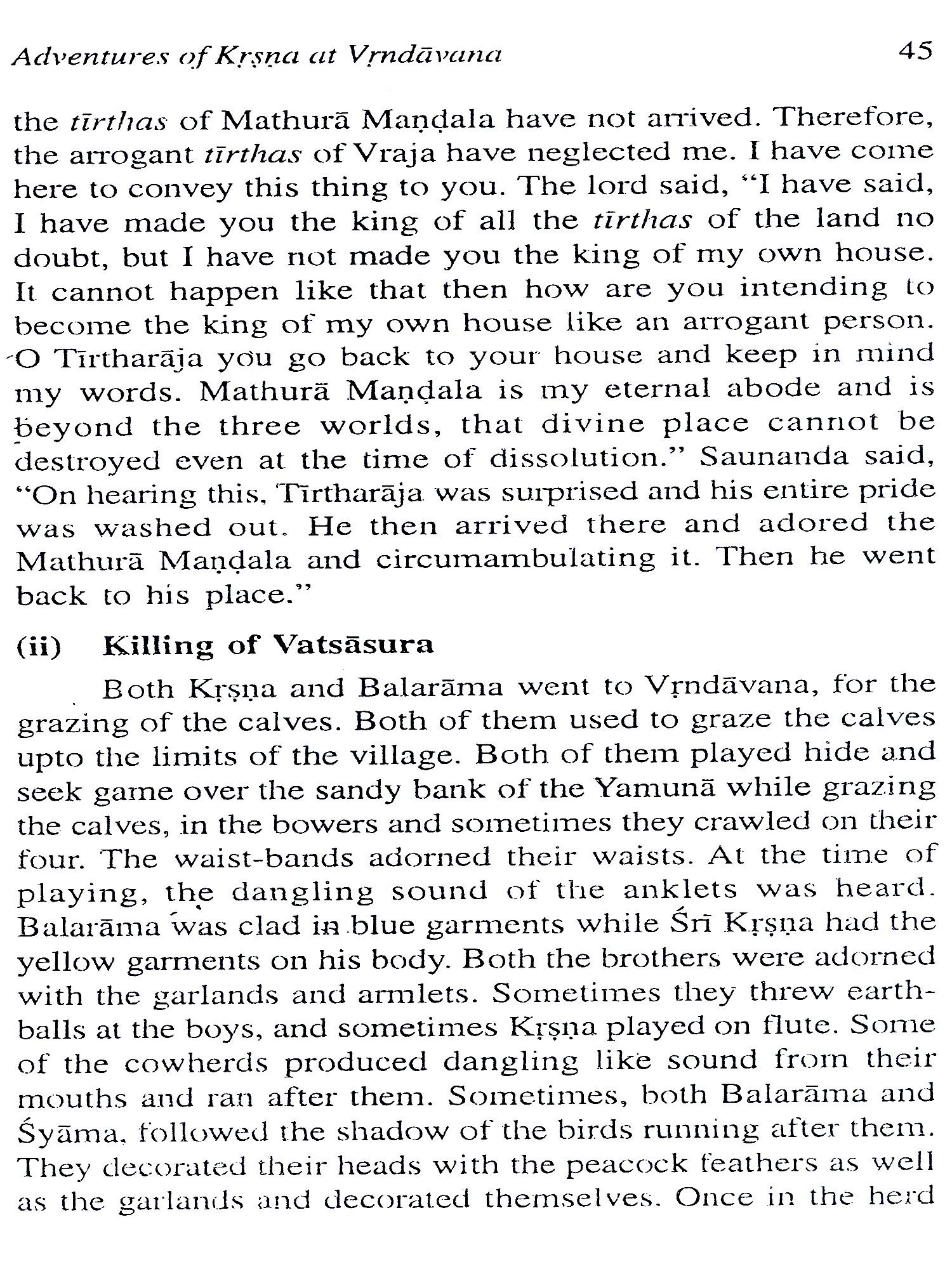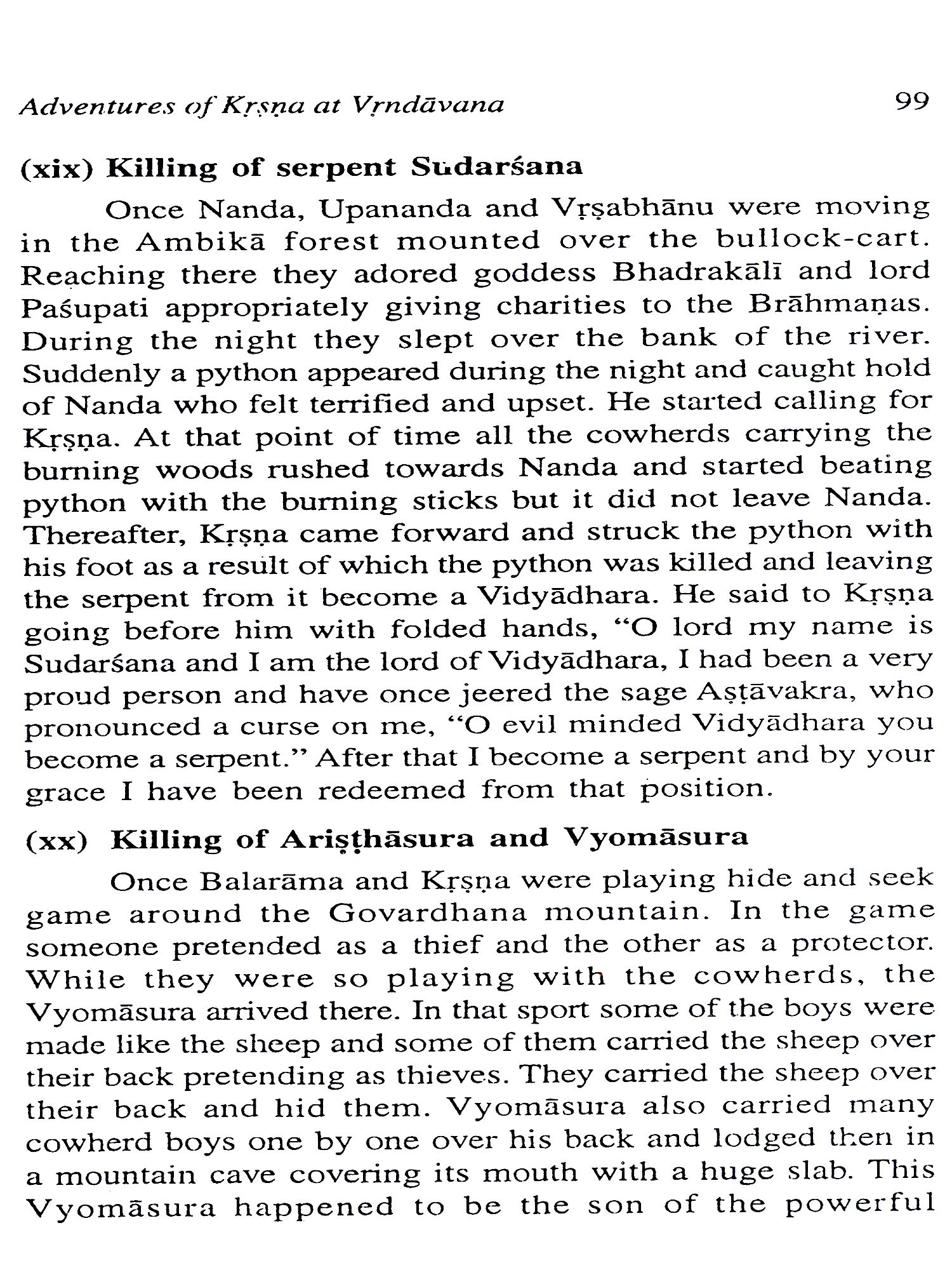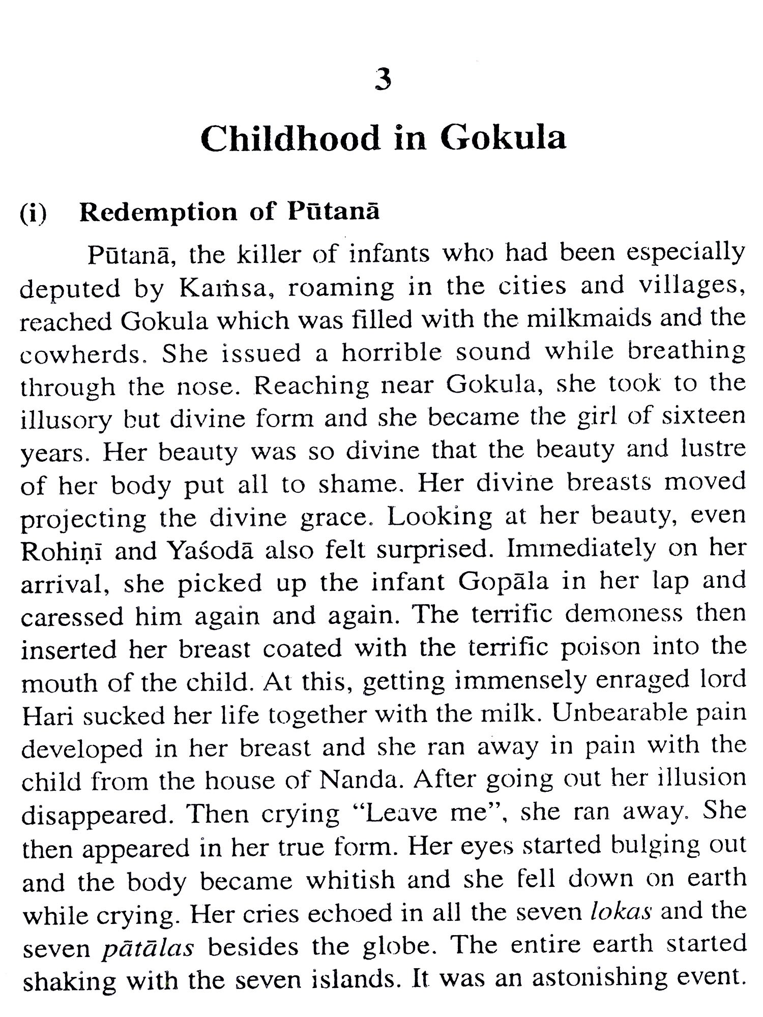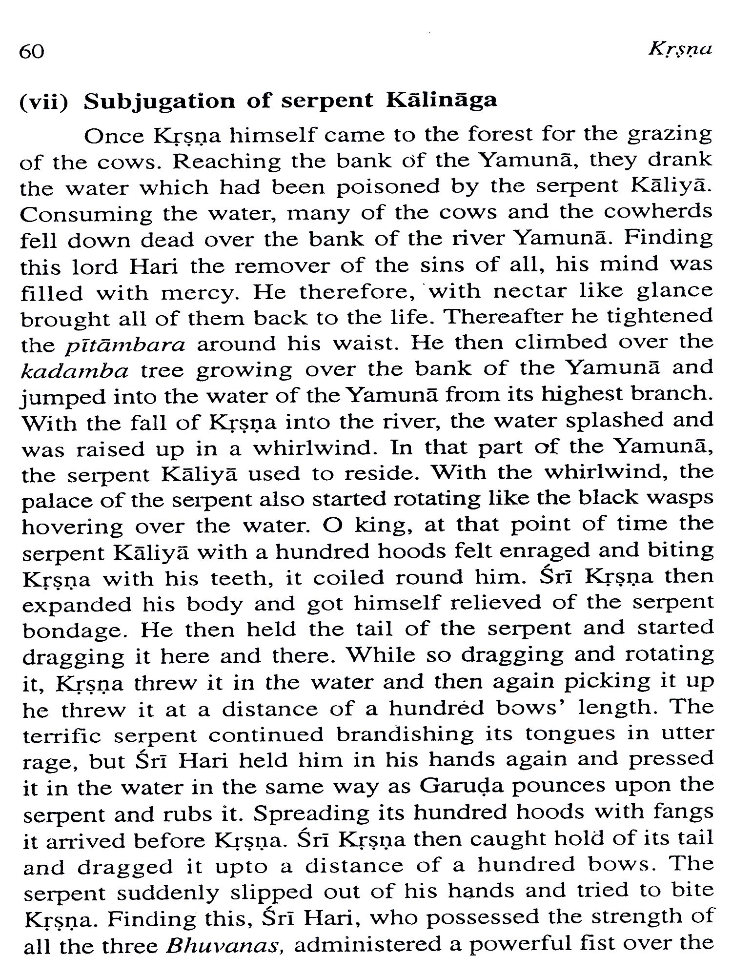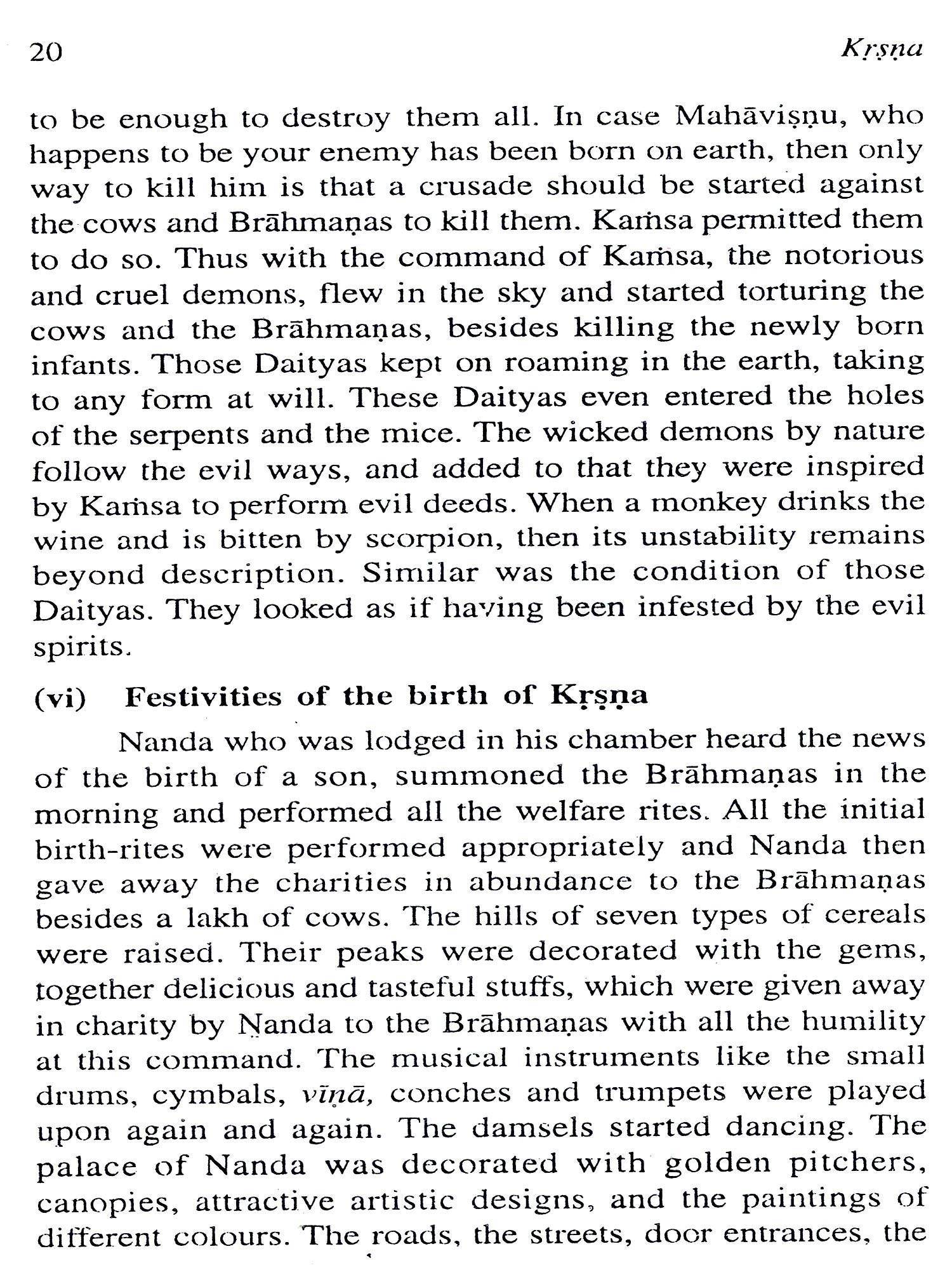 Krsna is belived to be the eighth incarnation of Visnu, who had been dominating the entire epic of Mahabharata. there is an enormous literature on Krsna, which highlights his life and events connected therewith. His popularity is still a living faith with Indian masses. His full personality is exhibited in the Puranas, more particularly in the Bhagavata and others. The work provides the glimpses of his life in brief in an interesting manner.