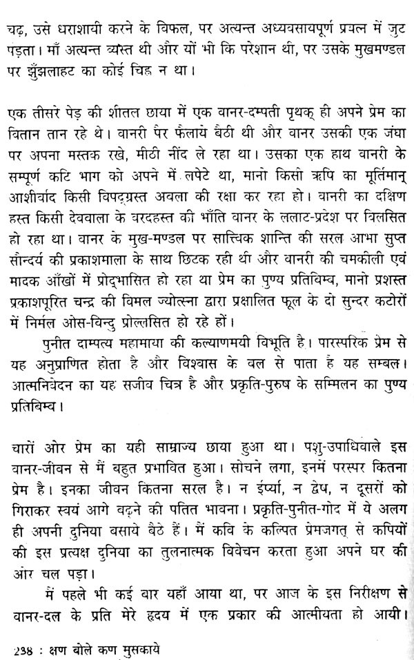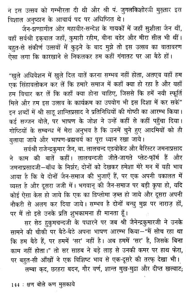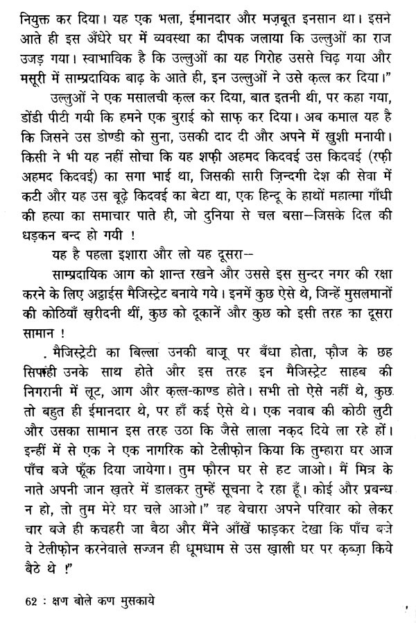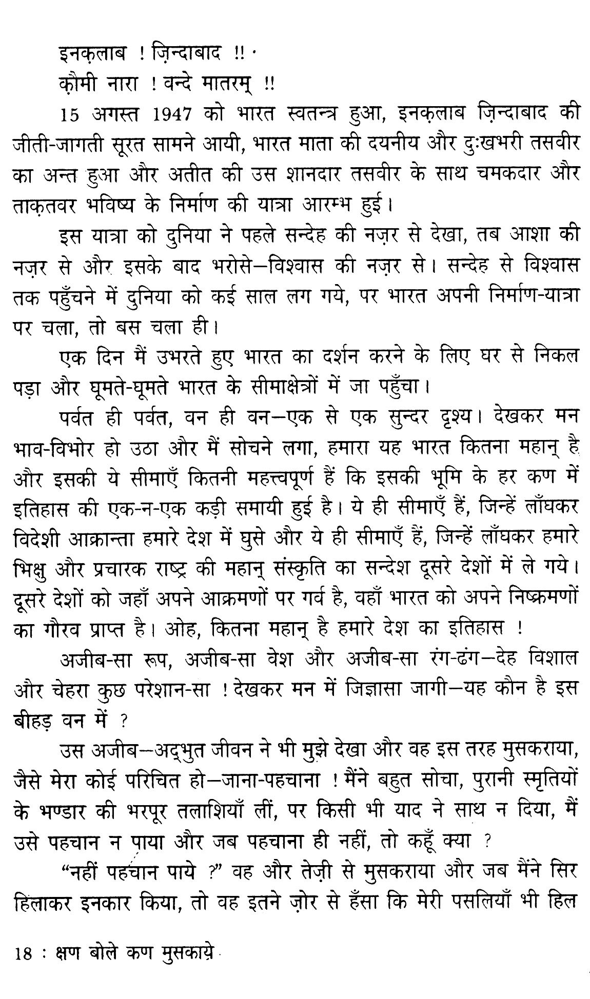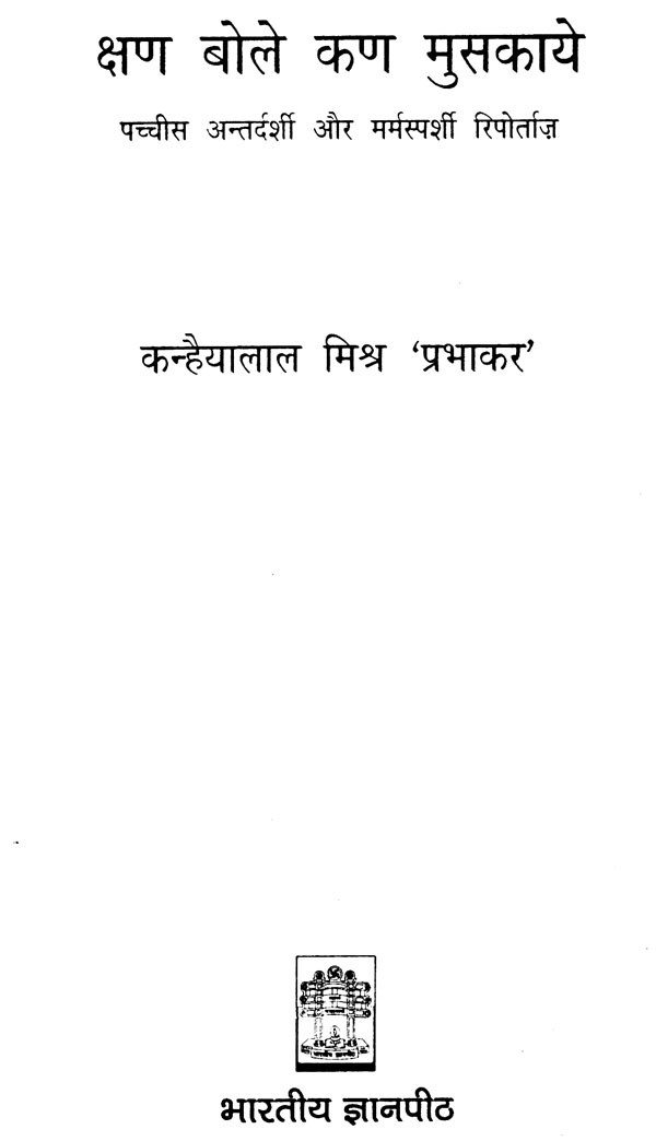 'प्रभाकर' जी की कृतियों में उनकी चिन्तन-प्रक्रिया और लेखन-शैली के कारण साहित्य और पत्रकारिता का अनुपम संगम है। उनके रिपोर्ताज़ तो और भी अधिक अन्तर्दर्शी और मर्मस्पर्शी होते हैं। प्रस्तुत पुस्तक 'क्षण बोले कण मुसकाये' में ऐसे ही पच्चीस रिपोर्ताज़ हैं जिनमें हम विगत वर्षों में घटित कुछेक घटनाओं के आधार पर राष्ट्र एवं लोक-जीवन की झाँकी पूरे आनन्द एवं तल्लीनता के साथ देख सकते हैं।