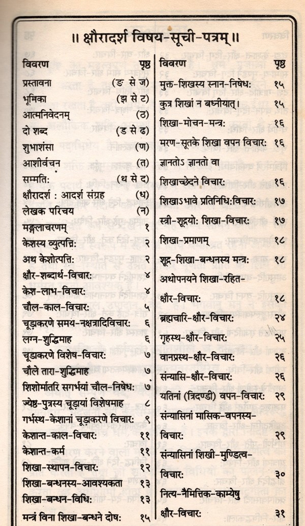 पैत्रं दैवमिति ख्यातं कर्म क्षौरशिखाश्रितम् सफलं, निष्फलं, लोके तस्मात्त‌द्विधिबोधने, क्षौरादर्शः प्रशस्तोऽयं श्रीपित्रा लिखितो, बलरामेण मया संक्षिप्य देववाण्या निगद्यते क्षौरादर्शे केशव्युत्पत्युत्त्पत्तिविचारपूर्वकं चूडाकरणविचारे प्रथमं चॉलक्षौरयोर्भेदो दर्शितः। यत्र वैदिकं मुण्डनं तदेव चौलपदने ग्राह्यम् । क्षौरं तु मुखादिप्रसाधनाद्यर्थं विधीयते। सगर्भायाः ऋतुमत्याः सूतिकायाश्च मातुः सूनोश्चौलकरणं निषिद्धम् । ज्येष्ठापत्यस्य चौलकर्म ज्येष्ठे मार्गशीर्षे तथाच अधिमासे जन्ममासे जन्मनक्षत्रे सर्वेषां चौलकरणं निषिध्यते शास्त्रकारैः । चूडाकरणविचारे गर्भस्थकेशेषु शिरसः सर्ववपनं निषिद्धमस्ति । कुलाचार परम्परया एका द्वे तिस्स्रश्वतस्त्रः पञ्च वा शिखा रक्षणीया भवन्ति। षोडशवर्षे क्रियमाणे केशान्तसंस्कारेऽपि शिखास्थापनं विहितमस्ति। शिखां विना क्रियमाणं किमपि दैवं पैतृकं कर्म निष्फलायते।