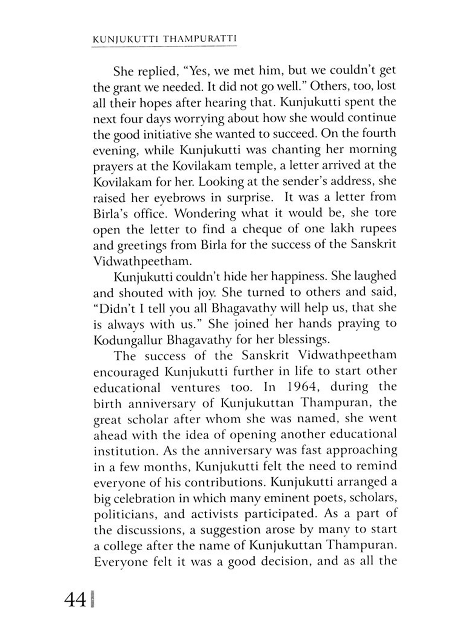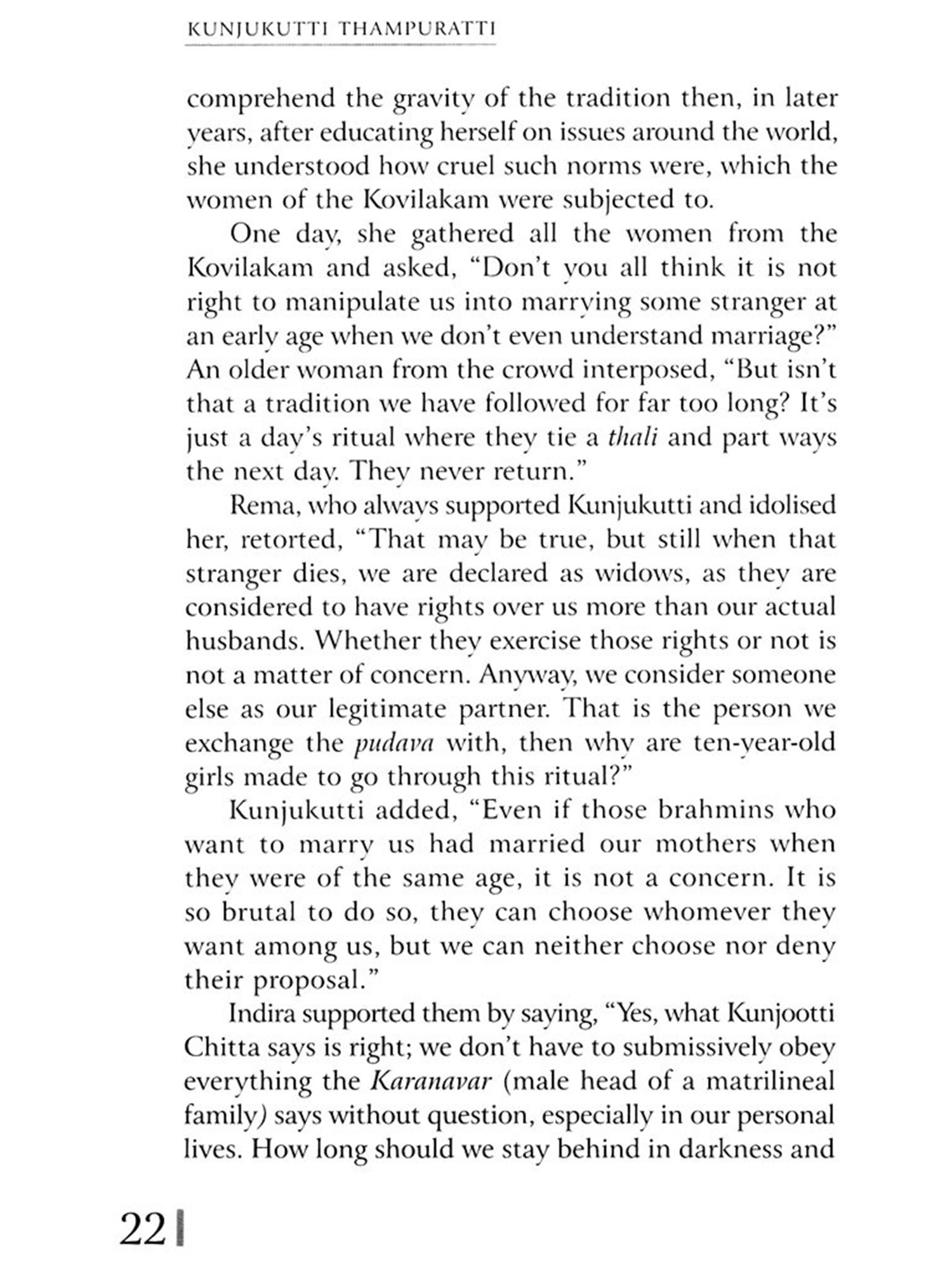 The monograph talks about Kunjukutti Thampuratti who lived in a generation where she had to fight for an individual's fundamental rights to begin with. Her participation in Kerala's social and gender reform can be easily read as one of the most active episodes in Kerala's contribution to the Indian National Movement. The social changes she brought forth in the Kodungallur district of Kerala greatly benefited in eradicating the caste and gender disparities and helped empower women. This happened when India was only taking her primary steps in eliminating caste and gender barriers in all walks of life. Her story has all the motivation that young India needs to understand and get inspired.