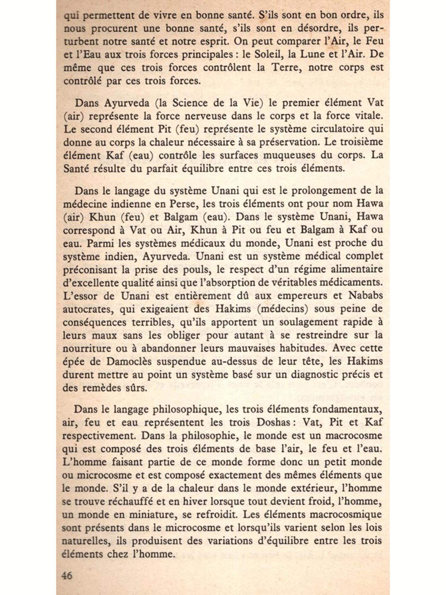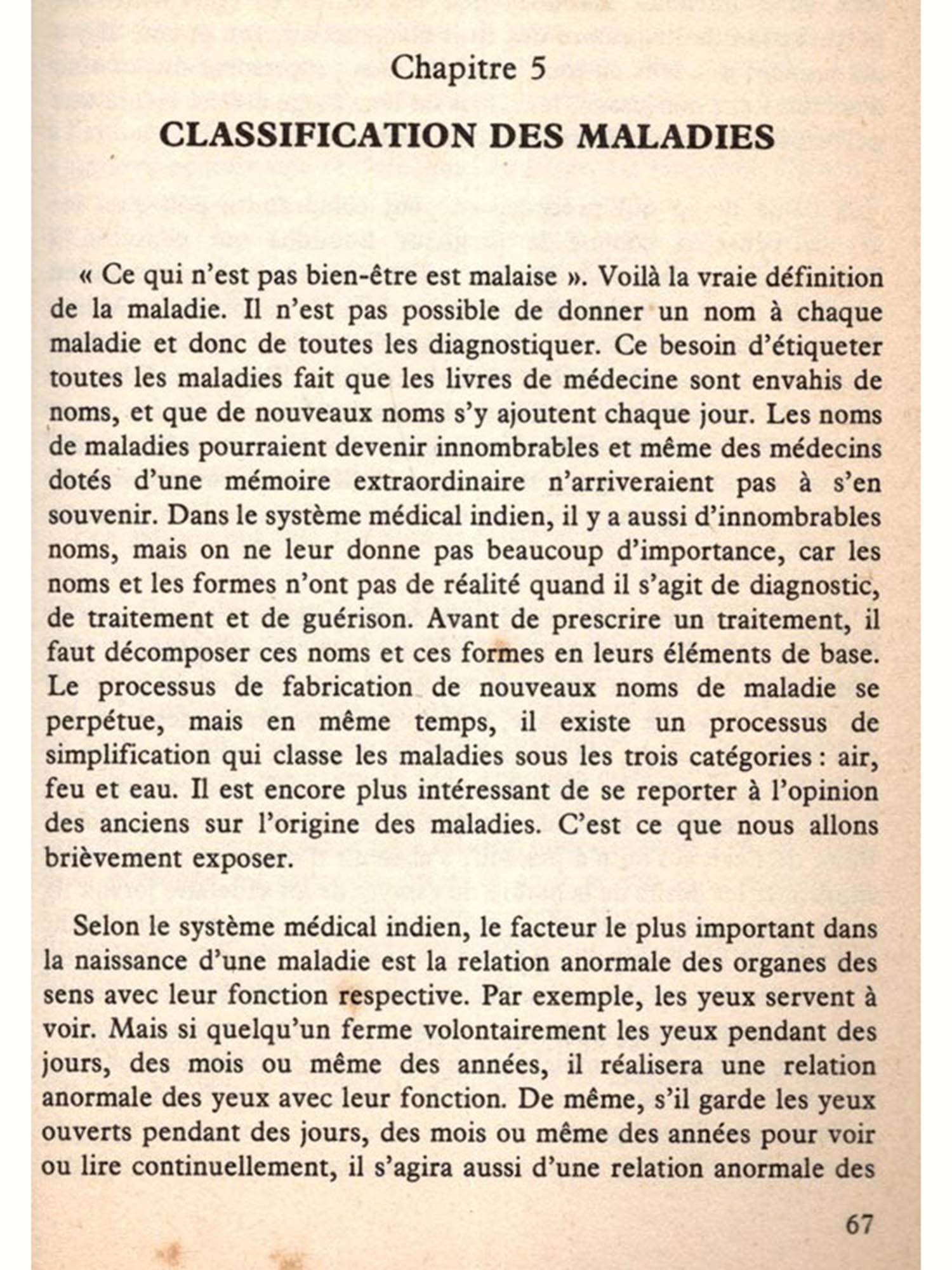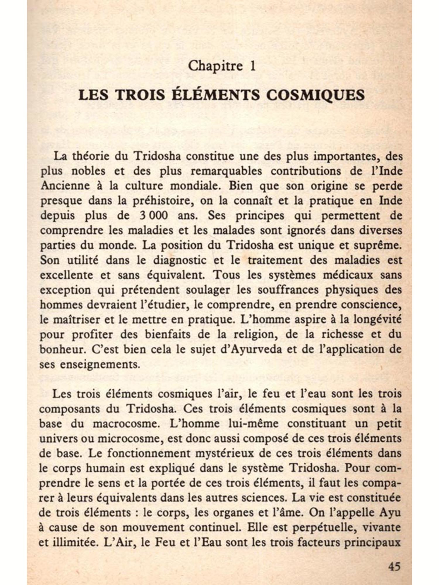 Les lecteurs ont de la chance que ce sujet peu connu du Tridosha leur soit présenté pour la première fois par celui qui est le plus compétent pour le faire. C'est l'auteur lui-même qui a souhaité que ce livre soit de cette taille; il a aussi décidé lui-même de limiter le sujet. C'est en effet intentionnellement que ce livre est peu épais et qu'il ne contient pas d'anecdotes. Nous pensons que pour la préparation de cet écrit, l'auteur a été guidé par l'observation d'autres ouvrages semblables publiés dans son pays. Ces méthodes ont probablement été suivies par les anciens auteurs lorsqu'ils préparaient les vieux aphorismes des Upanishads. Toute considération tendant à approfondir le sujet, des commentaires par exemple, pourront être publiés dans l'avenir.