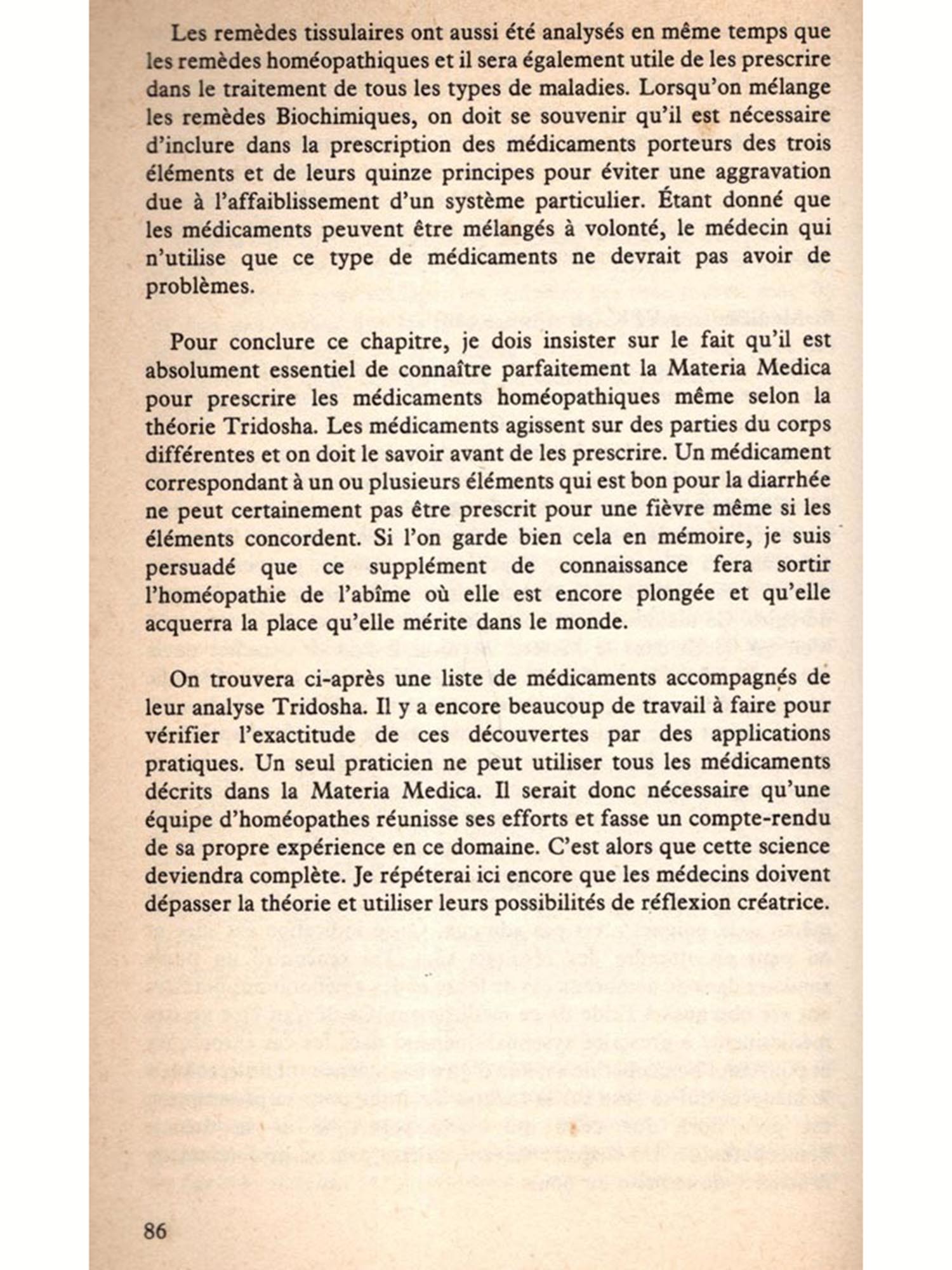 Il est cependant nécessaire que la méthode critique de Tridosha soit appliquée à l'homéopathie et on doit faire une tentative en ce sens, aussi faible soit-elle. L'homéopathie est le seul système dynamique de médecine à la disposition de l'humanité, grâce au génie de son inventeur Samuel Hahnemann. Mais son application selon la loi de similitude dépasse les capacités du généraliste même le plus hautement qualifié. Or si l'on veut que ce système dynamique soit utilisé à son maximum d'efficacité, il est absolument nécessaire que les méthodes du Tridosha soient appliquées à l'homéopathie pour le bien de l'humanité toute entière. Il est devenu urgent et nécessaire que les grossières méthodes de guérison actuelles cèdent la place à une méthode plus noble, plus humaine et plus douce. On peut en effet apporter la guérison en utilisant un système légèrement modifié qui applique les principes du Tridosha à la science et à la pratique de l'homéopathie.