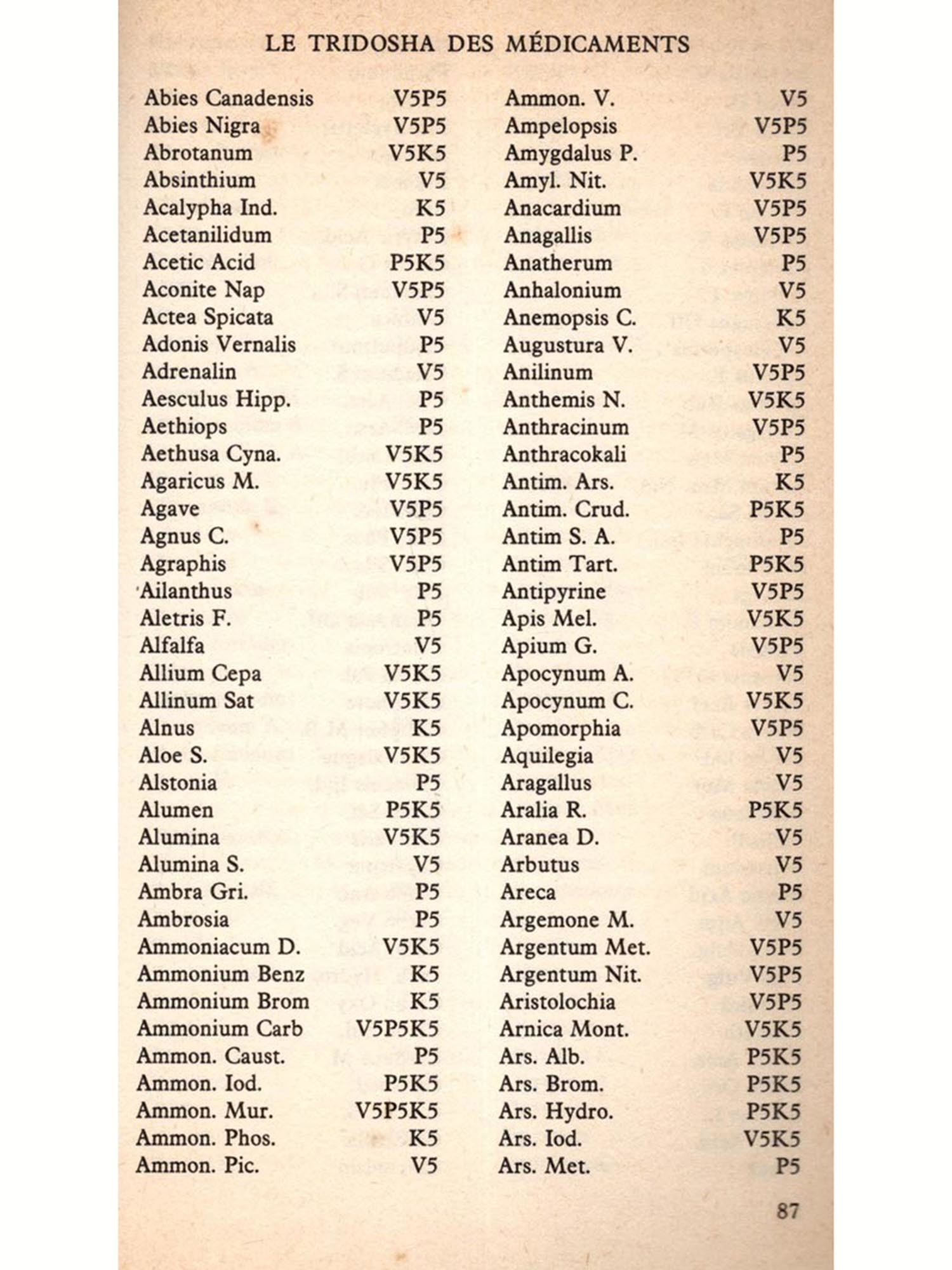 Lorsqu'on applique Tridosha à l'homéopathie, la première chose à faire est de classer les médicaments sous les trois rubriques: Air, Feu et Eau. Après avoir fait cette classification, on connaîtra les diverses sortes de pouvoirs inhérents aux remèdes homéopathiques. Il sera alors possible de savoir quels médicaments ont le pouvoir de calmer les maladies dues au dérèglement de l'un ou l'autre des trois éléments cosmiques. Une fois le Tridosha des médicaments et des maladies compris, la prescription deviendra un travail mécanique de correspondance des éléments et la guérison suivra avec une précision mathématique.
