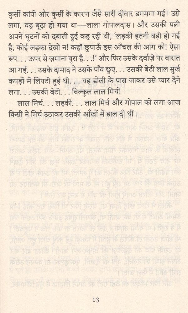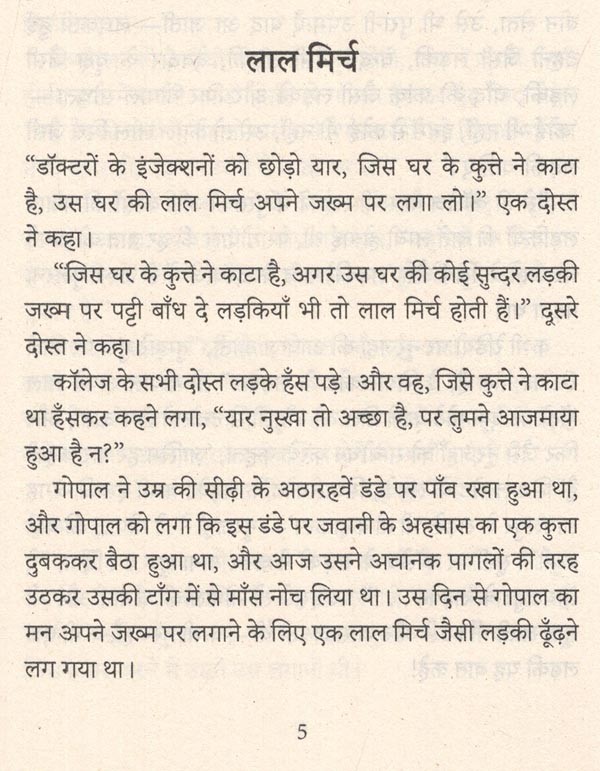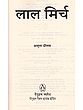 अमृता प्रीतम की लाल मिर्च एक ऐसे लड़के गोपाल की कहानी है, जो अपने लिए दुनिया से हटकर लड़की चाहता है। गोपाल लड़कियों को ऐसे देखता जैसे थाली में दाल को बीना जाता है। छोटे कद की, मोटी, बैठी हुए नाक वाली, लम्बी, गोल... और जब ऐसी लड़कियों को वह दाल में से पत्थरों की तरह बीन लेता, उसे सभी पुरानी उपमाएँ याद आ जातीं - लचकती हुई टहनी जैसी लड़की, चन्दन जैसी लड़की, देवदार के वृक्ष जैसी लड़की, चाँद की फाँक जैसी लड़की... और फिर गोपाल सोचता है - कोई नहीं, इनमें से कोई भी नहीं, उसे तो केवल लाल मिर्च जैसी लड़की चाहिए।