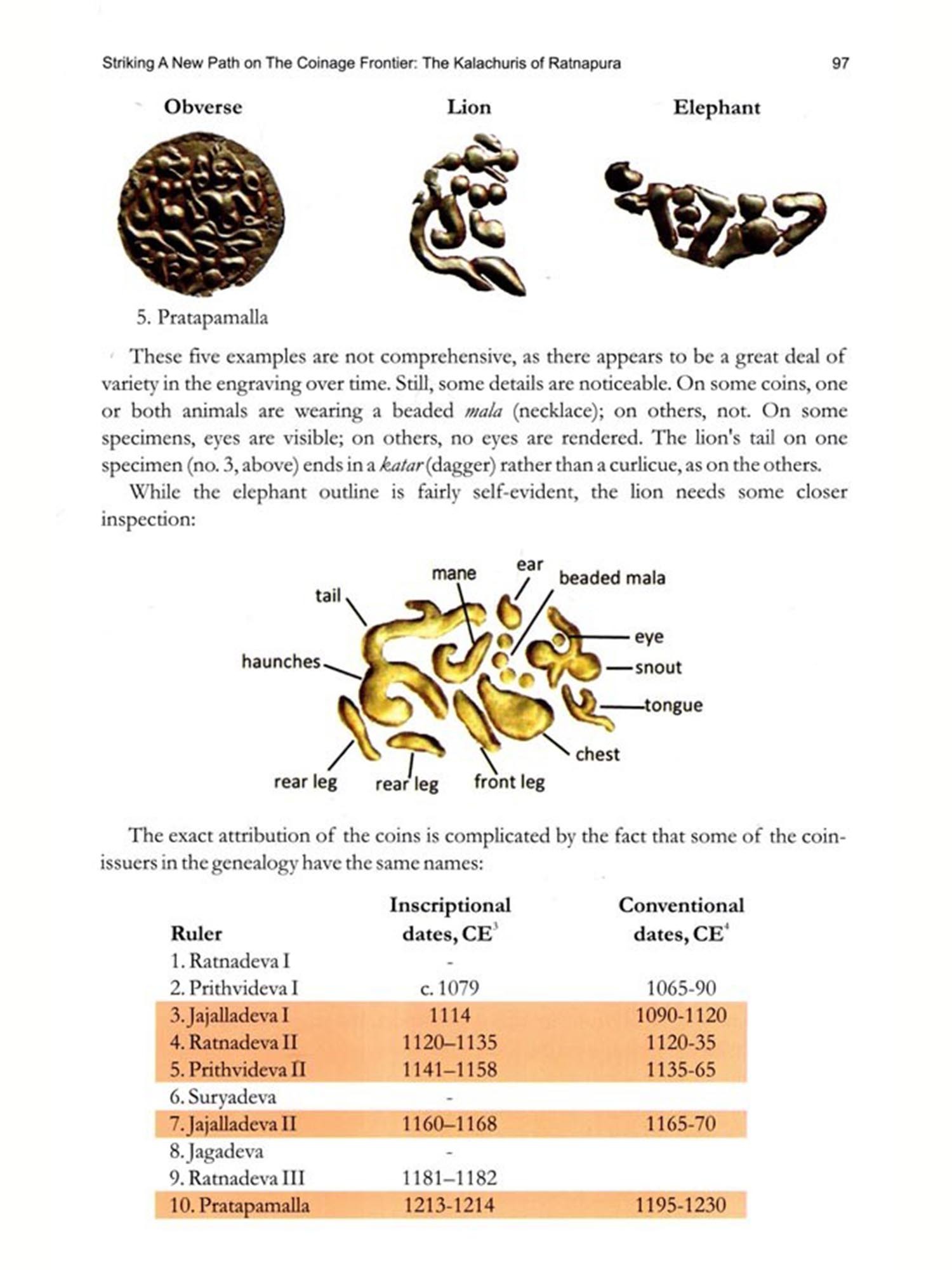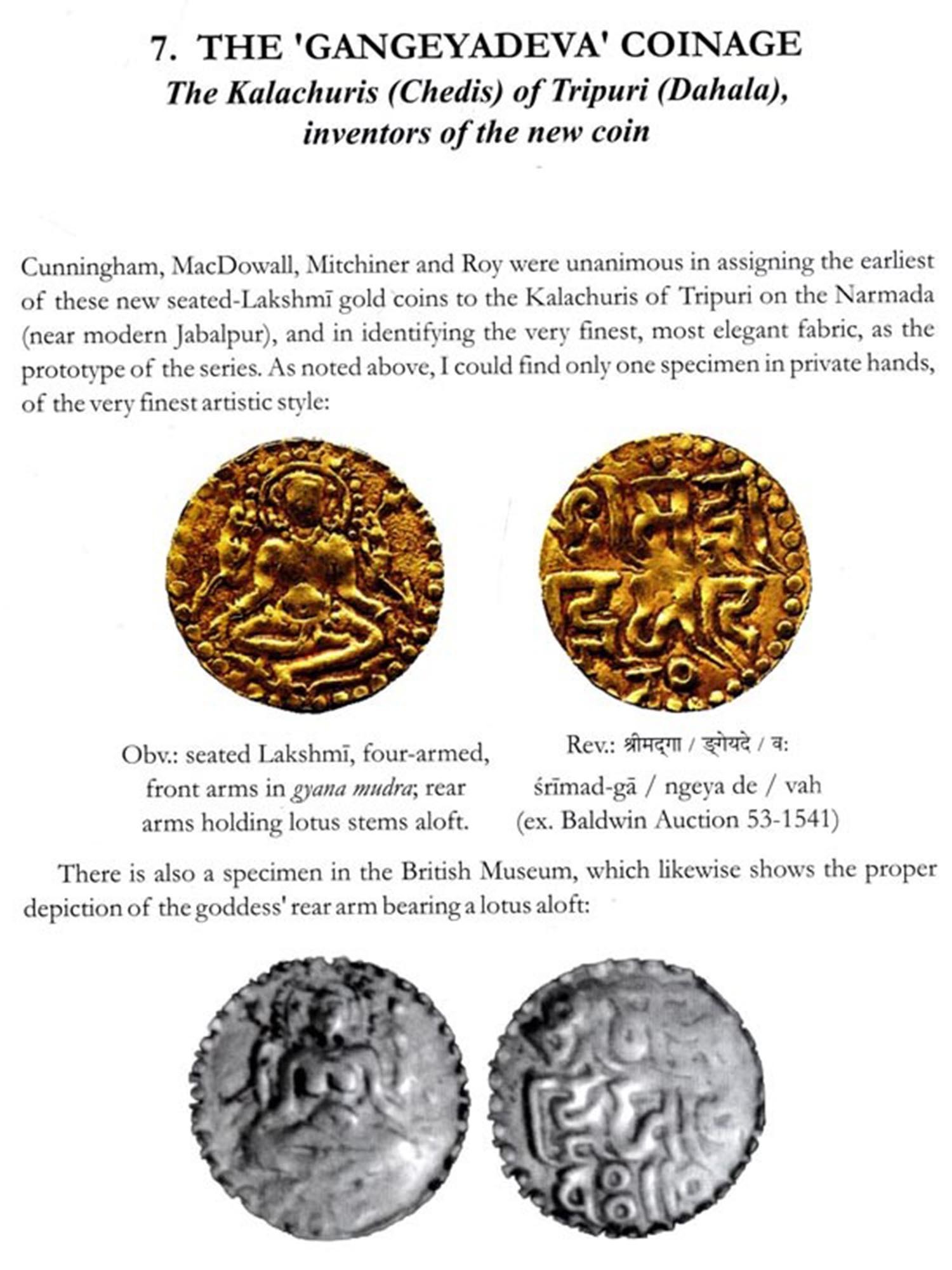 As might be expected for such a significant and highly-visible coinage series, there is a long and rich literature around the seated-Lakshmi coins. As is true for many other aspects of Indian numismatics, the earliest systematic classification was published by Alexander Cunningham in the nineteenth century. Noteworthy in our time is an essay by David MacDowall proposing a typology for the Gangeyadeva coins Likewise, Michael Mitchiner illustrated many specimens of the series in historical context, in his influential catalogue." This was expanded by P.C. Roy in his review of all known issues." The series was also dealt with at length by this author." Perhaps the most perceptive analysis of the series was undertaken by Biswajeet Rath in his seminal study of the Dalmau hoard." This book will expand on some of the themes he proposed in his study.