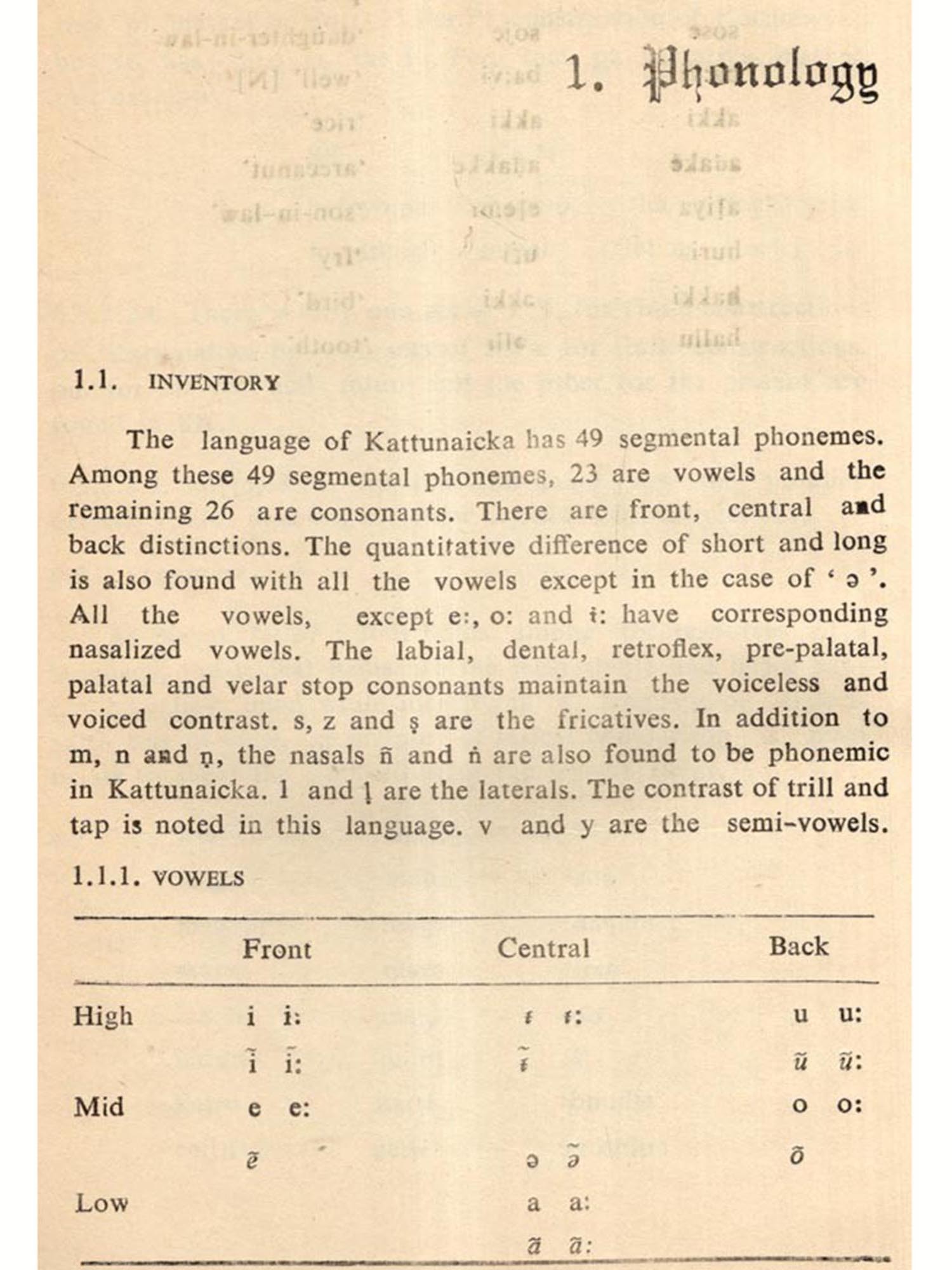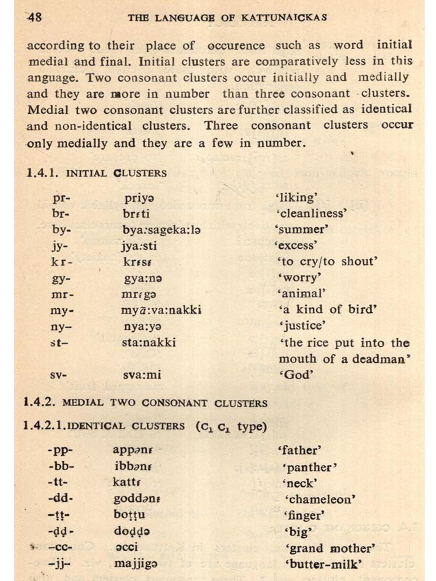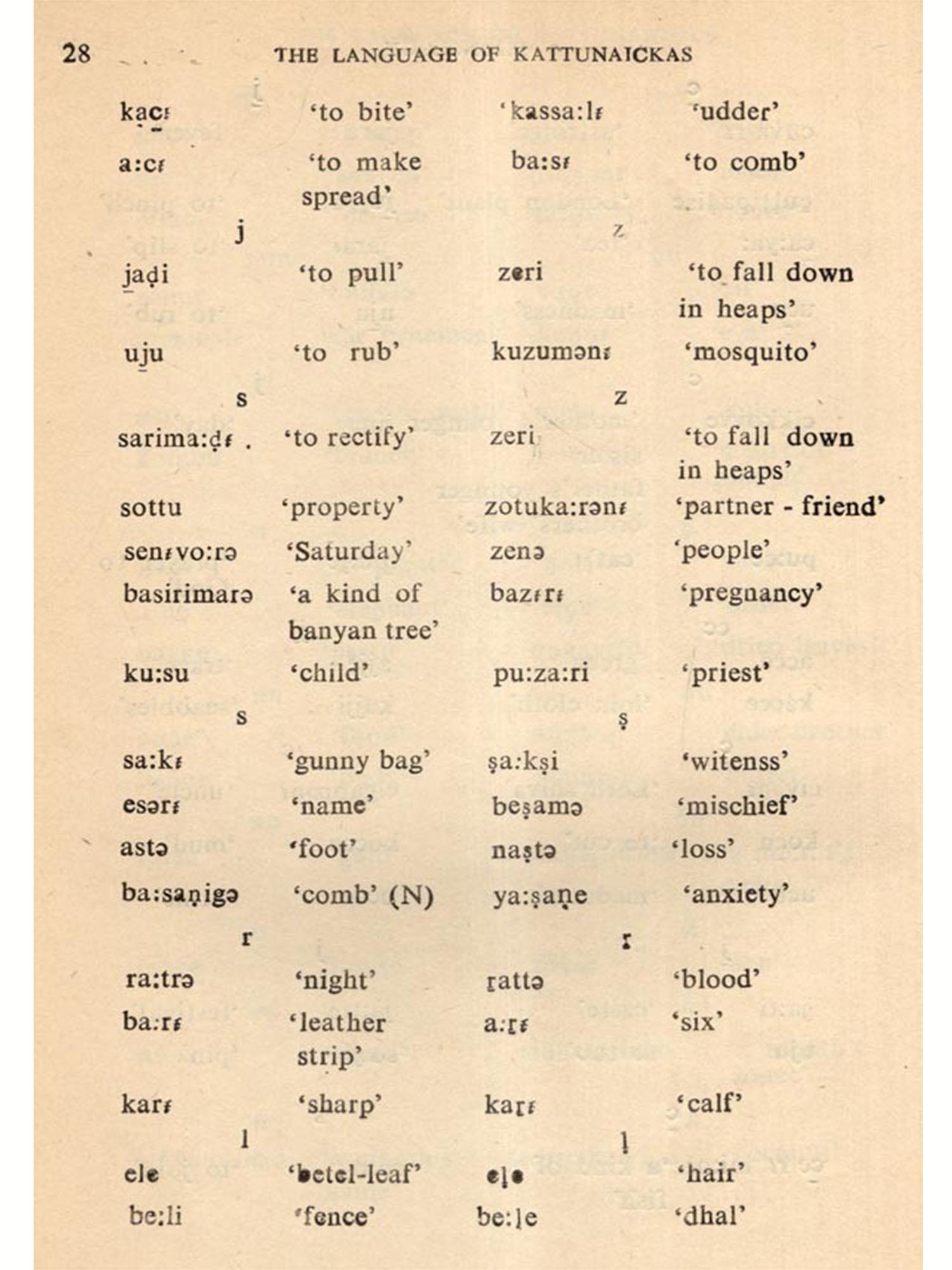 Gopalan Nair (1911:108--113) distinguishes between Jain Kurumbas and Kattunayakans; however, he states that they are identical except for that the latter eat monkey's flesh, do not collect honey and take food at the former's house whereas the former differs in these particulars. Ayyappan (1948:100--101) also holds almost the same view. Census of India 1961 has sub-divided the Kurumba tribal community into five categories viz. 1. Betta Kurumba, 2. je:nu/temu Kurumba, 3. ura:li Kurumba, 4. pa:lu/ha:lu Kurumba and 5. mullu Kurumba. E. Thurston (1909: 165) observes that Kurumbas are divided into Mullu Kurumbas, jen or tên Kurumbans (kadu or sola Nayakkans) and ura:ļi or Bet Kurumbans. The relevant point of this observation is that jen or ten Kurumbans and Kadu or Sola Nayakkans constitute one and the same tribe.