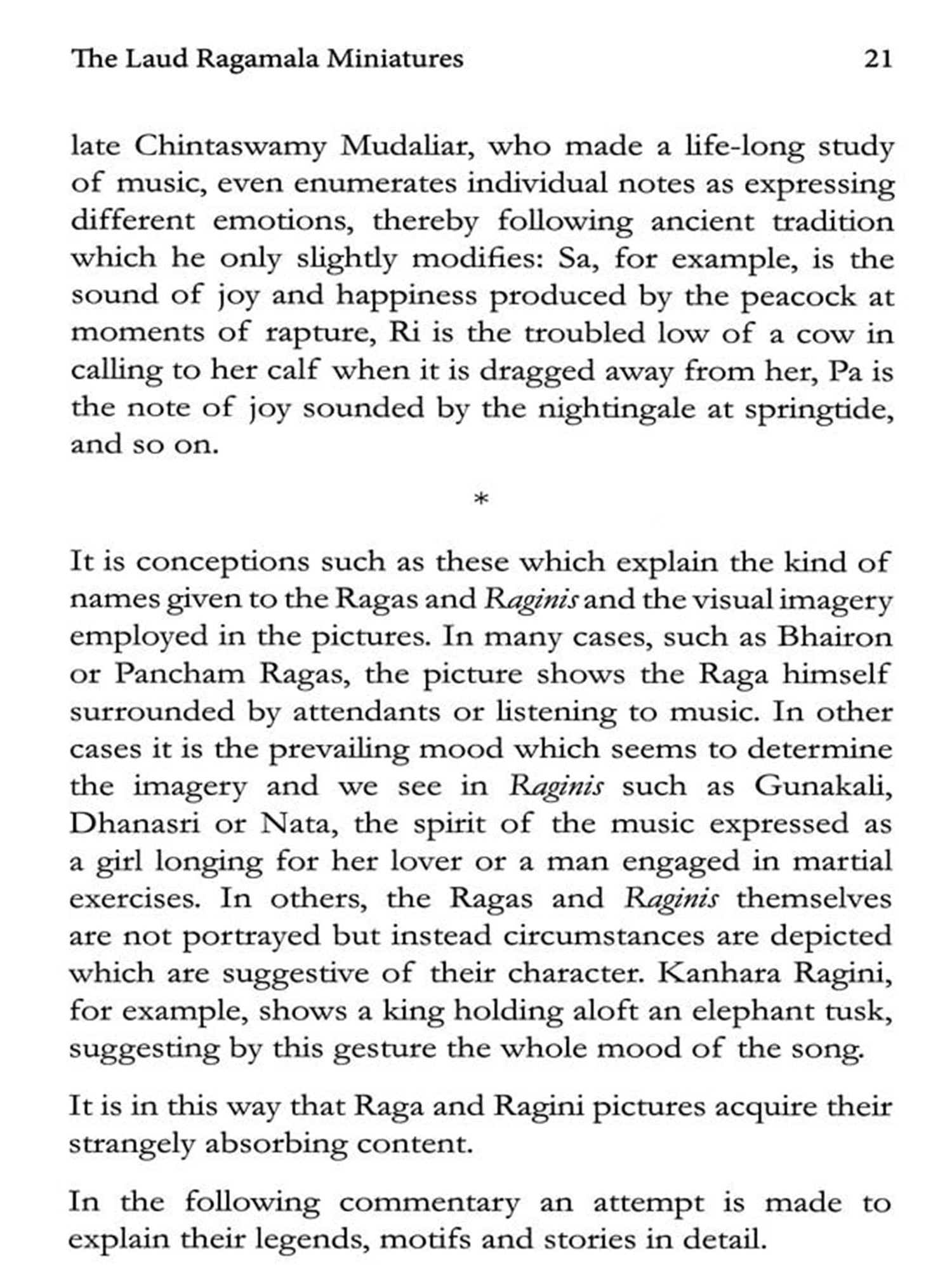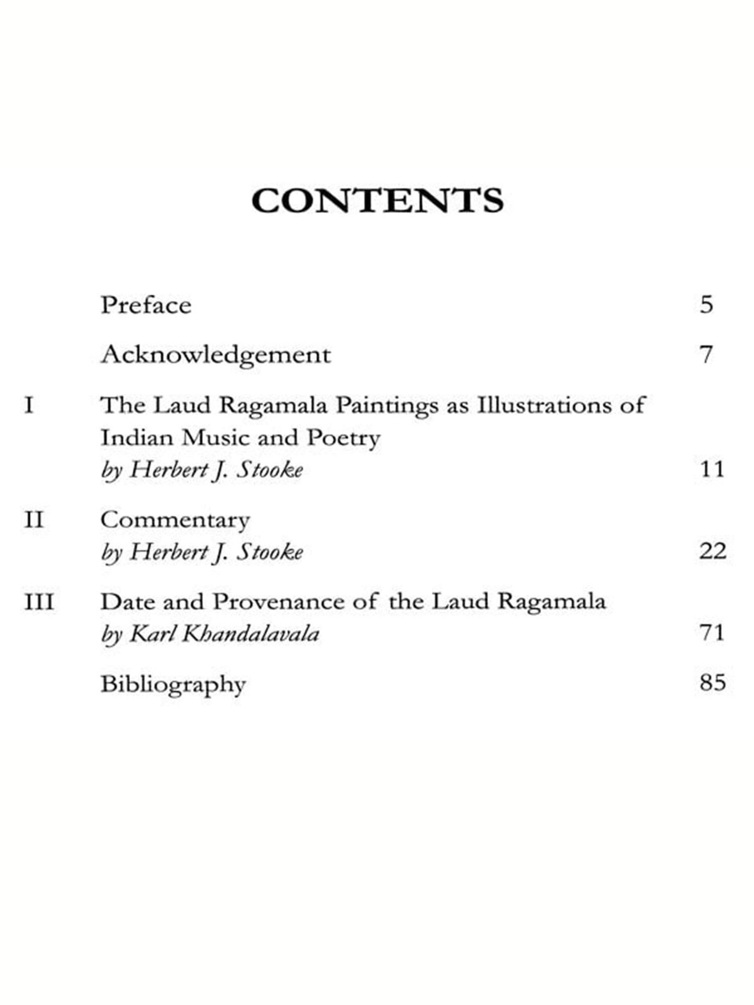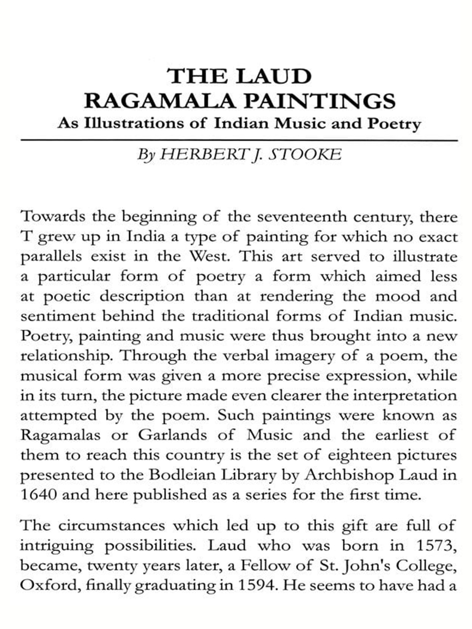 The sequence of pictures, which is here reproduced in its entirety for the first time, comprises some of the earliest Indian paintings ever to have reached this country. As such they have a special interest as important landmarks in our cultural connections. Their significance, however, goes considerably further, for in style they reveal a tradition of painting, which, if strongly influenced by the Mughals, is none the less un-Mughal in character. They thus provide important evidence of the state of Indian painting, in the early seventeenth century, in centres other than the Mughal capital. Finally, their subject matter introduces us, at an early period, to a form of expression which in its close association of poetry, music and painting is one of the most significant contributions India has made to art. To explain these special characteristics is the primary concern of Mr. Stooke to whom the credit must go for conceiving and planning this book. His work has been brilliantly supplemented by Mr. Khandalavala who brings the latest Indian research to bear on the problem of the pictures' dating and provenance.