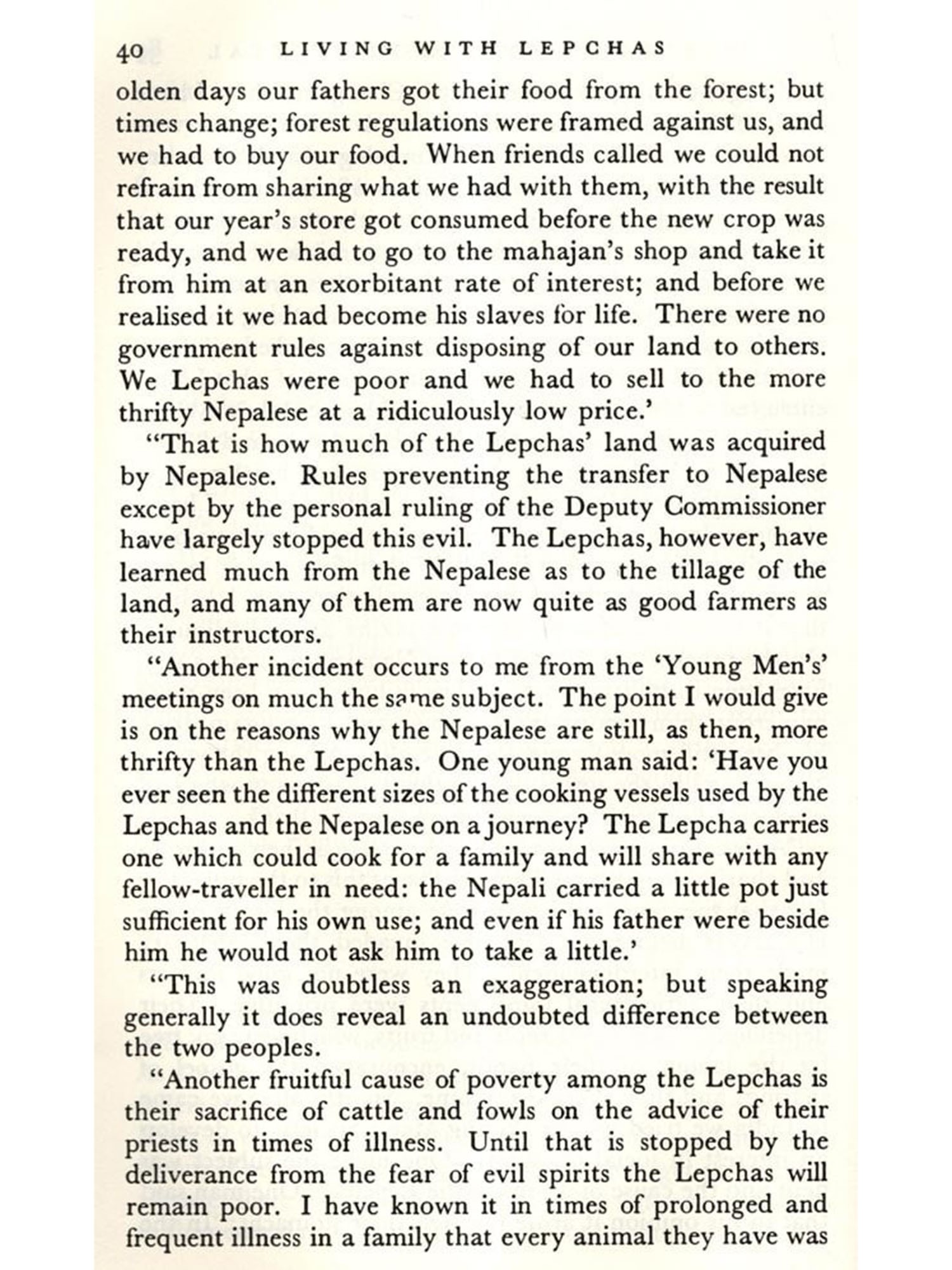 Lepcha society is organized around clans, and they live in close harmony with the environment, practicing agriculture, especially cardamom cultivation, and weaving as key occupations. Their folklore, oral traditions, and music reflect a deep reverence for the mountains, rivers, and forests. The sacred peak of Mount Kanchenjunga holds a central place in Lepcha spirituality. Despite modern influences and challenges to their culture, the Lepchas continue to preserve their distinct identity, language, and traditions in the Sikkim Himalayas.