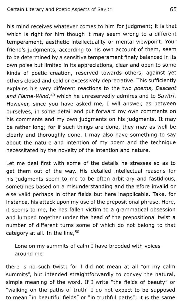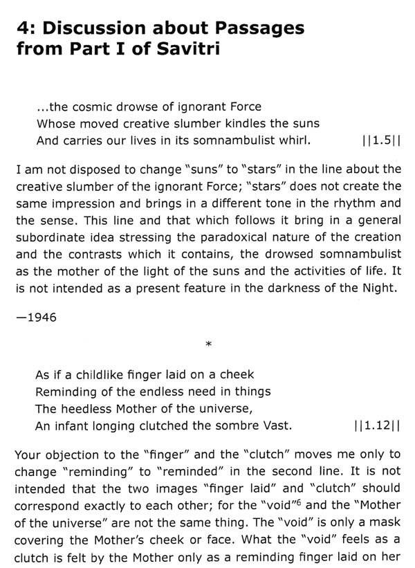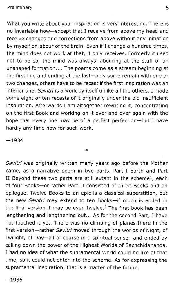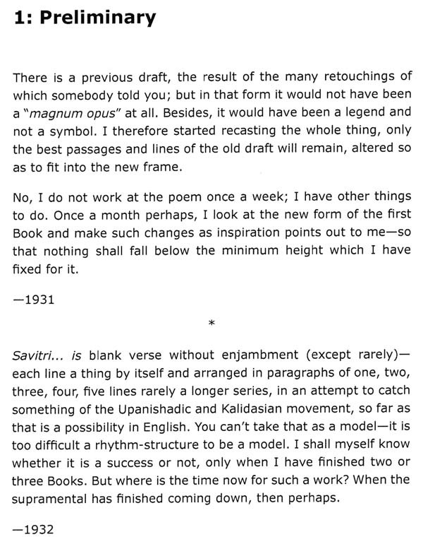 Savitri, as the footnote to the Book of Death indicates, was not completed in the common meaning of the term and indeed Sri Aurobindo's original plan was to give this part of the poem as well as the Epilogue a thorough recasting. But his strange remark suggests that later, for reasons of his own, he was not anxious about them and that what he had thought necessary had been done. So it is impossible to say definitely that he did not wish Savitri to be, on the whole, just as he had left it after making corrections and additions in the Canto already mentioned of the Book of Fate.
