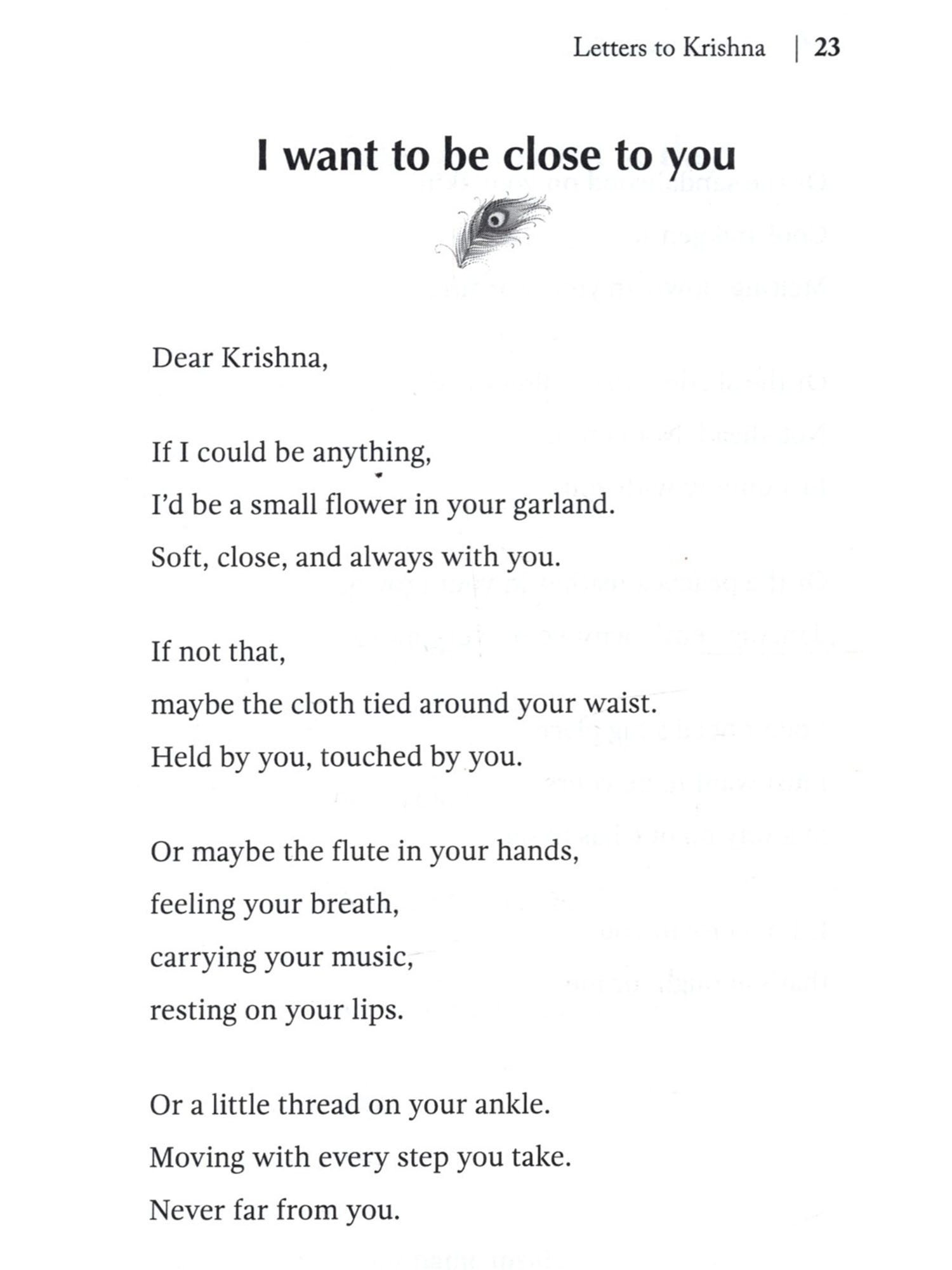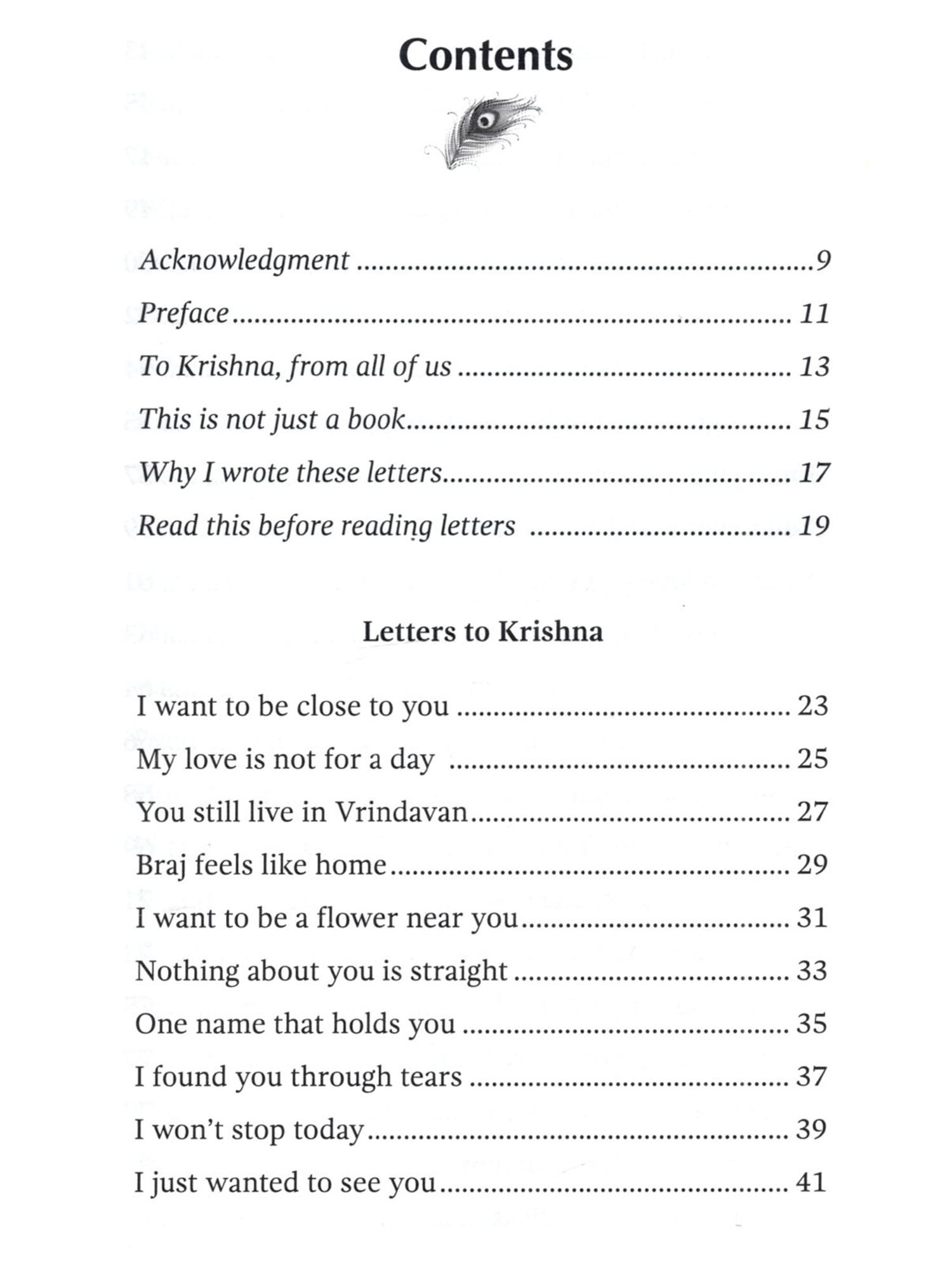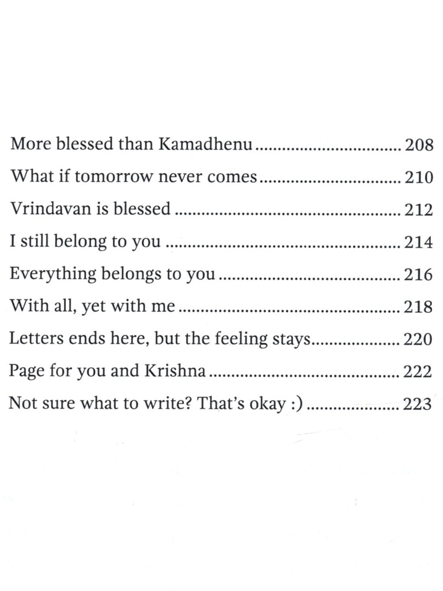 I didn't plan to write this book. There was no big goal. Just a quiet feeling inside. It didn't leave when I spoke to people. But it softened when I wrote to him. As I kept writing, I saw something. I'm not the only one who misses him. Who smiles just hearing his name. Who loves him without ever seeing him. So I kept going. Not to explain who he is. Not to say something special. Just to remember him. You won't find big words here. No heavy ideas. Just small feelings. Held together with love. These letters are not perfect. But love isn't perfect either. It falls. It waits. It doubts. And still, it keeps coming back. If you've ever loved Krishna in any way, with even a small part of your heart, I hope these pages feel like home. This is not just my book. It's yours too. It's for every heart that wants to speak. To the One who already understands.