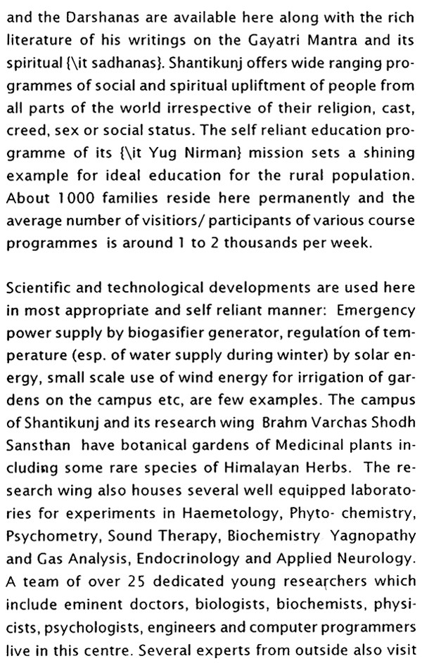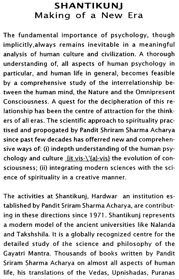 The writer Pandit Shriram Sharma Acharya of Shantikunj. Hardwar, India-an eminent saint. ascetic, humanist, social reformer, scholar, writer, futurologist, has written over 3000 books on a wide range of subjects, establishing an intercommunion of science with spirituality. The movement "Yug Nirman Yojna"- a crusade launched by him for establishing A New World Order for humankind has now become a global phenomenon. Inspired by his literature and teachings, millions of people all over the world are joining this movement irrespective of their nationality, language, colour, class, creed, religion and beliefs. Shantikunj- a unique centre of excellence established by him near Hardwar, is the only University of Spirituality in the world, where facilities for training on various aspects of yoga and allied disciplines (Science and philosophy of Gayatri, Asan, Pranayam, Meditation etc.) exist under one roof. Brolonsarchas - a well-equipped modern research laboratory associated with this institution, monitors physiological and psychological records of the sadhaks. The tests confirm enhancement of body vitality and existence to metero-biological changes as, well as resistance to invasion of otherwise lethal virus and bacteria; after practice of Yoga and Gayatri disciplines. There is absolutely' no charge for boarding, lodging, training and laboratory facilities.