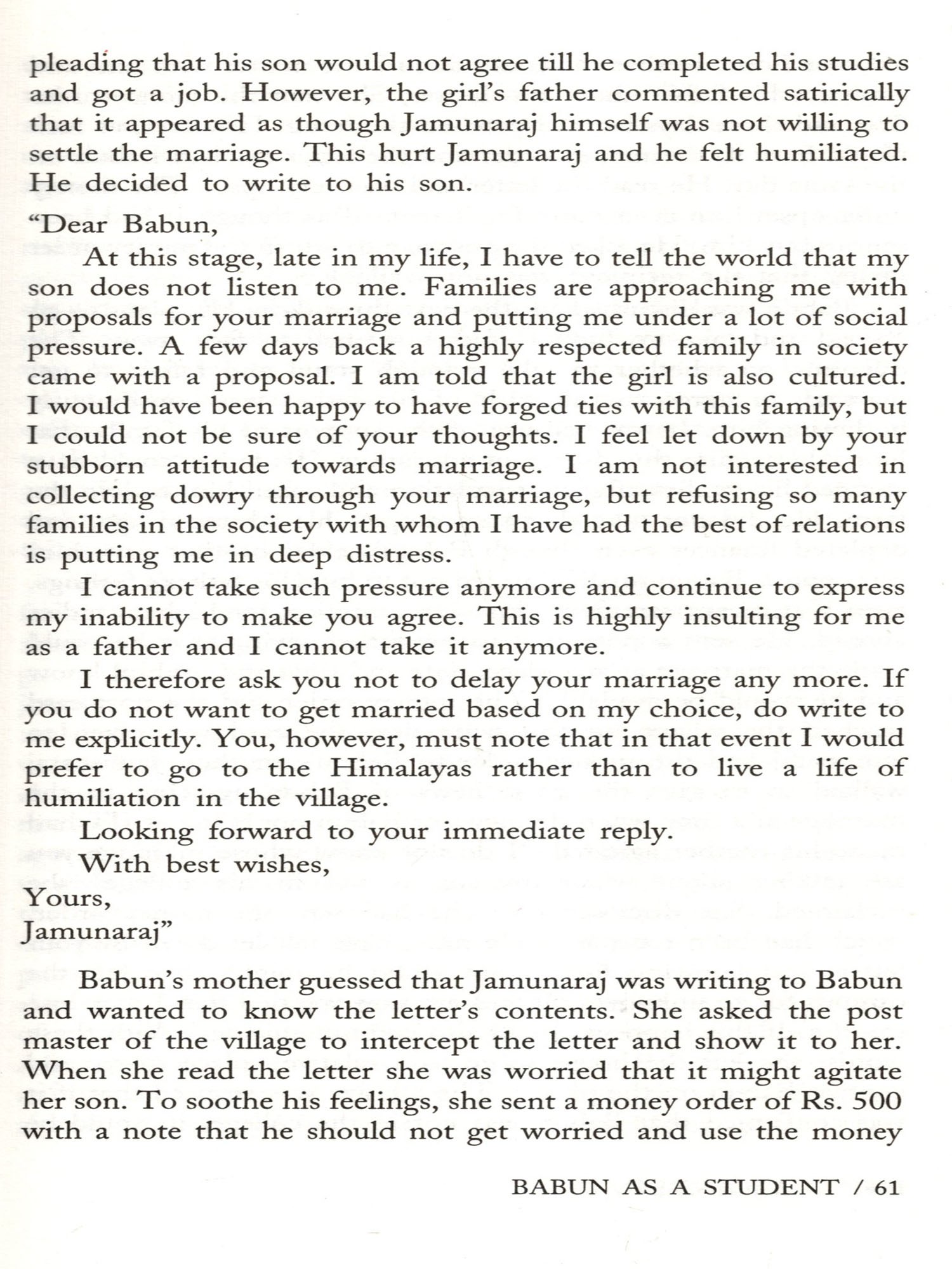 The protagonist of the story, Babun, hails from a village, which is deprived of even the basic necessities of life like roads, electricity, telephone connections, pure drinking water, or any kind of medical aid. As the last child born to a middle-aged mother in a family that is not financially well-off, Babun struggles in his childhood to chart his path in the journey of life with faith in his hard work and total devotion towards the Creator.