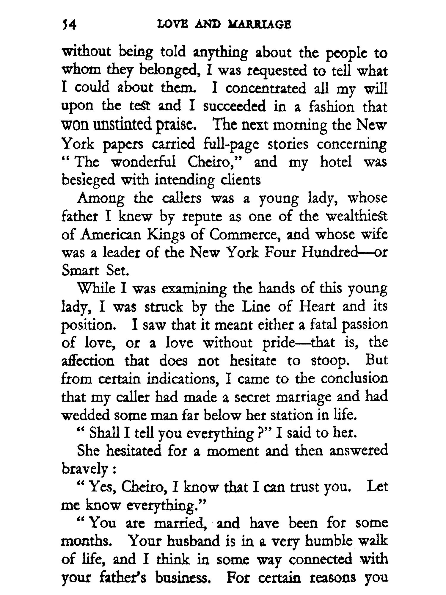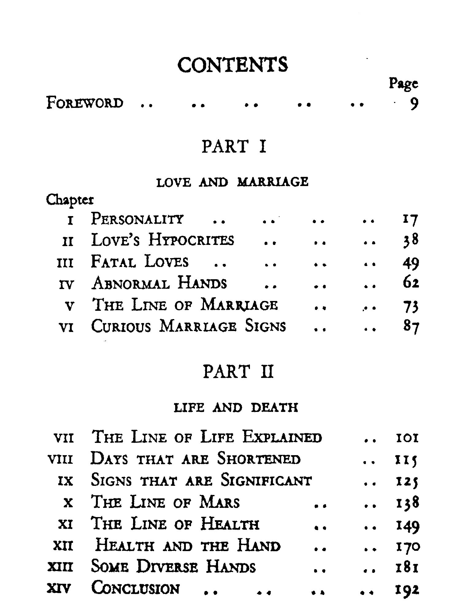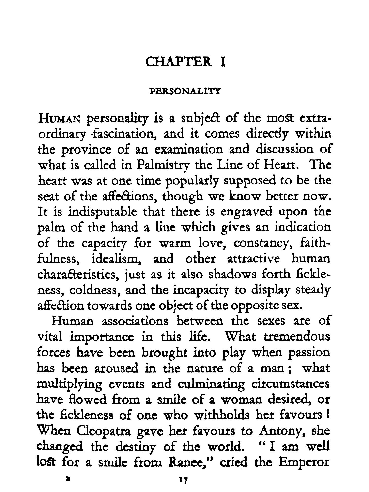 THE Success I achieved during the twenty-one years in which I was connected with this study was, I believe, chiefly owing to the fact that, although my principal study was the lines and formation of hands, yet I did not confine myself alone to that particular page in the book of Nature. I endeavoured to study every phase of thought that can throw light on human life; consequently the very ridges of the skin, the hair found on the hands, all were used, as a detective would use a clue to accumulate evidence. I found that people were sceptical of such a study principally because the subject was not presented to them in a logical manner.