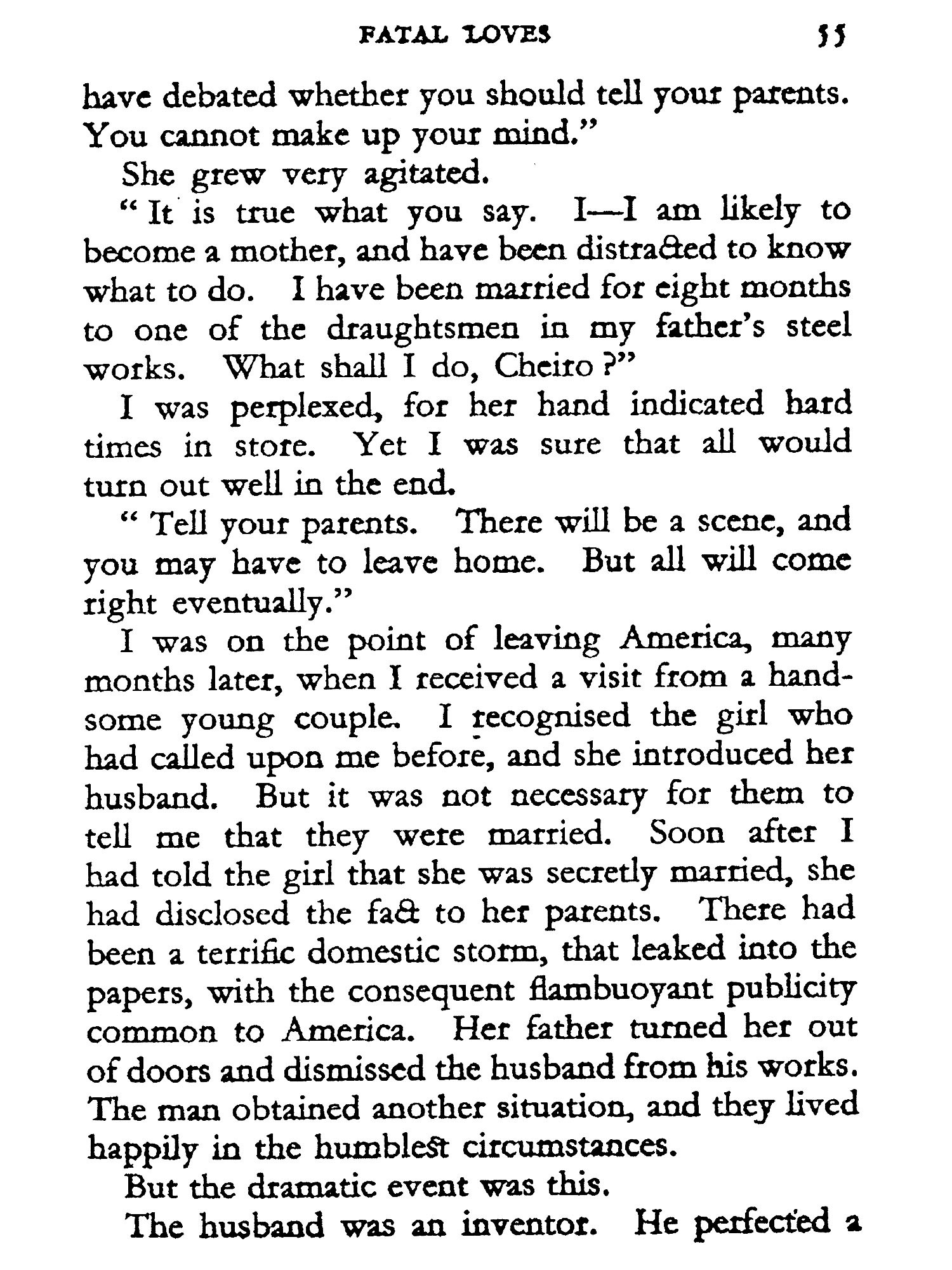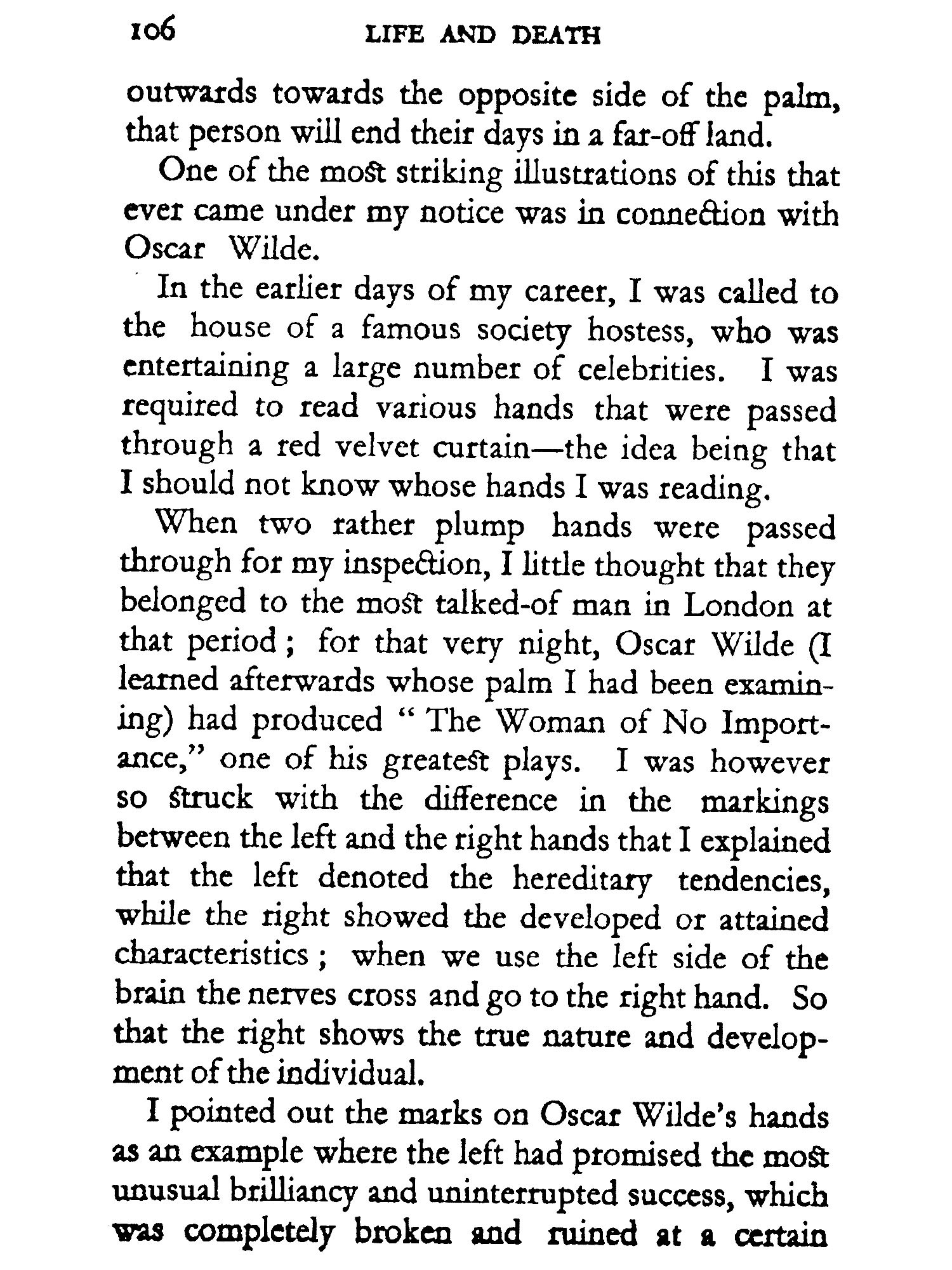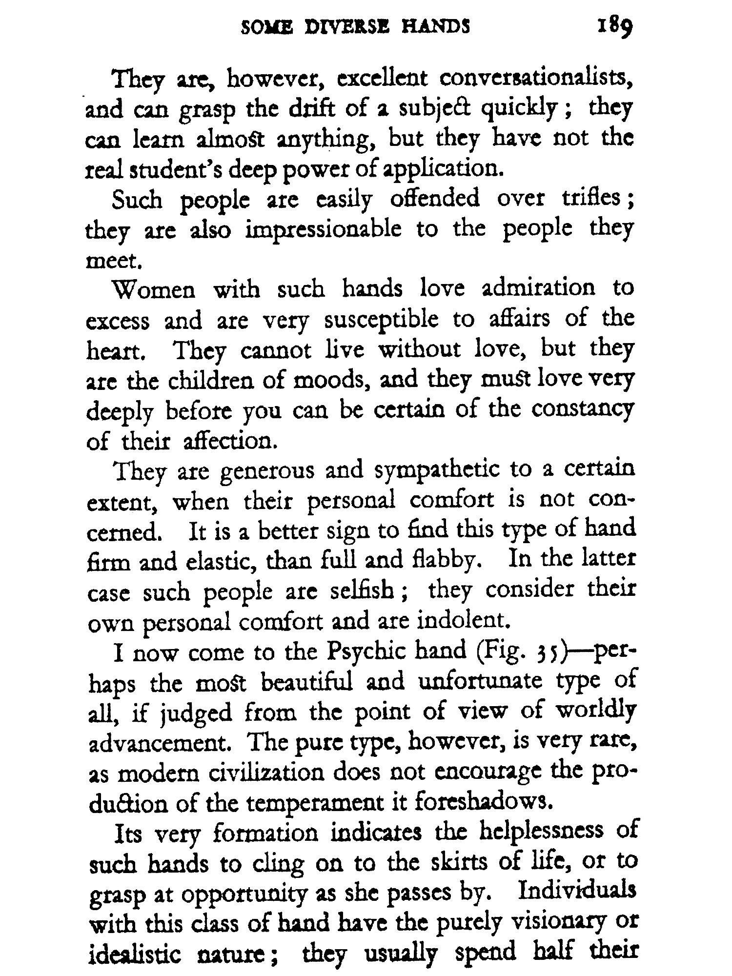 THE Success I achieved during the twenty-one years in which I was connected with this study was, I believe, chiefly owing to the fact that, although my principal study was the lines and formation of hands, yet I did not confine myself alone to that particular page in the book of Nature. I endeavoured to study every phase of thought that can throw light on human life; consequently the very ridges of the skin, the hair found on the hands, all were used, as a detective would use a clue to accumulate evidence. I found that people were sceptical of such a study principally because the subject was not presented to them in a logical manner.