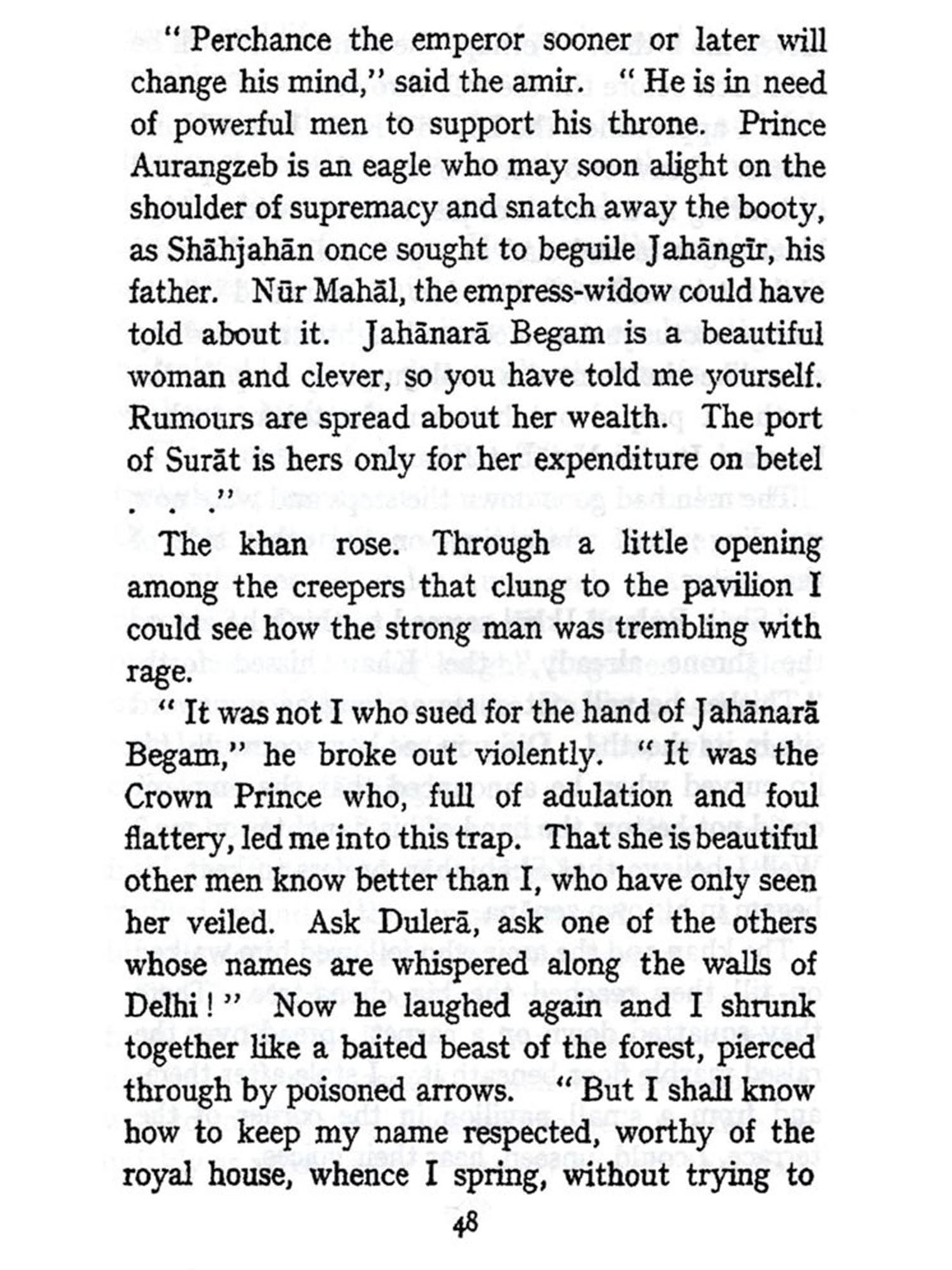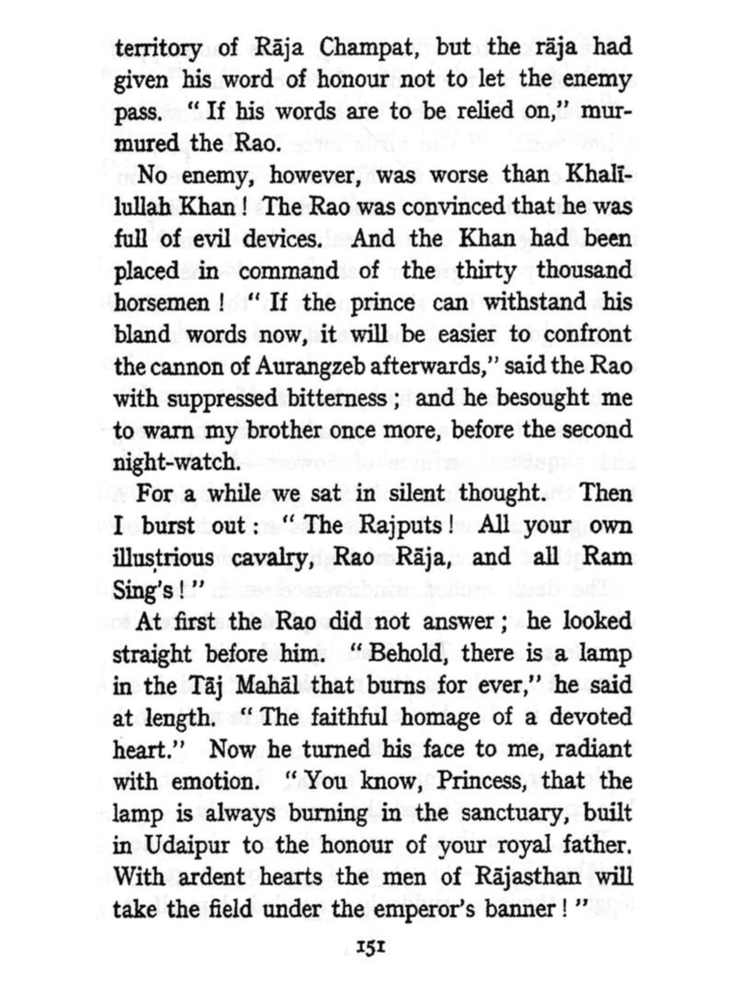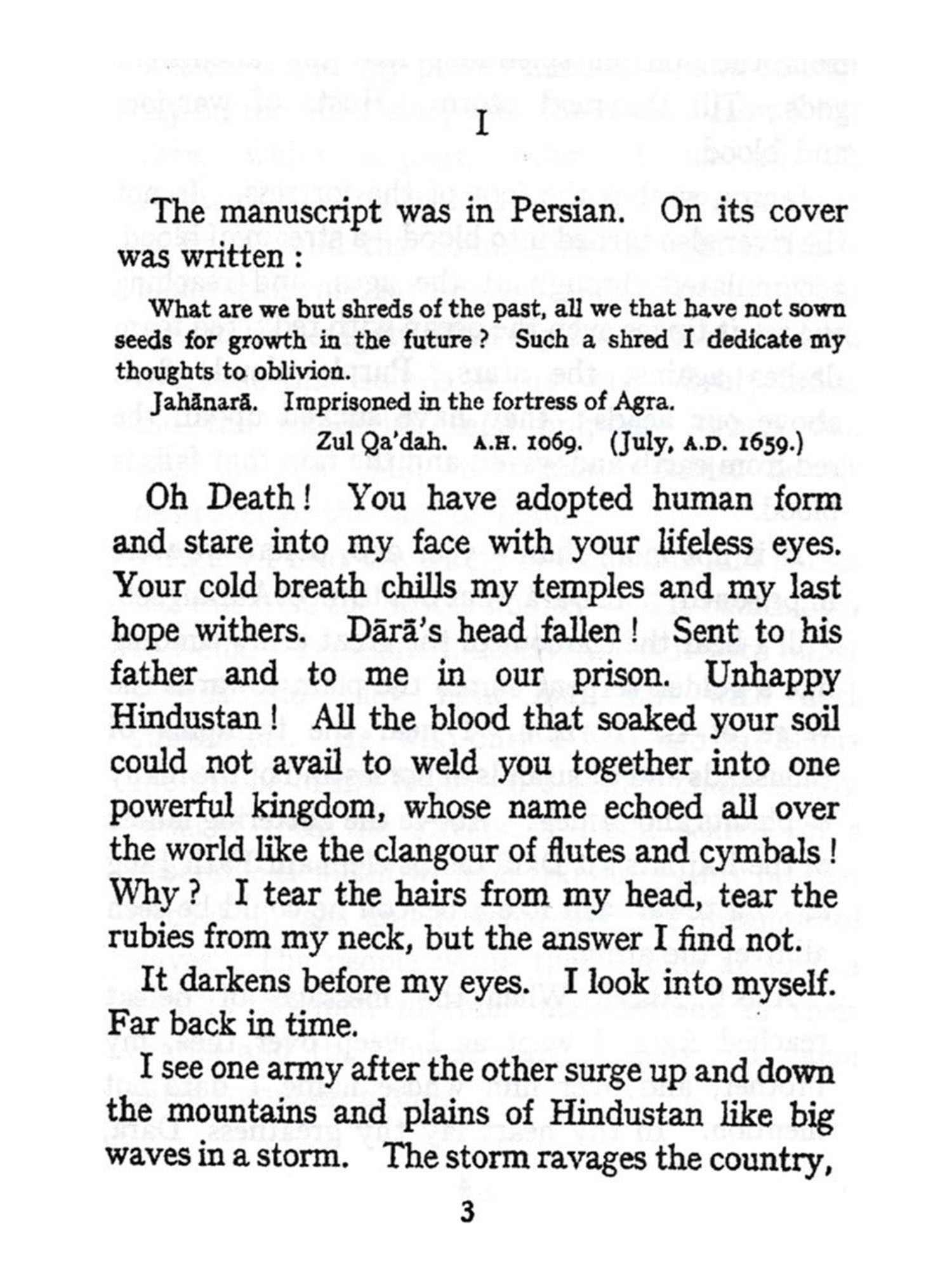 It is into the heart of this most dramatic crisis that Madame Butenschon takes us. In choosing the tragic story of Jahanara, the elder daughter of Shah Jahan, she is able to picture to us the succession of terrible events from within. Unable to take an active part in them, Jahanara witnesses all. Proud of her lineage, proud of the splendid achievements of her family, she endures to see her father imprisoned, her beloved brother Dara brought to ignominy and death; the House of Timur, divided against itself, seems to be falling in ruins. And Jahanara, in the midst of these calamities, suffers most from her own secret and unhappy passion. Madame Butenschon communicates to her readers the storms that shake the heart of her heroine, sensitive alike to the beauty of things and persons, to physical and mental agitation, to the glory of the race from which she comes and the ancient grandeurs of the land she now belongs to. Above all we are made to feel, now at a distance, now near, now imminent, the terrible power of a cold, unscrupulous will, as Aurangzeb, throwing off the mask of subservience just at the crucial moment, advances, step by step, over the bodies of his brothers, to seize his father's throne. It is Aurangzeb who dominates the story. Dryden wrote a play on Aurangzeb while that monarch was still alive; but readers of that play get from it little hint of the real story which throbs and burns in the pages of this book.