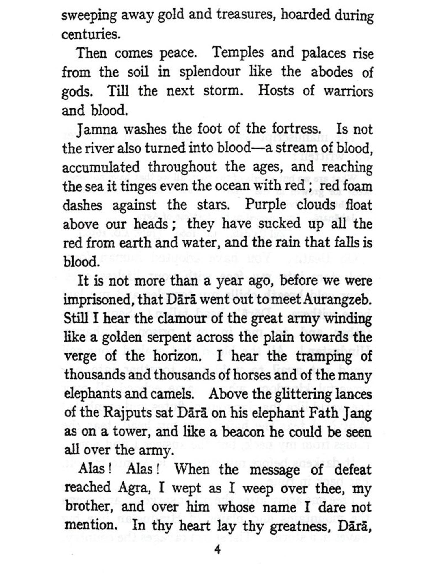The story culminates in the closing years of Shah Jahan, when his sons whom he had sent to rule over distant provinces, for fear of their ambition, rose against him and against each other.