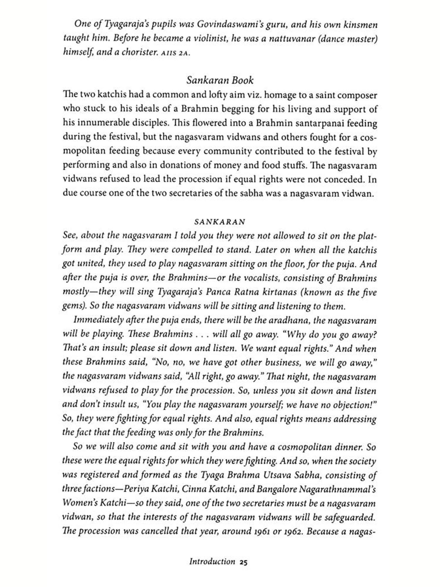 Tanjavur Sankaran (1906-2001) was born into an illustrious hereditary music and dance family who document their lineage to the court of Tanjavur in the South Indian state of Tamil Nadu over two hundred years ago. Over the course of his career, Sankaran had wide exposure to Indian culture, having been posted to almost a dozen cities in his twenty-year career at the then-fledgling All India Radio, and then having served in his ""retirement"" for another twenty-five years as director of the music school at the Tamil Isai Sangam (Tamil Music Academy), an organization based in Chennai that promotes Tamil arts and culture. Sankaran moved easily among different constituencies in Indian society and was razor sharp in his observations of the country's glories and its problems. His writing is unsparing in his critique of individuals who in his opinion exhibit ignorance or caste prejudice toward others. He is equally as severe in his critique of societal institutions that have been complicit in perpetuating forms of discrimination.