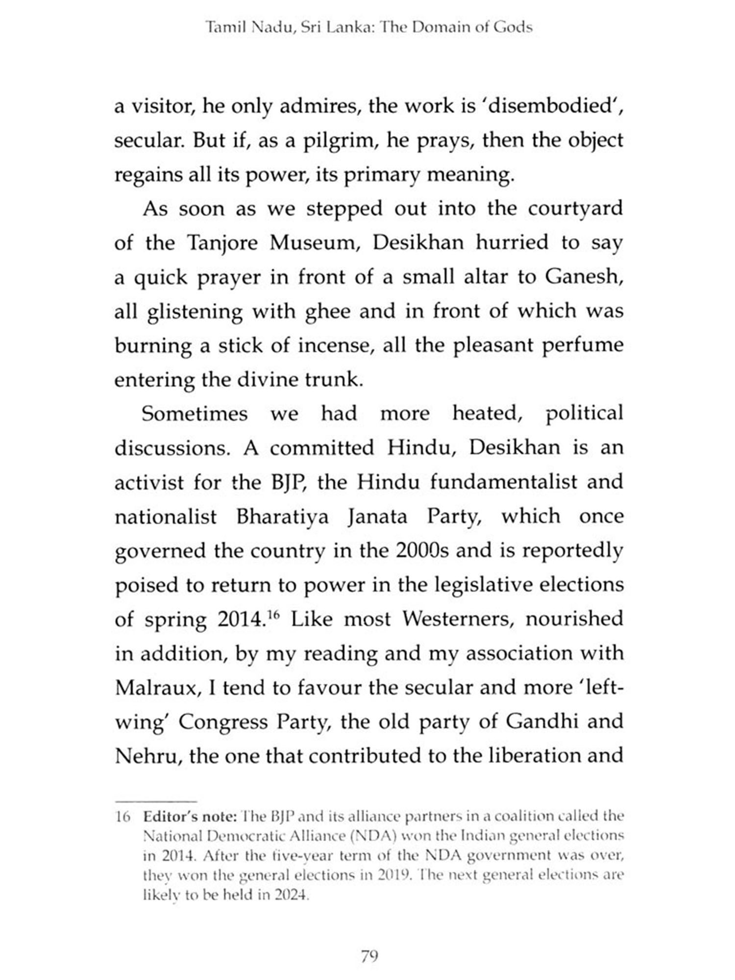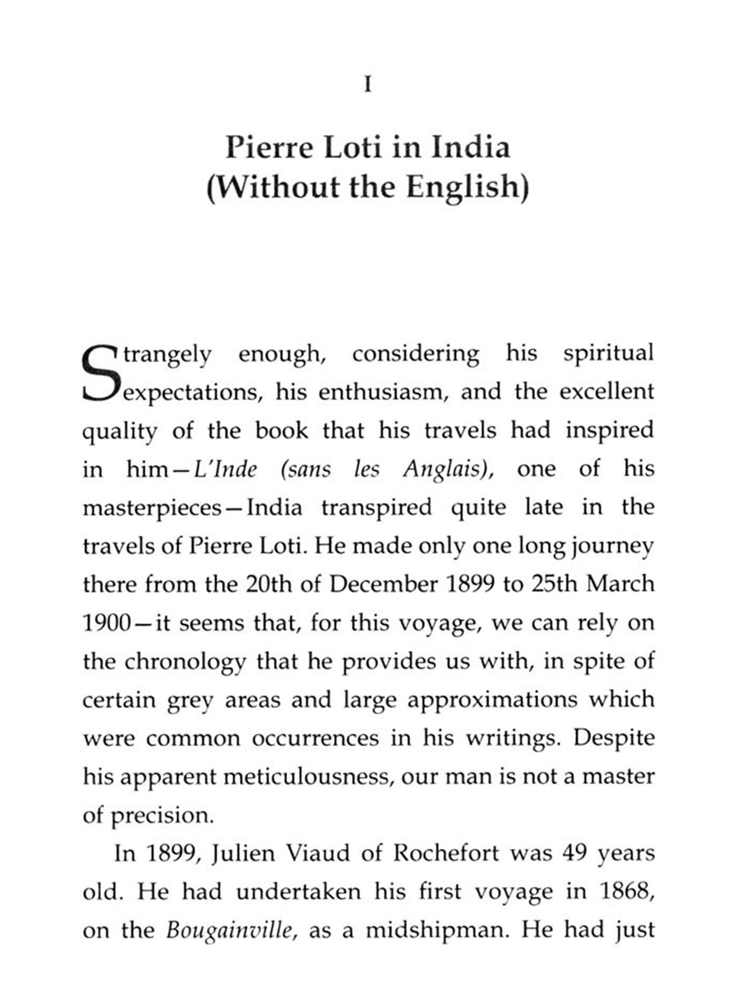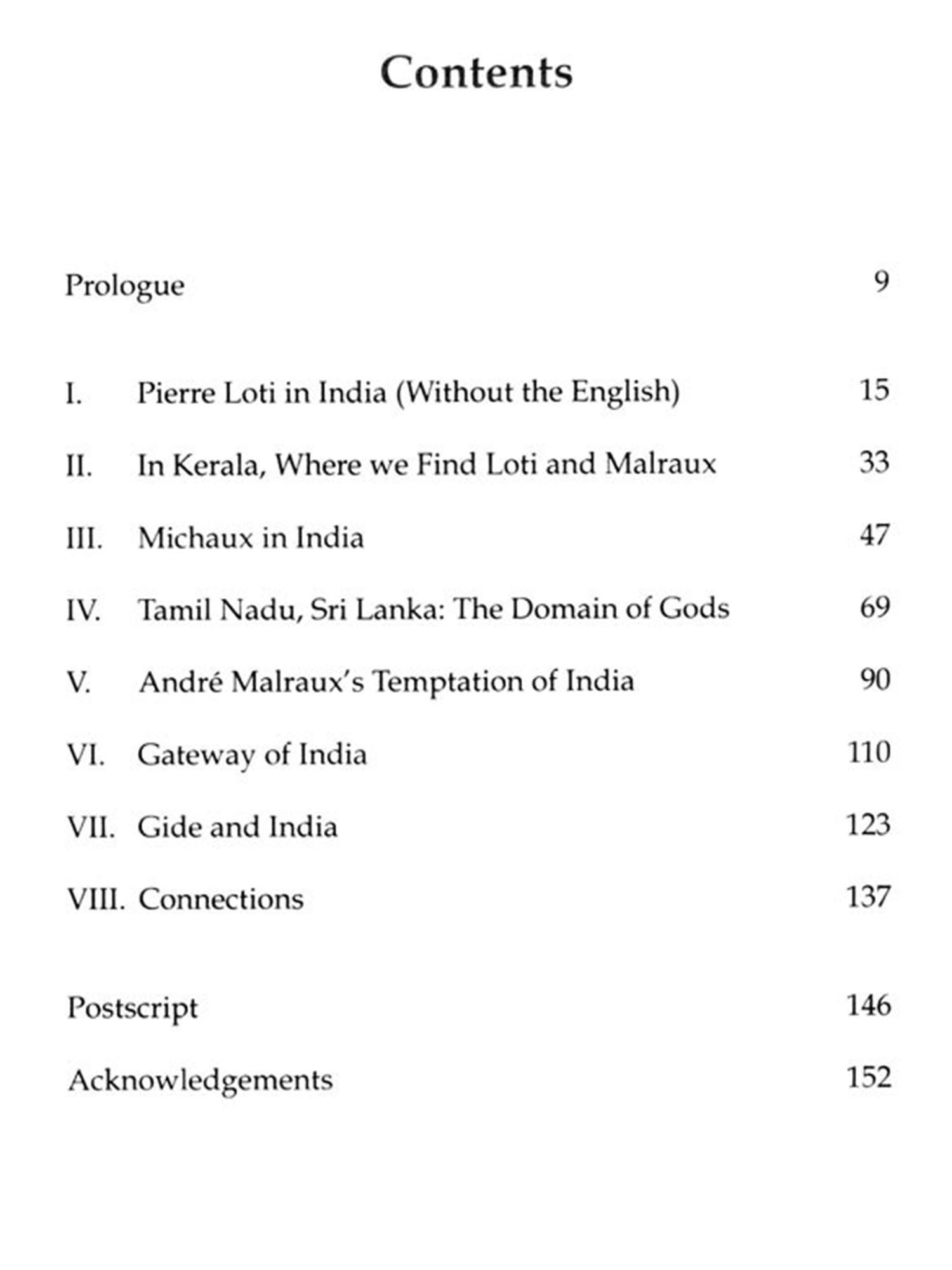 Each chapter in the book details the impact or influence that India had on these French writers individually. Pierre Loti, whose original name was Julien Viaud, discovered India in 1931 and wrote India (without the English), which describes India as if it had not been colonized. About half of Henri Michaux's Barbarian in Asia is devoted to India. André Malraux knew Jawaharlal Nehru and Indira Gandhi and had read Tagore and the Indian sacred texts. André Gide also knew Nehru and had translated Tagore and Kabir into French.