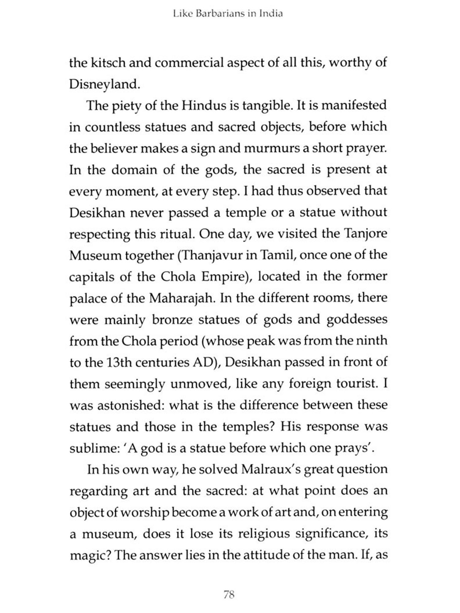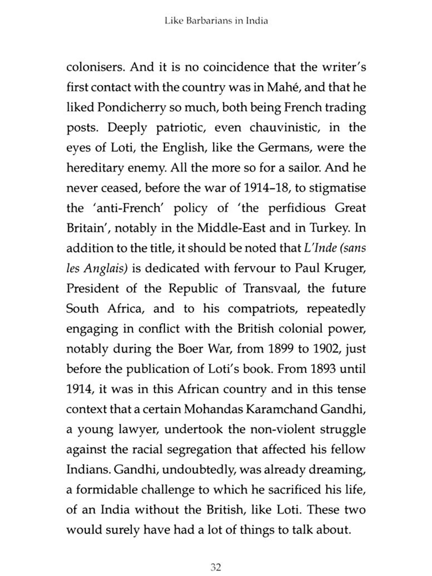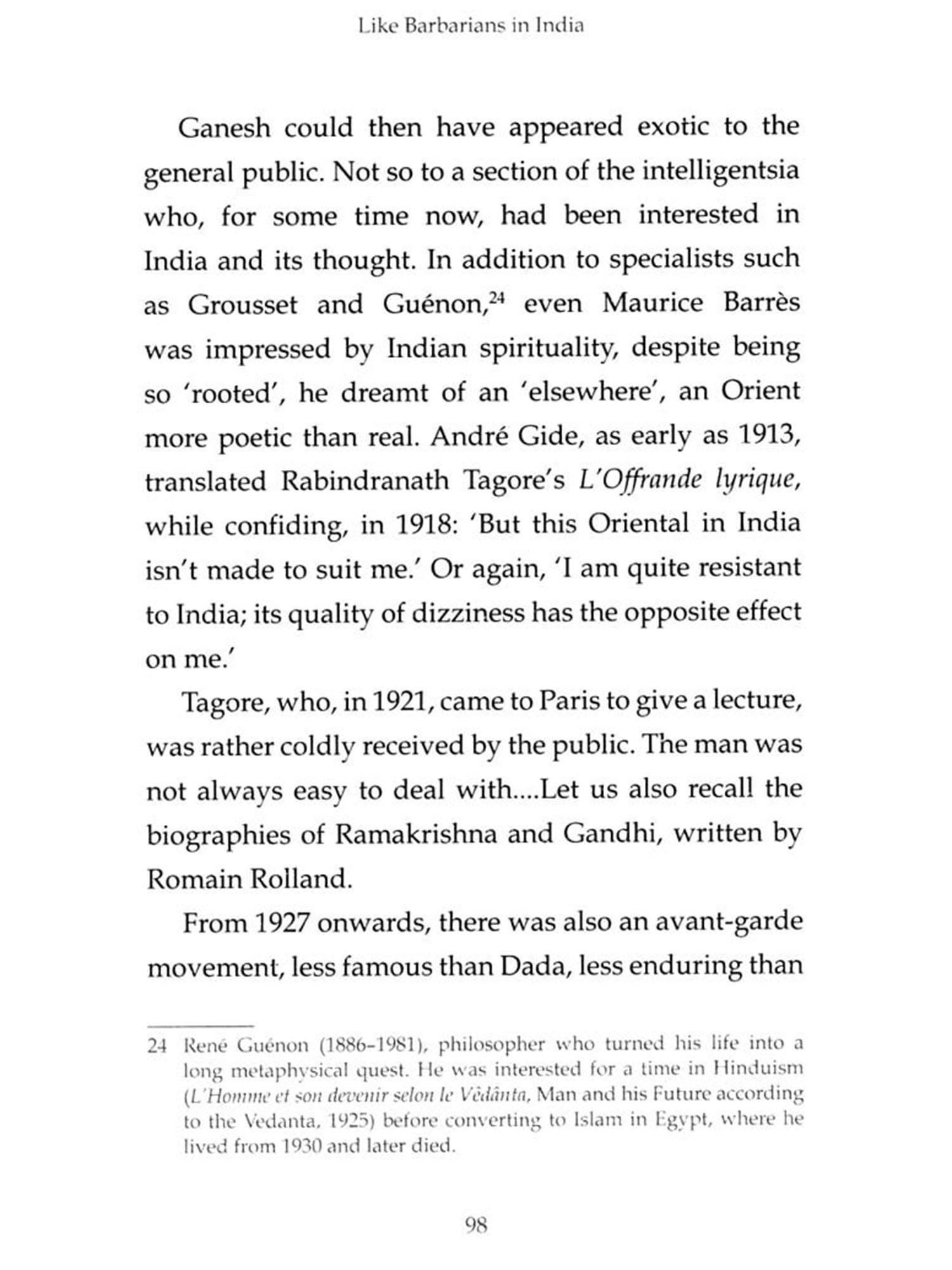 Like Barbarians in India is a heartfelt tribute to India and to four French writers-Pierre Loti, Henri Michaux, André Malraux and André Gide who felt a common attraction to this country of ancient civilization'. The author discusses these writers and their interaction with India, as well as his love for the country.