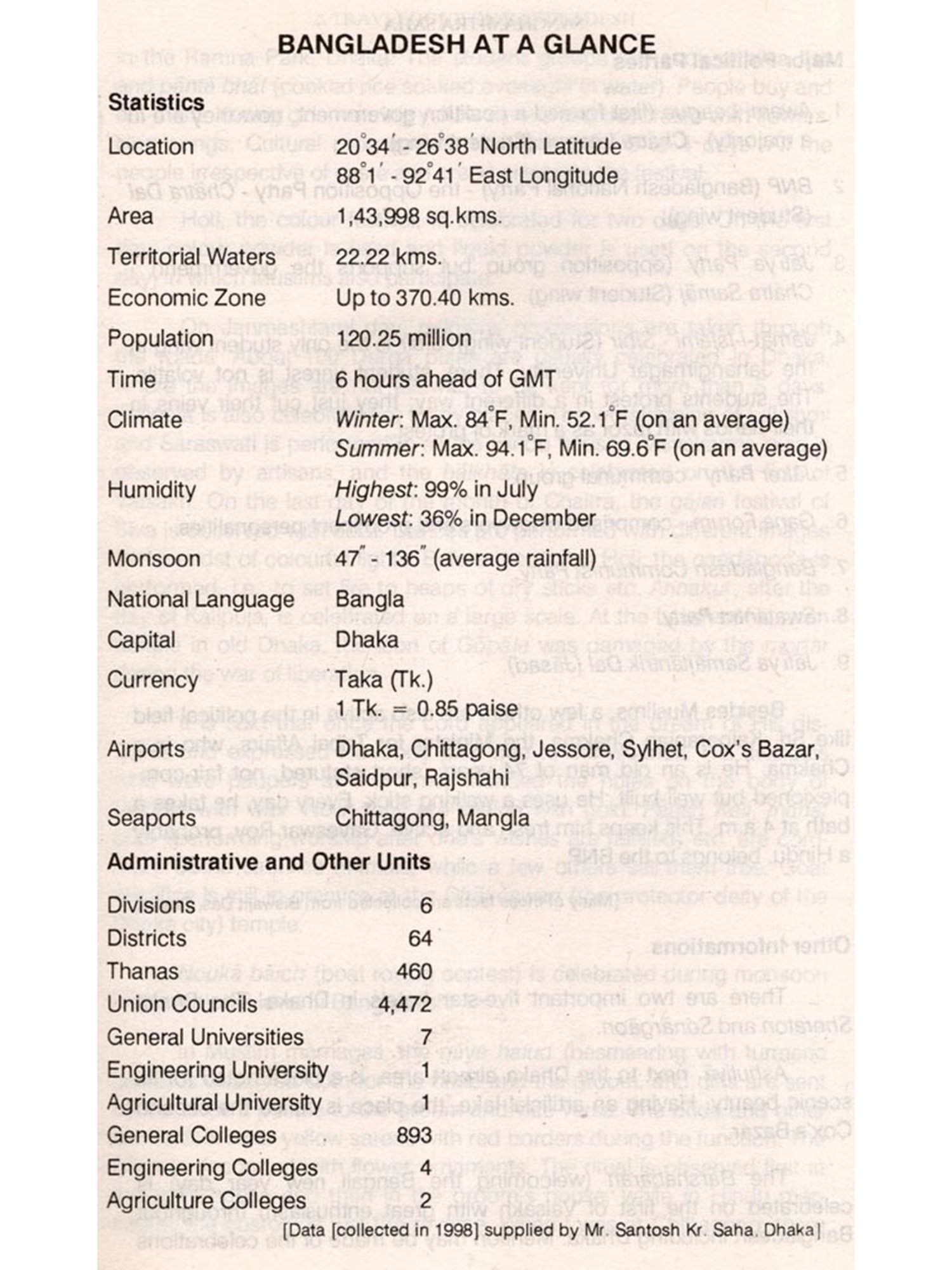 When the Handbook of West Bengal was completed and released, the details of East Bengal, now Bangladesh, could not be covered fully. There was a time-frame for the publication of the two volumes of the handbook, and the omissions, it was felt, could be rec tified in a separate volume on Bangladesh.