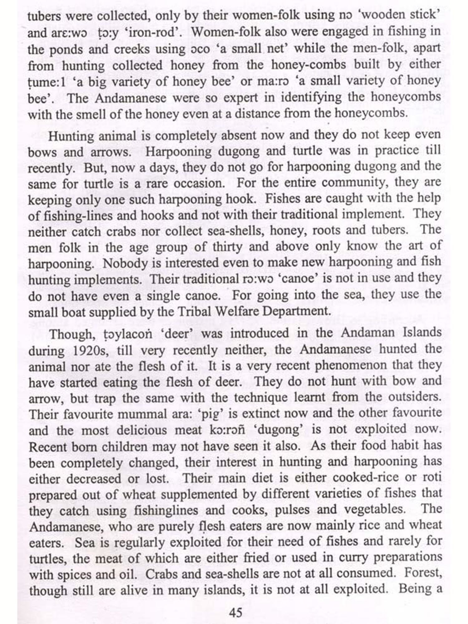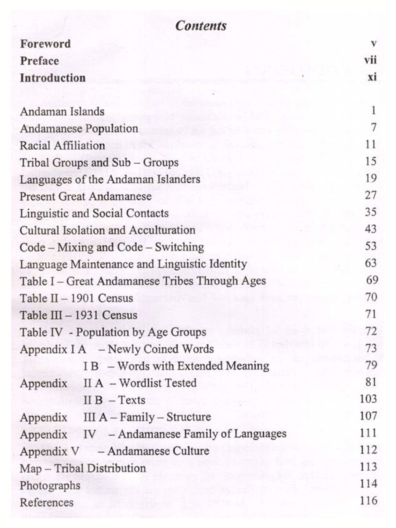The field has been further enriched more recently with D.K. Chakraborty's 'The Great Andamanese: Struggling for Survival' (1990, Seagull) and Zarine Cooper's 'The origins of the Andaman Islanders: Local myth and archaeological evidence' (Antiquity, 1993:67 (255): 394-399), or her 1996 work 'Archaeological evidence for human settlement in the Andaman Islands', (In Ian C. Glover and Peter Bellwood, eds. Indo-Pacific Prehistory: The Chiang-Mai Papers (Proceedings of the 15th Congress of the Indo-Pacific Prehistory: The Chiang-Mai Papers (Proceedings of the 15th Congress of the Indo Pacific Prehistory Association, Chiang Mai, Thailand, 5 to 12 January 1994), Vol.2, 139-142; Canberra: ANU). R.C. Majumdar's 1975-work published by the Gazetteers Unit. Department of Culture, Ministry of Education and Social Welfare. Government of India (titled 'Penal Settlement in Andamans') is also useful as much as Vaishna Narang's 1999-paper 'Time, Tense and Aspect in Jero, 'The Great Andamenese Language', presented in the International Seminar on Theories of Signification, held at JNU and N.Iqbal Singh's 1978-book 'The Andaman Story' from Vikas Publishing House (New Delhi). In spite of all these, there had been a void in our understanding and description of the language and society in the Andaman Islands which had been filled by the two authors. We hope that the work will be useful to a great extent. It is needless to say that there have been more recent works on the island including our own project work on the Nicobar Islands in particular and we will soon be out with a good description of those islands also. The present work gives a comprehensive account of the culturallingustic space and the changes these islanders have undergone over a period of time, which will be a valuable material for today's researchers.
