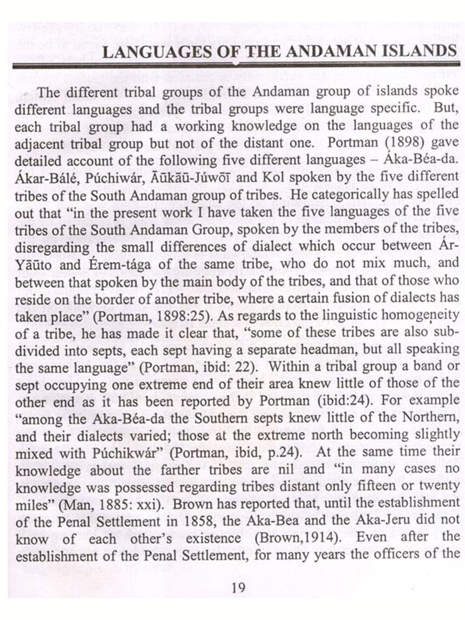 Although there have been a number of sociological investigations on the Andaman Island and their inhabitants beginning from Lt. R.H. Colebrooke's 1795-essay 'On the Andaman Islands (Asiatic Researches, IV: 385-394) examples of which could be found in A.R. Brown's Andaman Island, A Social Study' (1922, London), or the description under the Imperial Gazetteer of India, 1909, Provincial Series, Andaman And Nicobar Islands' (Calcutta), R.F. Lowis' 'The Andaman and Nicobar Islands' (Vol.II; Census of India, 1911) or Edward Horace Man's four works between 1919 and 1922. Sir Richard C. Temple's (1903) Census of India, 1901-report under volume III on the Andaman and Nicobar Islands is a seminal work, no doubt but Radcliffe-Brown's 1914-work, titled 'Notes on the languages of the Andaman Islands', (Anthropos, Ix: 36-52) as well as his 1940-book from Free Press, Illinois, titled 'The Andaman Islanders' are also worth mentioning.