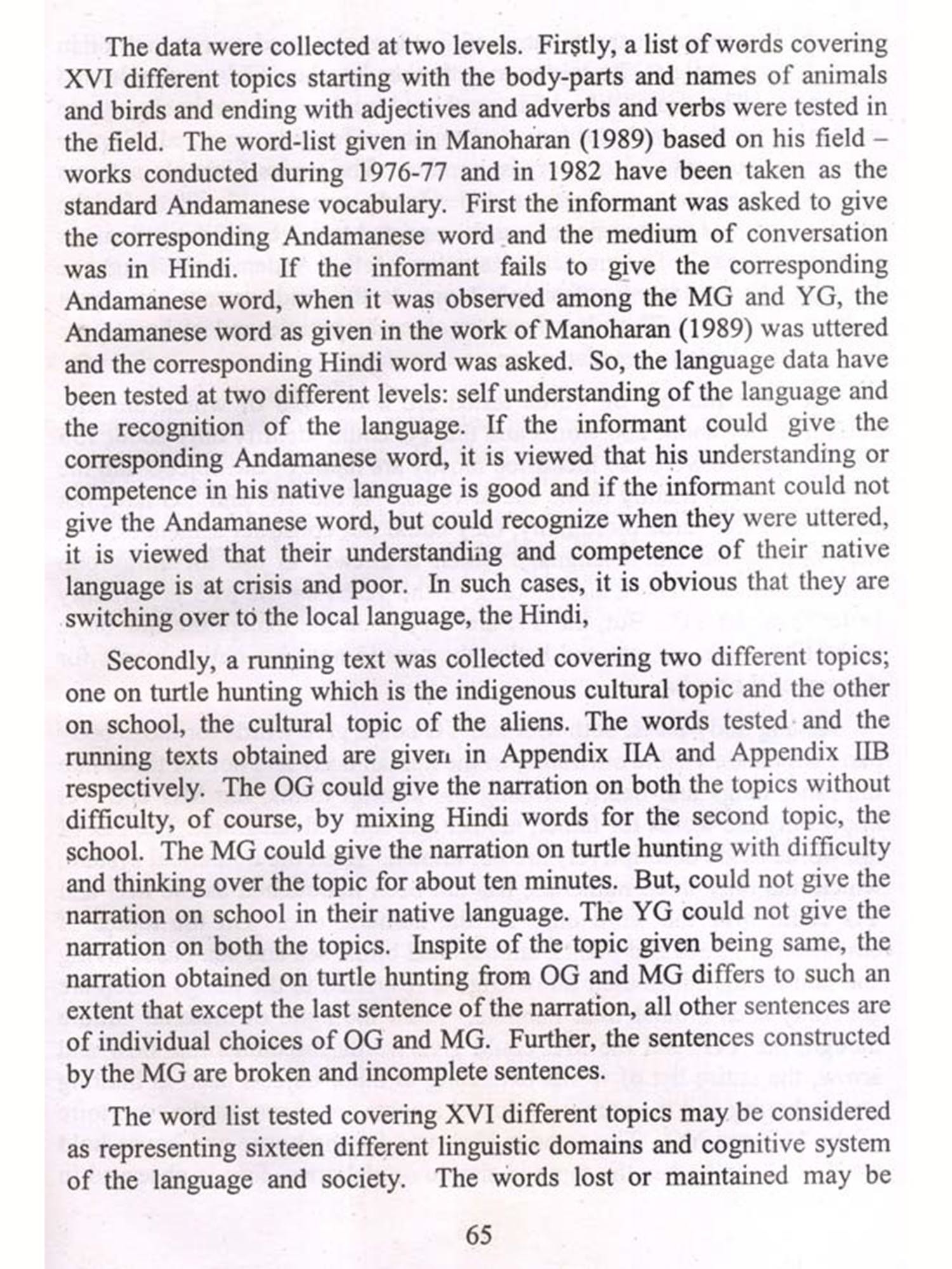 Though different administrators and anthropologists attempted to study the languages of the ten different tribes of the former ten different tribes of the Great Andaman Group, none of them except M.V.Portman, kept the individual languages apart. Man, and Brown gave a description of their languages in their ethnographic studies. But, on their languages, they have written in a general way as Andamanese language, except for the occasional words given for the different languages in their ethnographic description. Manoharan's field-works conducted during 1976-77 and in 1982 were extremely important in the series of field-works conducted among the Great Andamanese by different scholars. But, by that time their population was reduced to a minimum total of 23 persons.