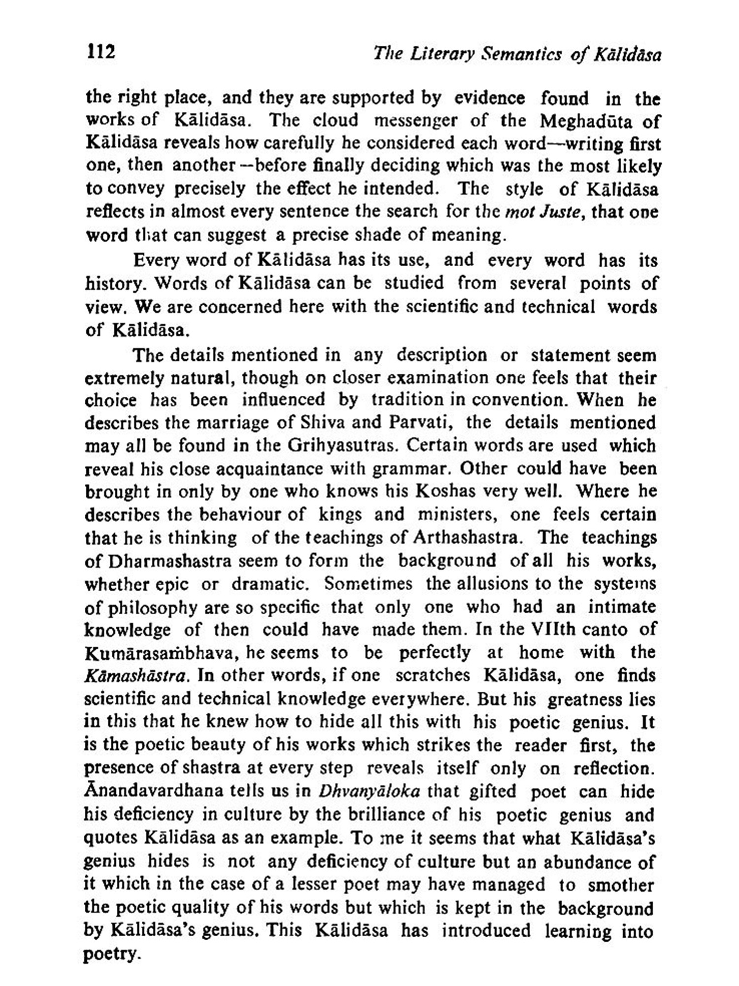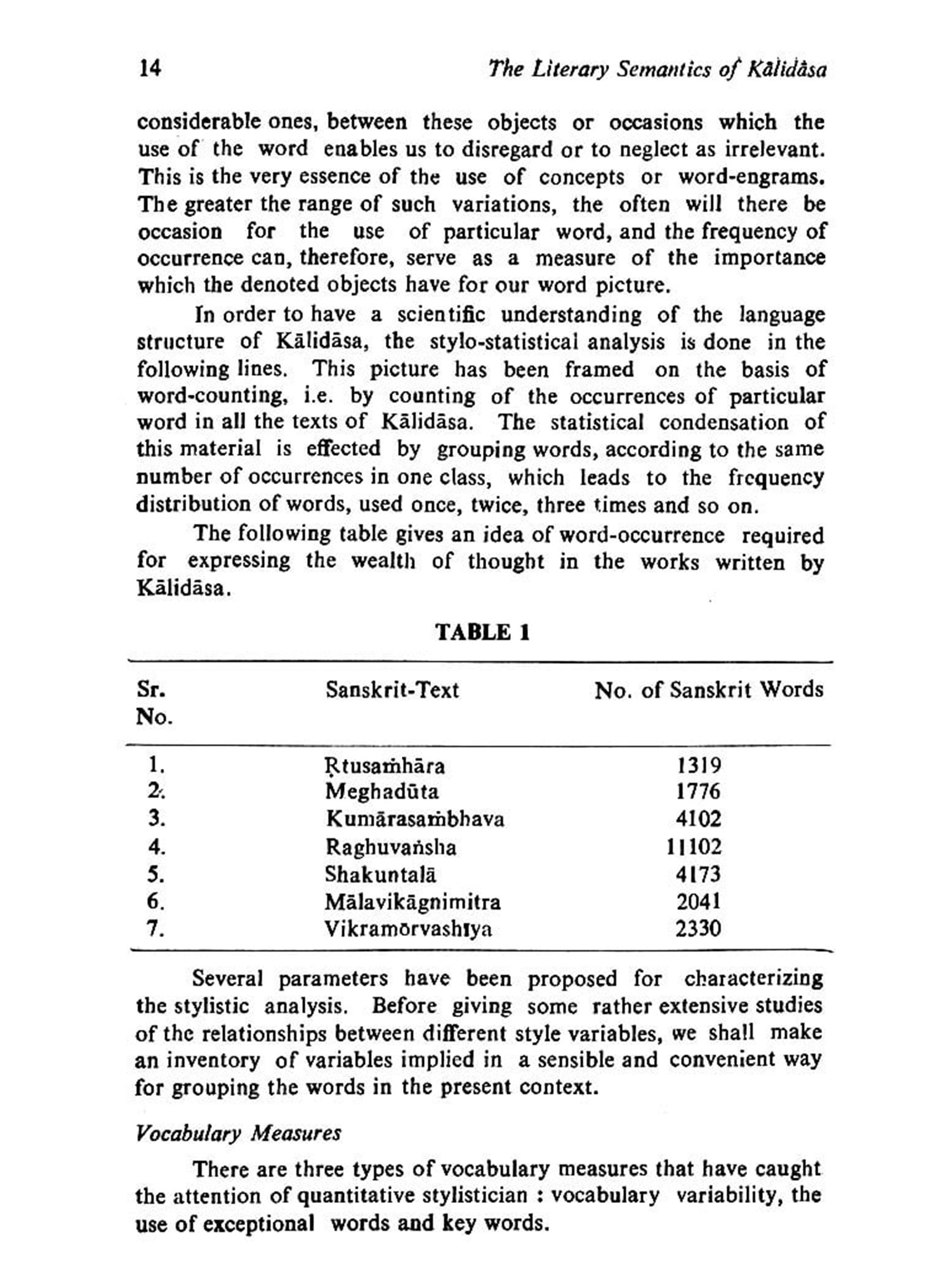 The Literary Semantics offers the hope of methodological support when problems arise which necessitate answers from several branches of learning, each of whose method seems incompatible with that of the other, or when the envisaged research is multidemensional and the dimensions call for different categories which in the final instance should be congruous, or simply when this insight in Kalidasa is to be complemented.