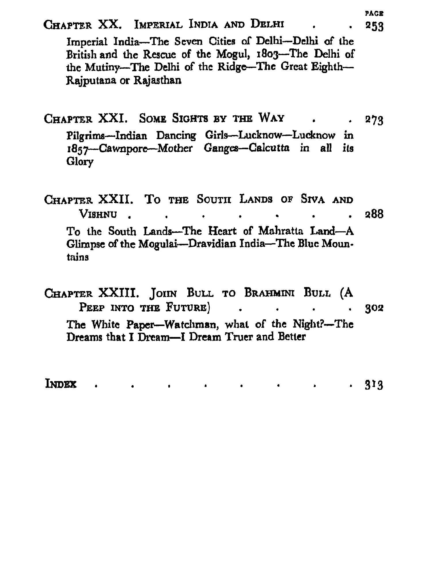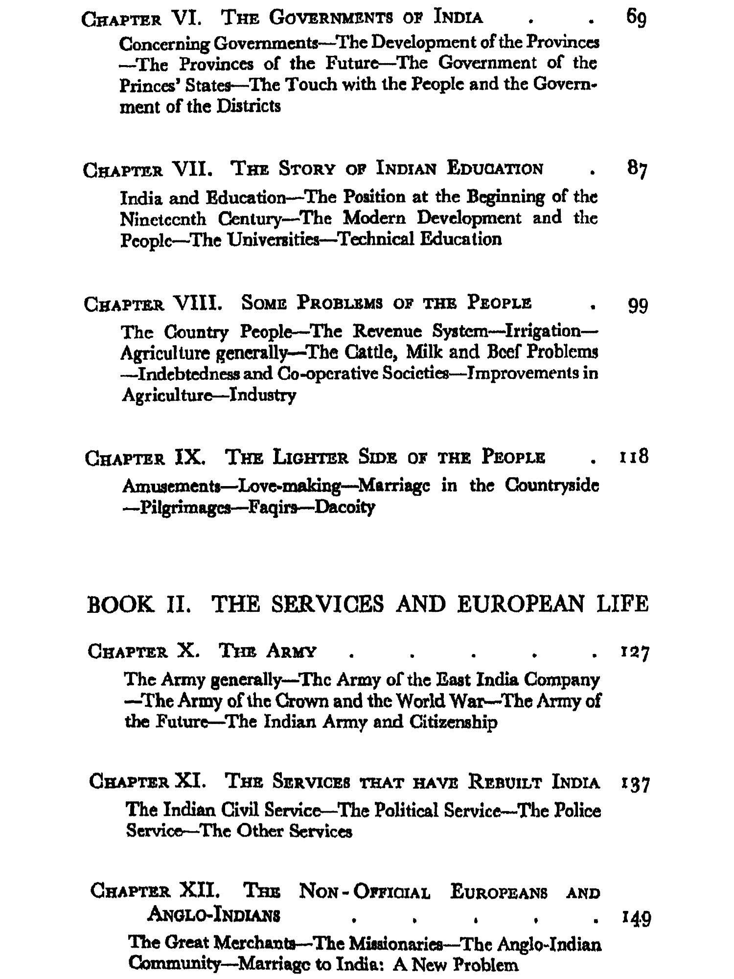 DURING the last few years I have been constantly invited to lecture on some aspect or other of Indian life and conditions, and have found a very great desire among my hearers for a book on India that is less serious than a history and less formal than a guide-book. To stimulate the interest has now come the White Paper, with the uprising against some of its provisions which has been indeed a phenomenon of 1933- The classes who have given their sons to the rebuilding of this crashed sub-continent for many generations are now abstaining, or seeking to probe the conditions of the future before following what has hitherto been the family destiny. The Living India aims at helping this spirit of inquiry, of giving a coup d'œil of history and peoples, the life of the Europeans and such matters as the winter visitor may care to take cognizance of at opening the shutter for a few seconds. The spelling of the Indian names herein is the illogical British spelling, that we all know from the days of Little Henry and his Bearer, and no attempt has been made to follow scientific rules. Many of the photographs have been lent by the unlimited courtesy of the Indian Railway Bureau ; others have been taken by the author so recently as 1933. Where figures and data are given they are taken, for the most part, from the official publication, India in 1930-31, the latest available.