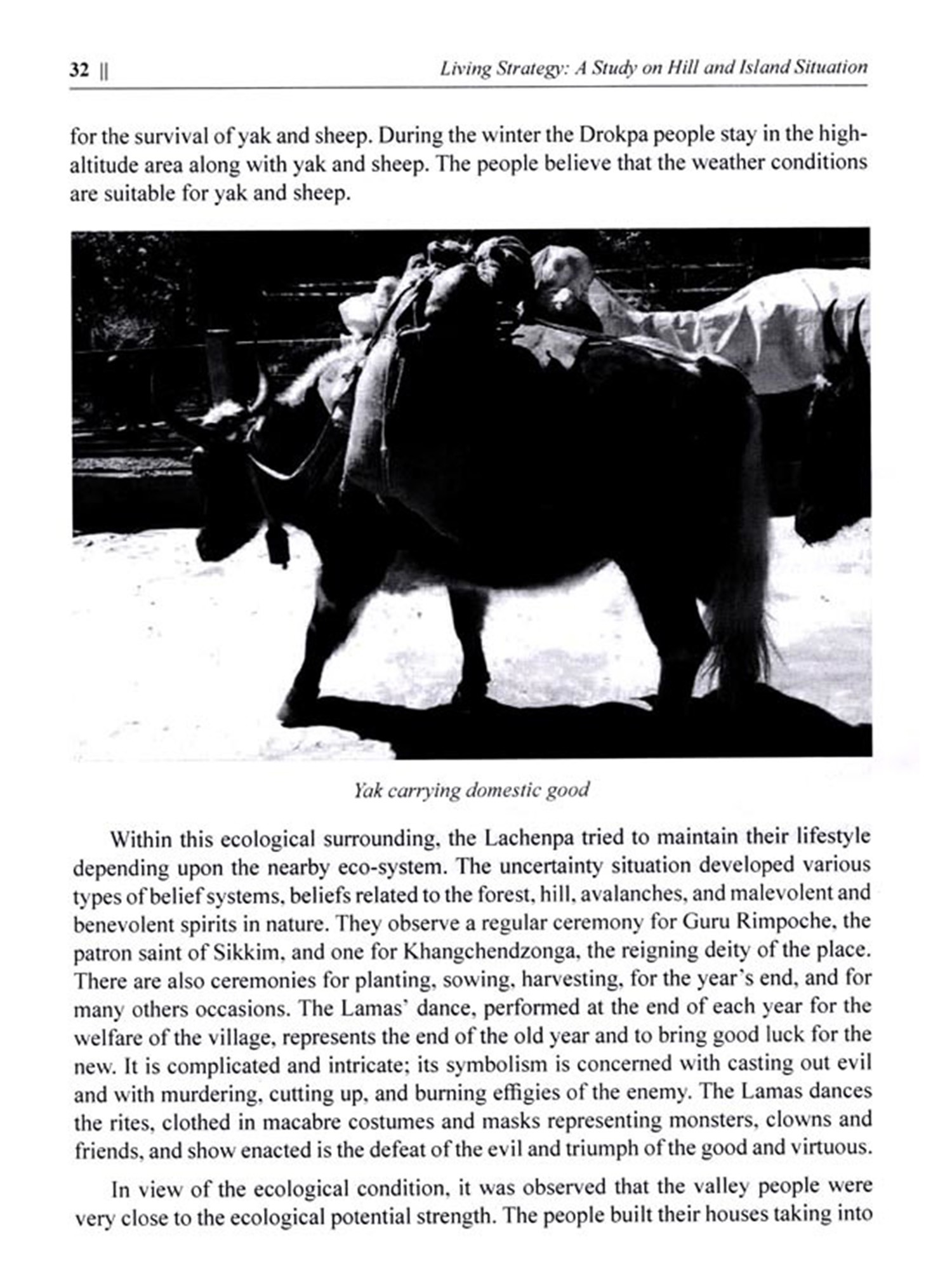 The author's detailed descriptive accounts of the ways of life of the people inhabiting two different extreme environmental setups, together with their insights in analyzing the interrelations with the ecology, processes of adaptation for survival, place of two different animals-the Yaks in case of the people of North Sikkim and the Pigs in context of Nicobarese of Katchal Island established the author's arguments in respect of human's ability in developing suitable measures that guide in formation of specific types of social systems fittest to the two extreme environments.