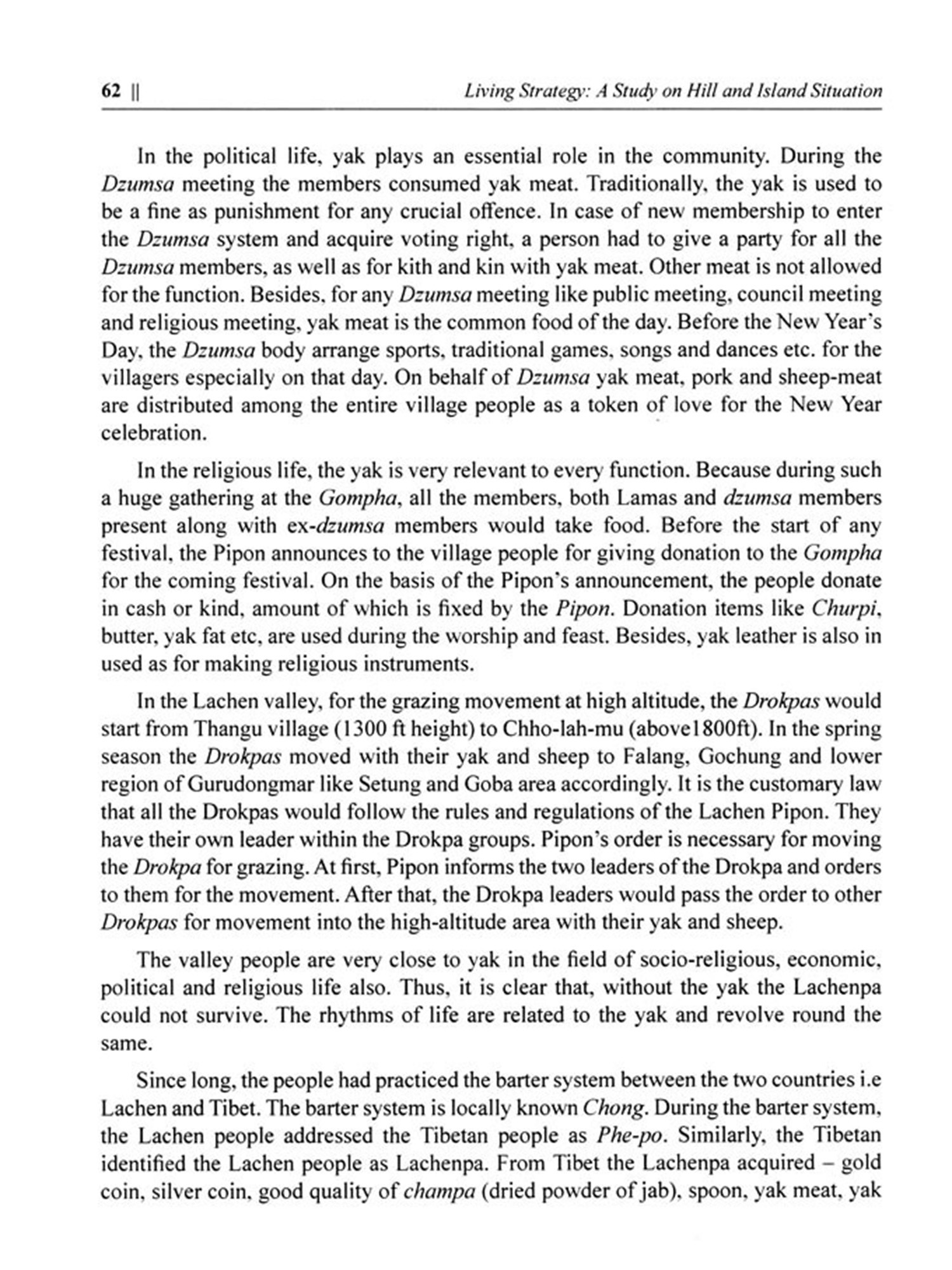 The study on ""Living strategy- A study on Hill and Island situation', centers on two different communities belonging to two ecological conditions. Here, two animals i.c., the ""Yak"" of the Lachenpa community (cold waste of North Sikkim) and the ""Pig"" of the Nicobarese (island situation) fulfil the need and demands of the populace. The study reflects how they maintain their livelihood both in the context of an individual and as a whole community very efficiently.