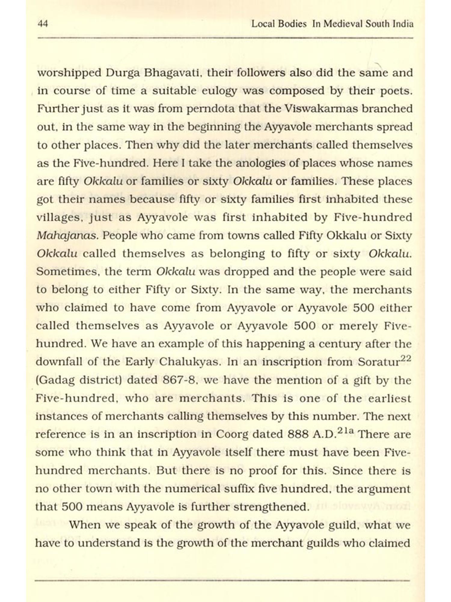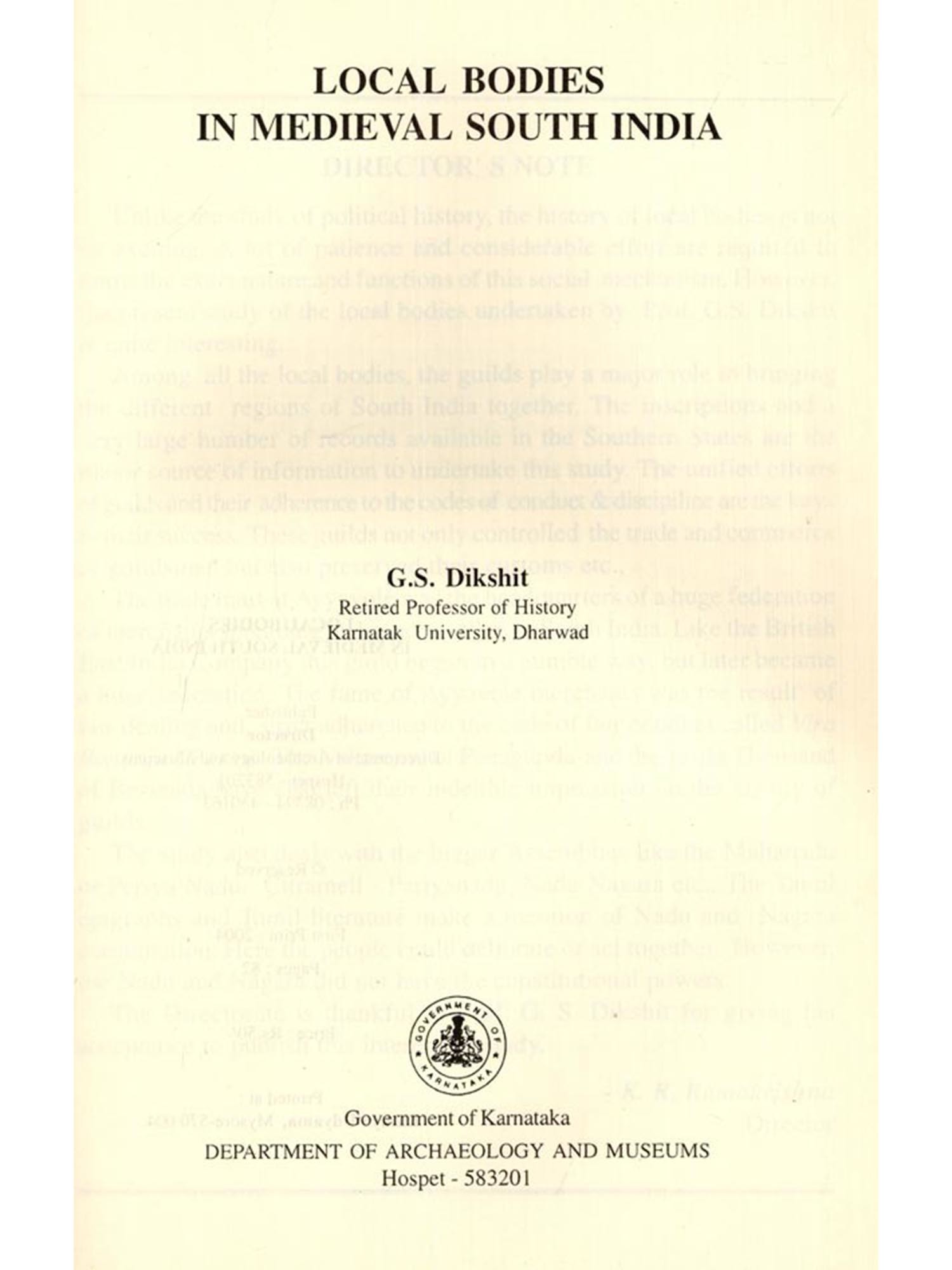 Local Bodies in Mediaeval South India is a sequel to my work "Local self-government in Mediaeval Karnataka." While reviewing the earlier work, Dr. T.V. Mahalingam had said that I should have compared Karnataka local bodies with local bodies in the rest of South India. This is exactly what has been done in the present work. The working of local bodies in mediaeval Karnataka is compared here with the working of similar bodies in Tamilnadu, Andhrapradesh and Kerala, where such material is available. In chapter 1, I have dealt with the composition of the local assemblies, their officers and their duties, their meetings, the methods of summoning them and their methods of work. Chapter II deals with the working of the guilds-in particular, with the guild known as the Ayyavole 500. Its origin in Aihole of Karnataka and its prototypes in Tamilnadu, Andhrapradesh, Sri Lanka, and Southeast Asia are then described. The last chapter is devoted to a consideration of large territorial assemblies know as Mahanadu, Chitralmeli Mahanadu and Nadu and Nagara.