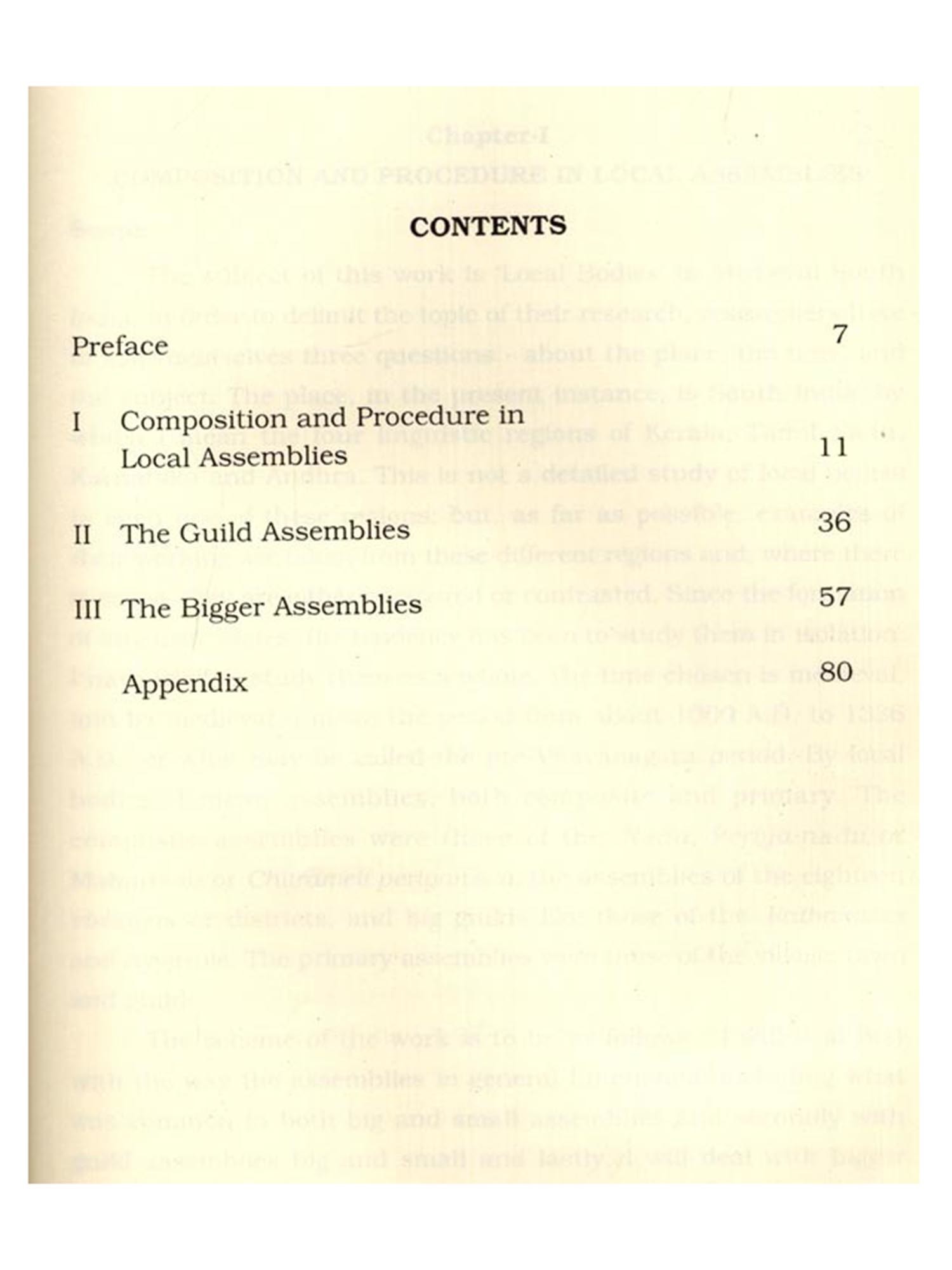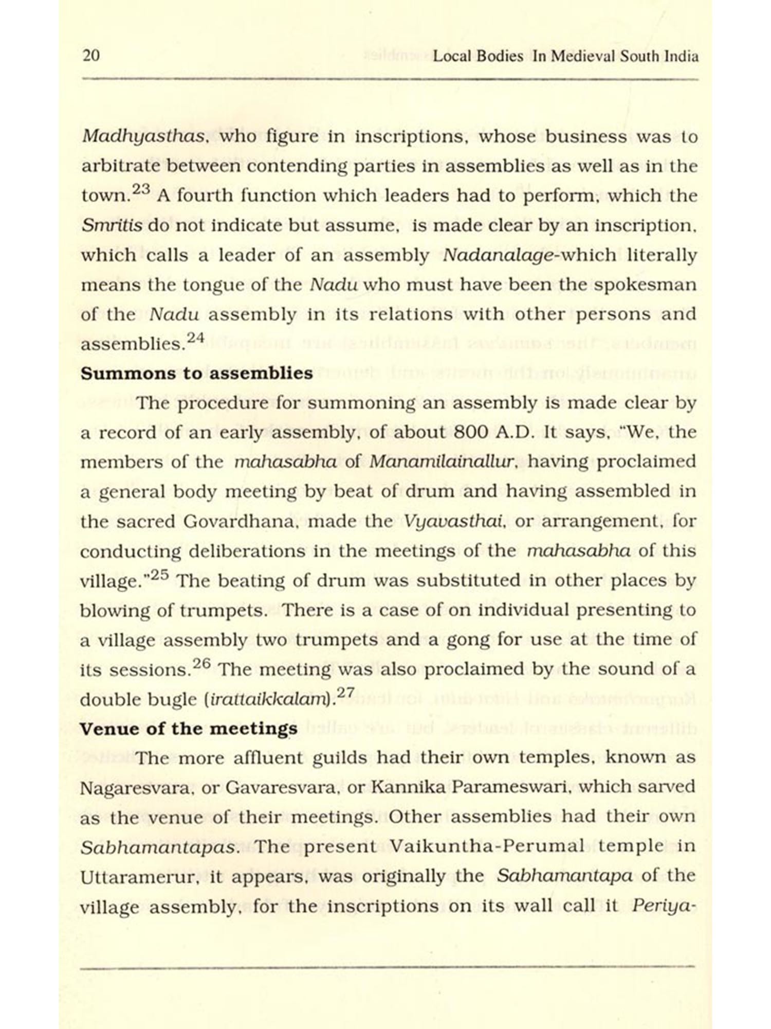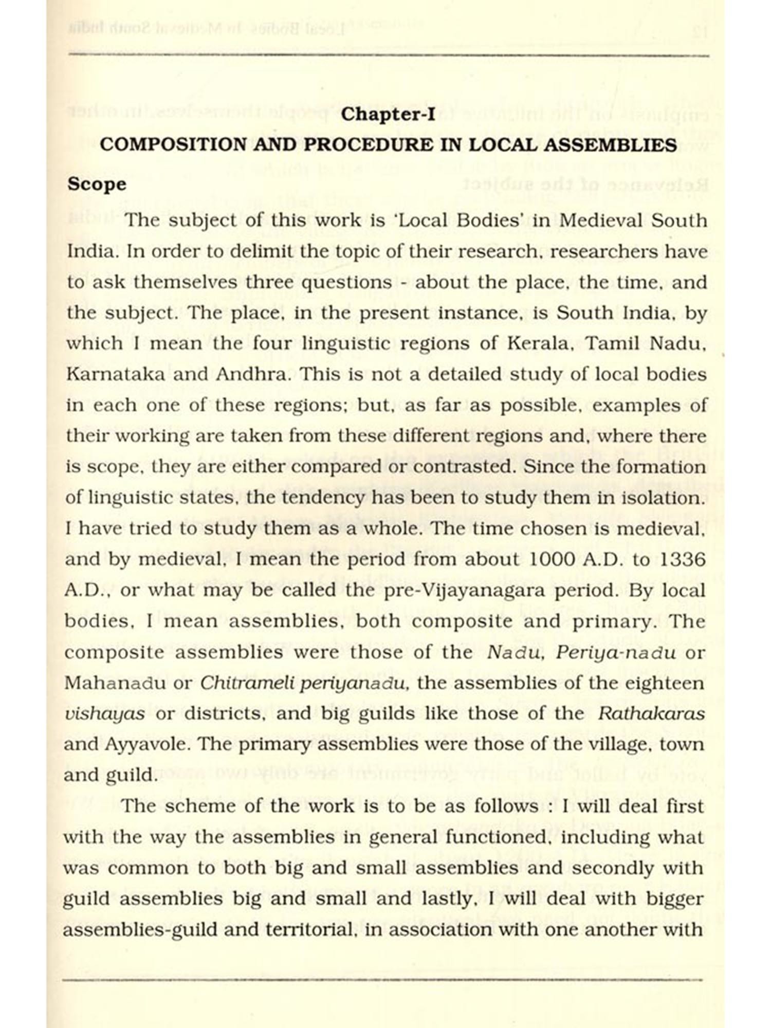 Both representation and election were known in the mediaeval period. With regard to procedure, the method of consensus was followed both in electing officers and in passing resolutions. In fact, this method of consensus may be considered to be India's contribution to procedure in assemblies everywhere. As regards merchant guilds, the work answers some critical questions which are raised in the latest work on the subject edited by Noborru Karashima. In the last chapter, on large territorial assemblies, it adds a few more examples of such assemblies which have been noted by the only writer on the subject viz. Sri K.V Subramanya Aiyer.