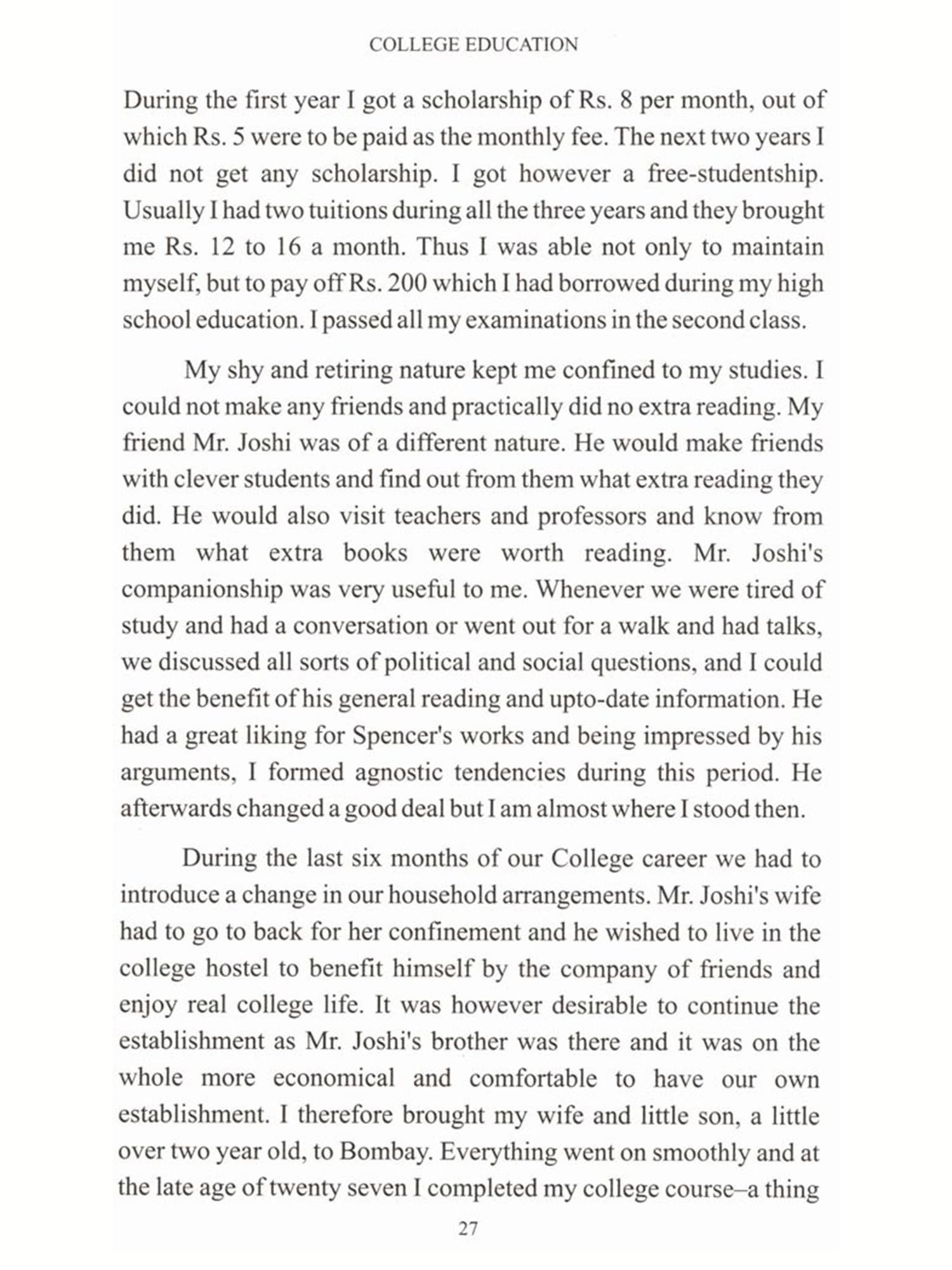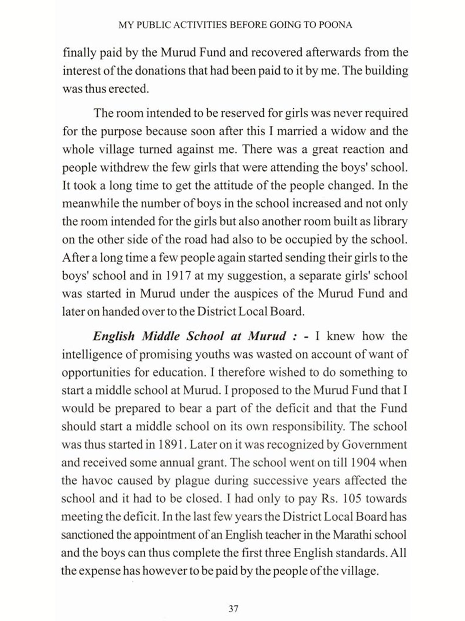 On a summer afternoon in 1929, in a garden at Geneva which was crowded with delegates to an international conference on education, all bearing their names on tickets hung from the neck - 1 met a serious but genial Hindu whose ticket announced "D. K. Karve of Poona". My thoughts immediately flew back to an assembly of teachers in Poona High School (January 1913) before whom I had given an ethical story lesson to a class of boys, and to Fergusson College which I had visited under the guidance of Prof. R. P. Paranjpye. Prof. Karve and I plunged into fraternal converse straightway, and I learned that he had sat among my Poona audience sixteen years ago. As my teaching tour in the Bombay Presidency and Baroda was Short, I had met many people that he well knew-Mr. (afterwards Sir) Claude Hill, Mr. W. H. Sharp, Sir Narayan Chandavarkar, Miss Chubb of the Ahmedabad Training College and others; and elsewhere I had met Mrs. Besant, Prof. Gokhale, Sir William Wedderburn and Benoy Kumar Sirkar, all of whom are mentioned in Karve's most interesting autobiography. 1-now aged 80-have mingled with many social pioneers and reformers, and I-who often told young listeners of the boy prince Arjuna's steadiness of eye in concentrating on the target for his arrow-quickly recognized the true pioneer type in the man of Poona. He had the Arjuna gleam in his Brahman eyes, the gleam that tells-not of dreaminess which only dreams, but of dream-genius that frames a noble conception and proceeds to plan, with concentration and business capacity, schemes for the service of humanity, and goes out into the wide world and realizes the plans. And India and civilization whisper blessings on this aged hero's name. At one point in this story he calls himself a 'Mad-man'. Certainly the blood never trickled lazily in his veins. If I wanted to stir lazy lads by a tale, I would tell them the tale of the youthful band, of which our D. K. K. was the leading spirit, who tramped 110 miles from Murud by the sea to the examination room at Satara, in a four days' pilgrimage, and on the third night slept uneasily under the stars in a rocky glen where wild beasts perhaps prowled. The narrative is a parable of his career. He saw his goal, he walked, he persisted, he achieved. One long effort--in meditating, devising, walking, riding, collecting, debating, persuading, agitating-resulted in the Widows' Home and the Mahilä Vidyalaya. He was then 57, and the vision of another (so to speak) Satara rose to his imagination. Across the lands and the seas there flashed from the Far East a picture of a Women's University in Tokyo. What Japan had done, could not the valour of Murud and the wit of Poona do? The enthusiast aged 57 exclaims: "New life coursed through my veins!" Then follows the splendid record-to me as enchanting as the chronicle of Marco Polo-of our pioneer's passage round the globe by the route of London, Dublin, Geneva, Elsinore by the Baltic Sea, United States and Tokyo. At Tokyo, where 1600 students attended the Women's University established by the noble labour of Naruse in 1900, the son of Murud almost experienced a thrill of reverence as if in a sacred city; and in his account he murmurs the word "delight". He tells how the earth-quake of 1923 injured the buildings, and how the Japanese "were not discouraged, and work was carried on in temporary huts". It has been in that invincible temper that the youth who slept under the stars on the rough path to Satara has evolved, in spite of innumerable difficulties, the Shreemati Nathibai Damodher Thackersey Indian Women's University. The reader will note all along that the Pioneer perpetually sounds the music of gratitude to helpers in his enterprises. He thanks rich and poor, Indians and European.
