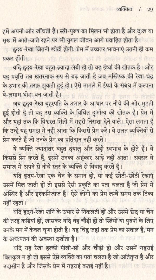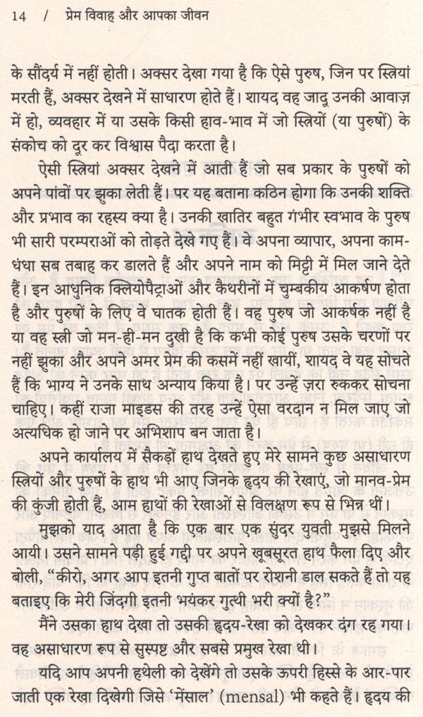इस विषय से इक्कीस वर्षों से जुड़े रहने के दौरान मैंने जो सफलता प्राप्त की उसका कारण मुख्यतः यह है कि यद्यपि मेरे अध्ययन का मुख्य विषय था- हाथ की रेखाएं और हाथ की बनावट, पर मैंने प्रकृति की पुस्तक में उसी पृष्ठ तक अपने को सीमित नहीं रखा। मैंने उन सब बातों का भी अध्ययन किया जो मानव जीवन पर कुछ प्रकाश डाल सकती थीं। परिणामस्वरूप, त्वचा की लकीरें, हाथ के रोएं आदि सभी का उपयोग इस प्रकार किया गया जैसे कोई जासूस प्रमाण जुटाने के लिए सभी संकेतों का उपयोग करता है। मैंने देखा कि लोगों को इस अध्ययन के बारे में संशय था क्योंकि इस विषय को तर्कसंगत तरीके से प्रस्तुत नहीं किया जाता था।