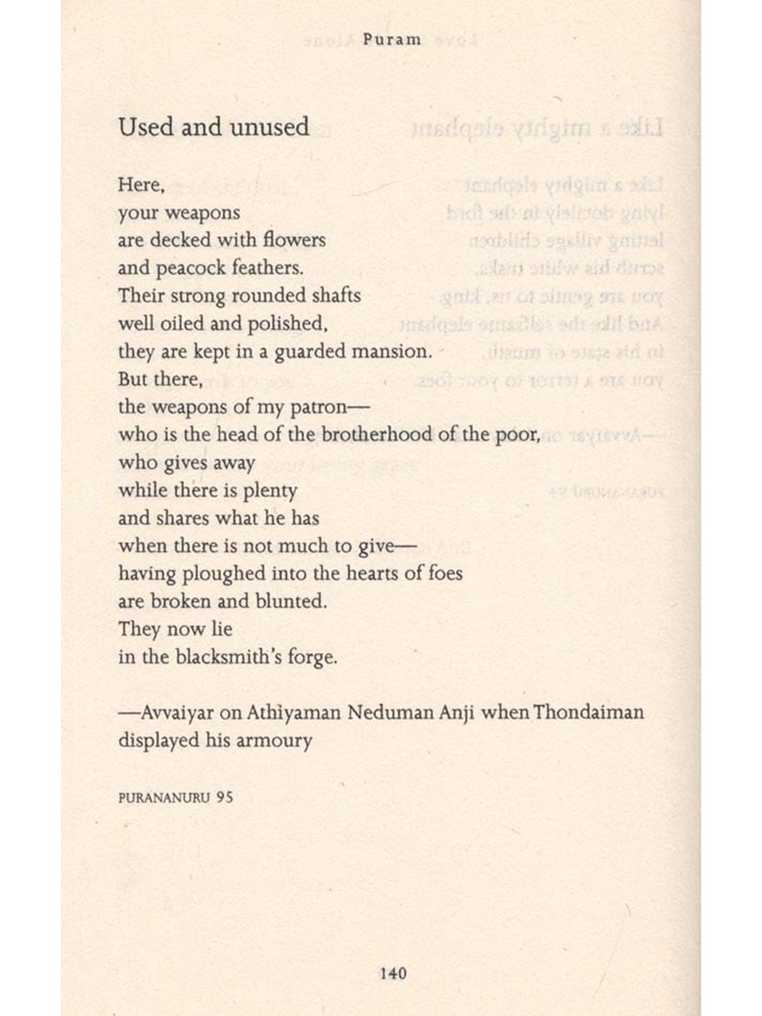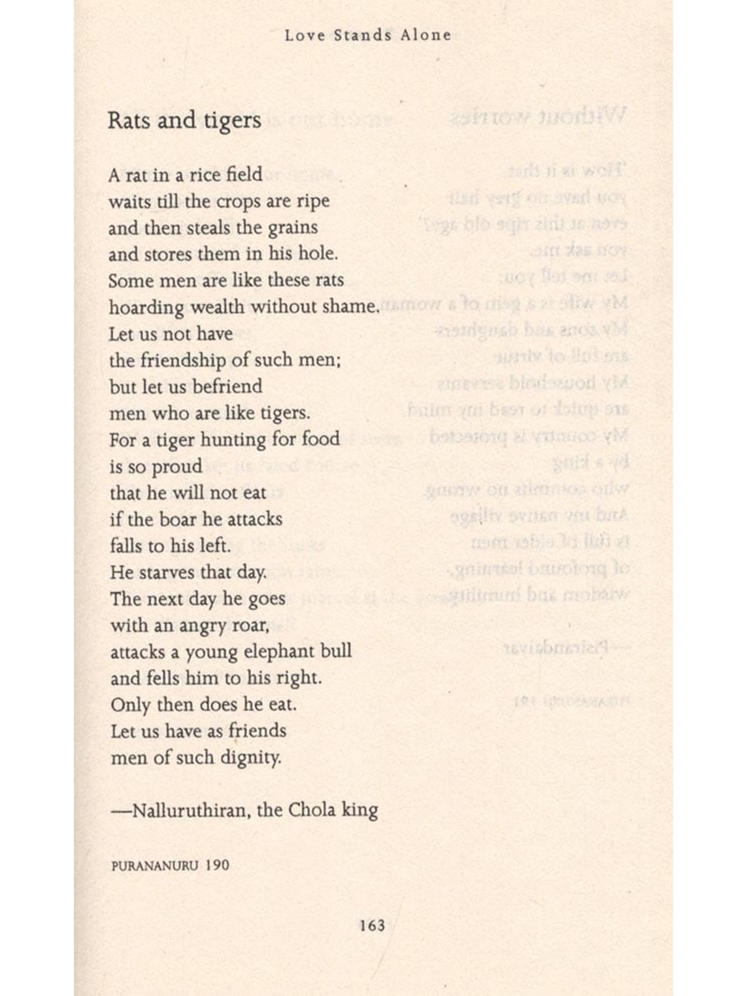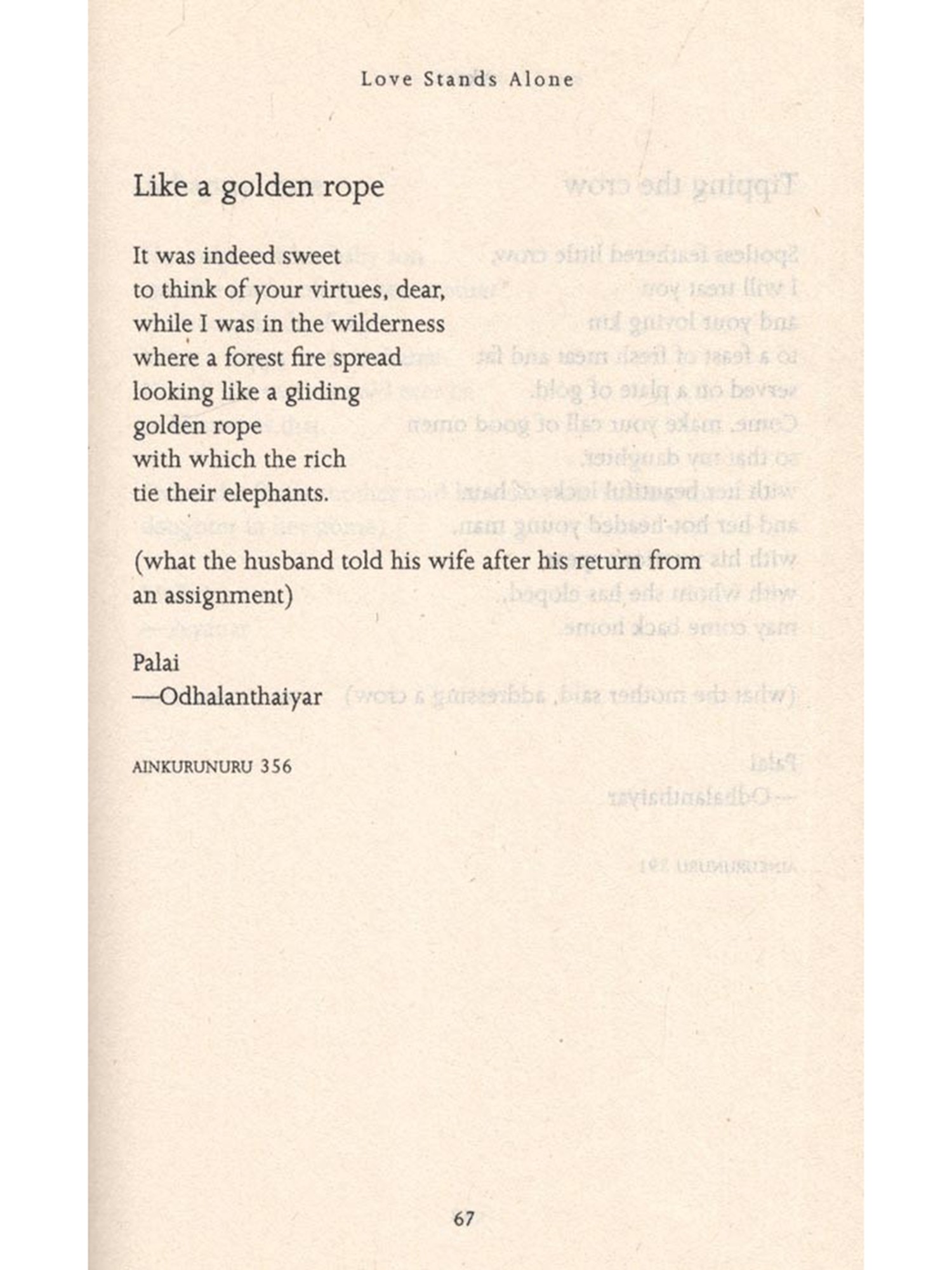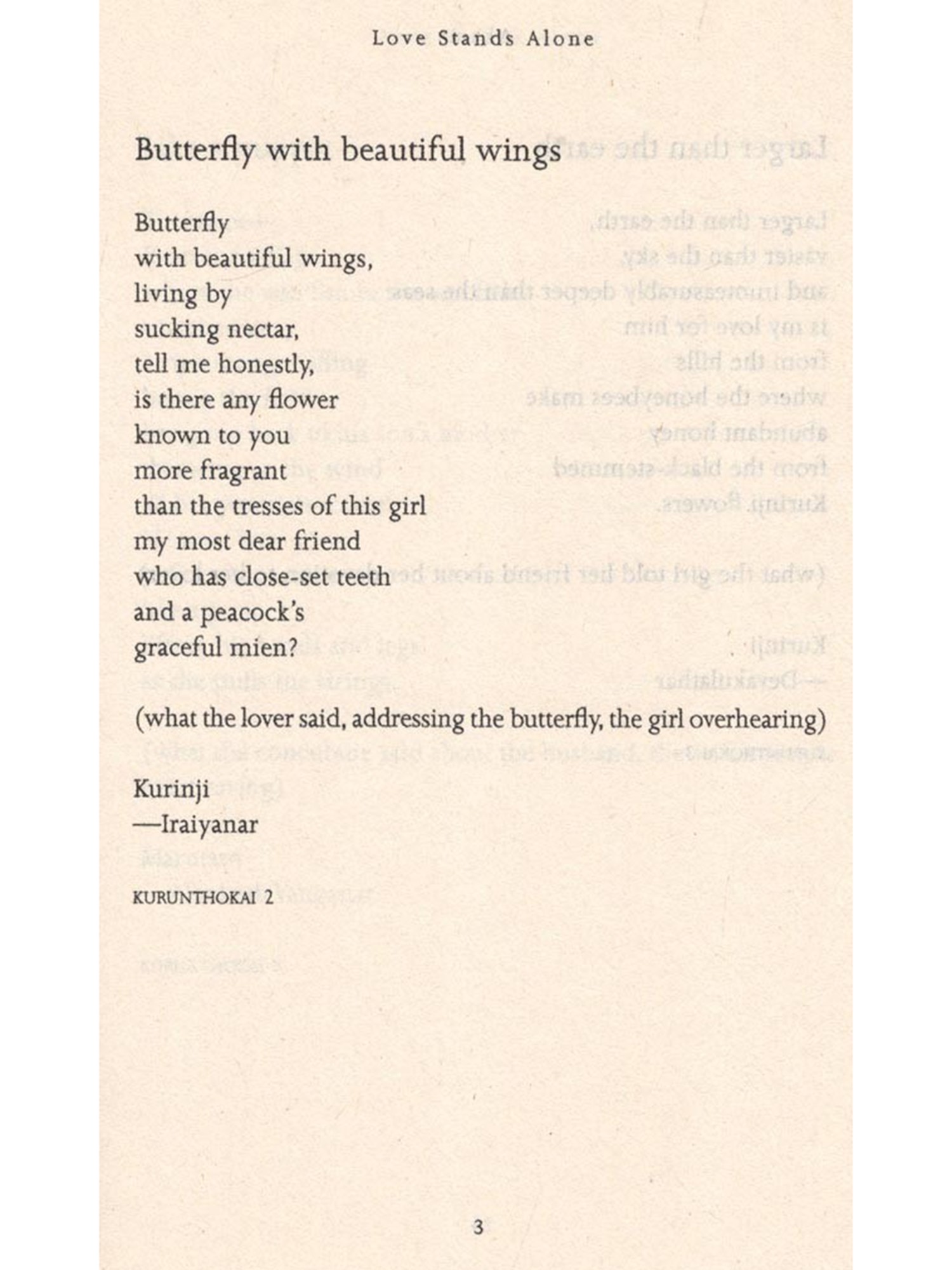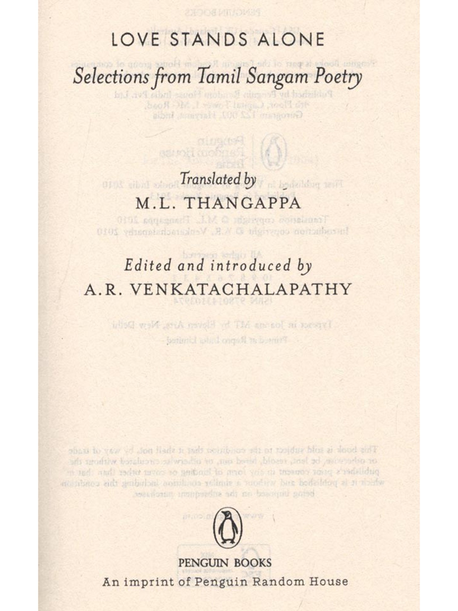 The breathtaking poems in Love Stands Alone speak to us across time, space, language and culture. The interior, akam, and the exterior, puram, form their two overarching themes. The akam poems are concerned with love in all its varied situations: clandestine and illicit, conjugal happiness and infidelity, separation and union. The puram poems encompass all other aspects of worldly life: wars and battlefields, the munificence of kings and chieftains, and the wisdom of bards.