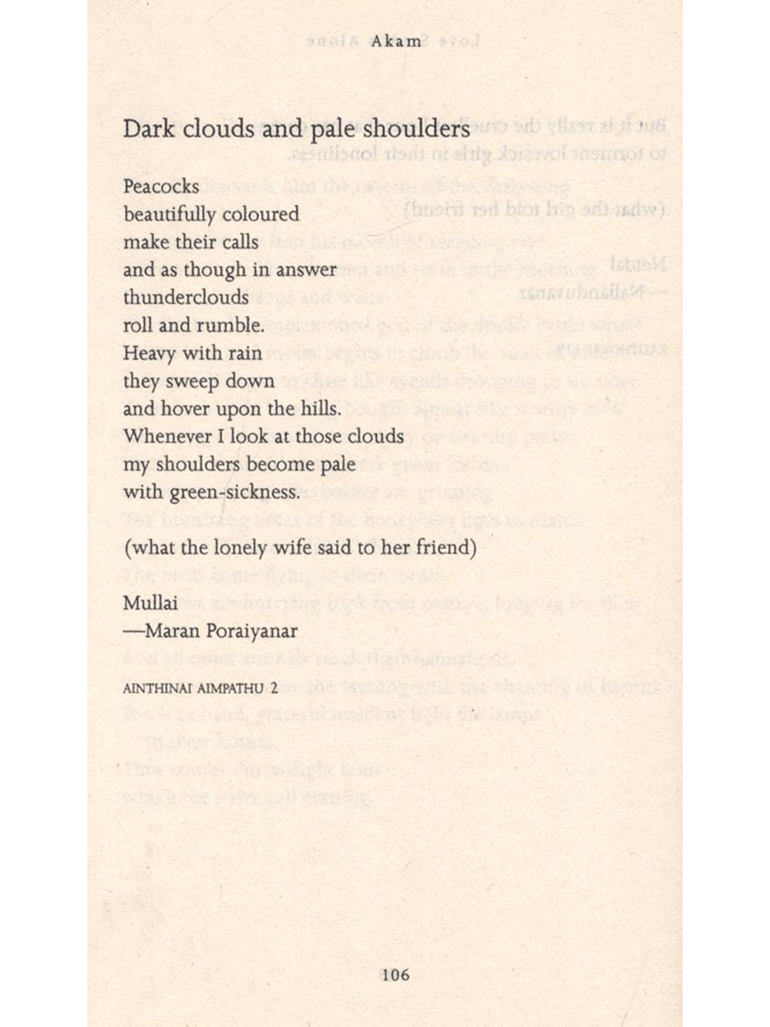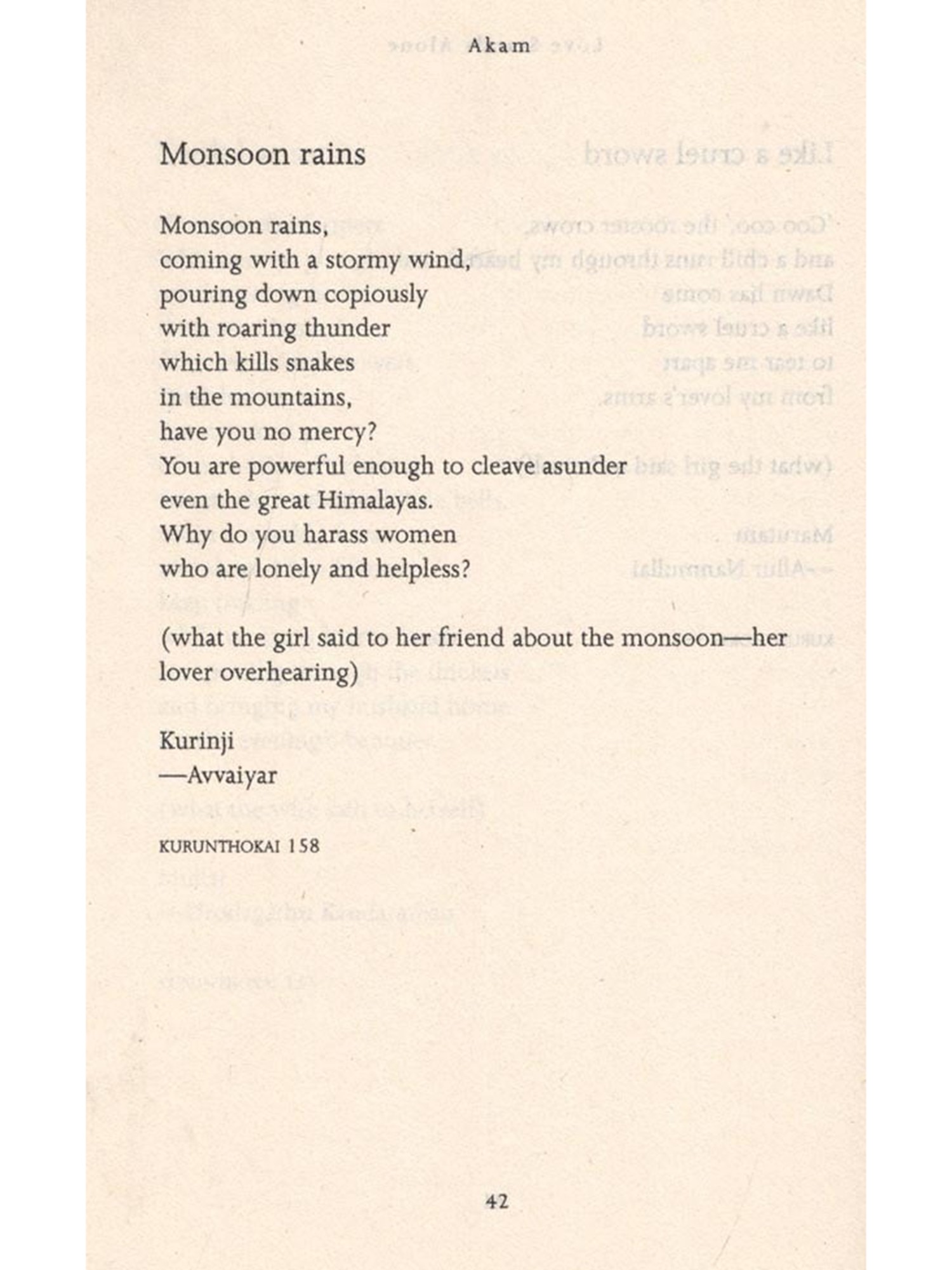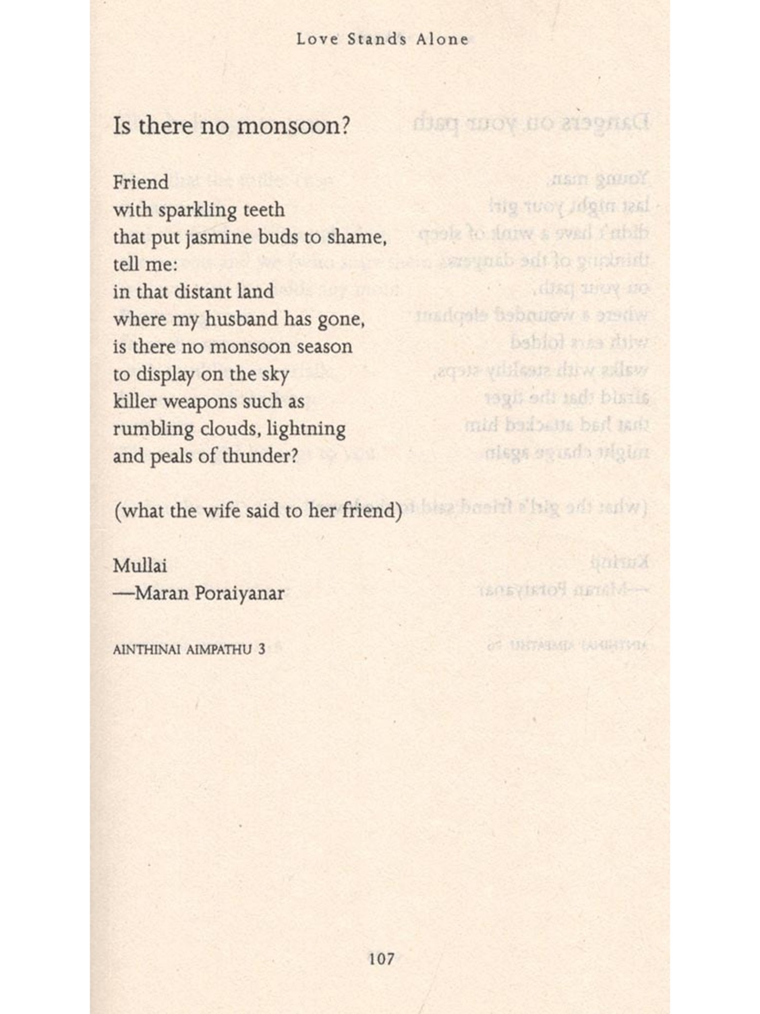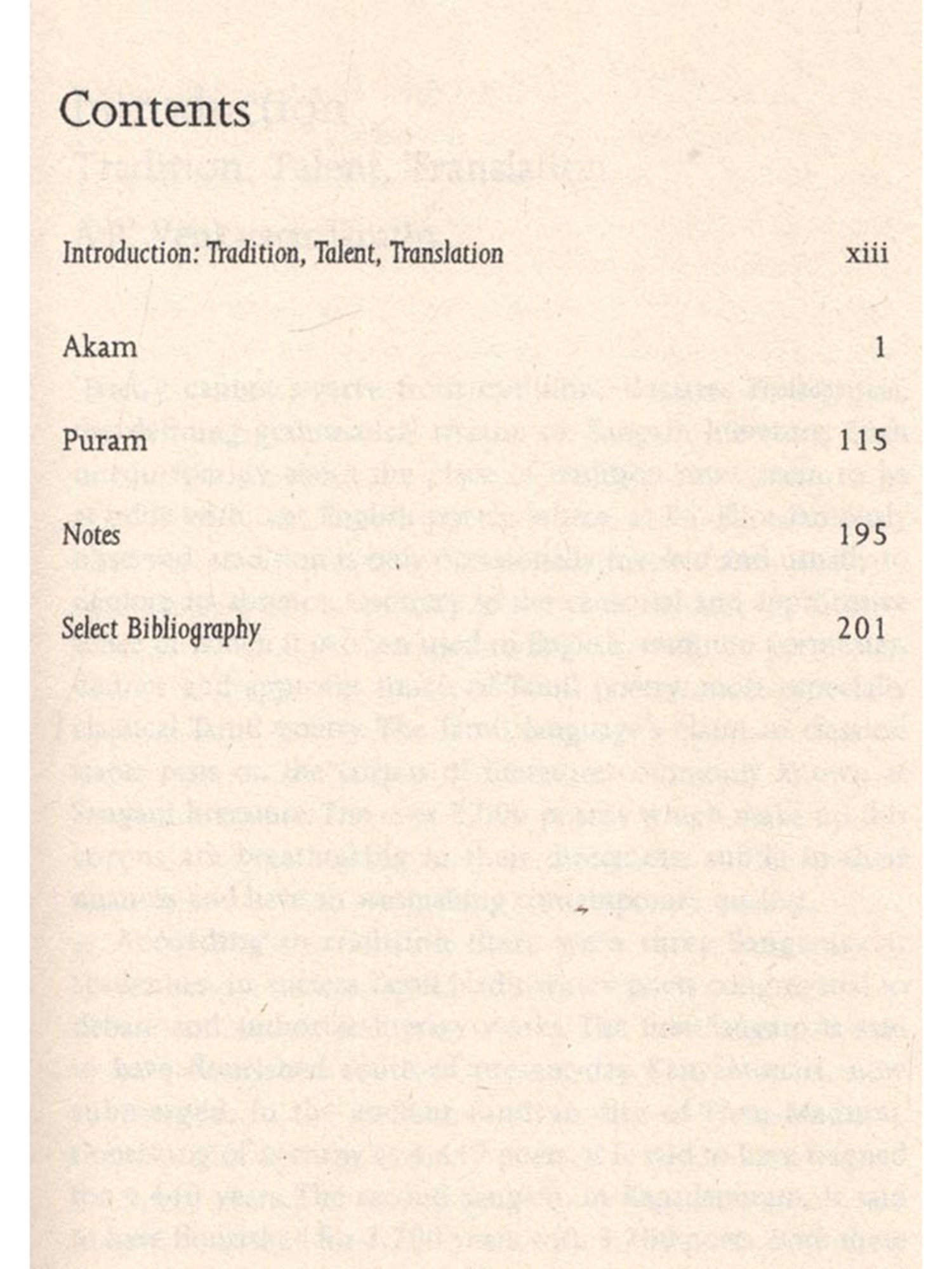 'Poetry cannot swerve from tradition, declares Tholkappiyam, the defining grammatical treatise on Sangam literature. Such unequivocality about the place of tradition must seem to be at odds with, say, English poetry where, as T.S. Eliot famously observed, tradition is only occasionally invoked and usually to deplore its absence. Contrary to the censorial and approbative sense in which it is often used in English, tradition permeates, defines and approves much of Tamil poetry, most especially classical Tamil poetry. The Tamil language's claim to classical status rests on the corpus of literature commonly known as Sangam literature. The over 2,000 poems which make up this corpus are breathtaking in their directness, subtle in their nuances and have an astonishing contemporary quality.