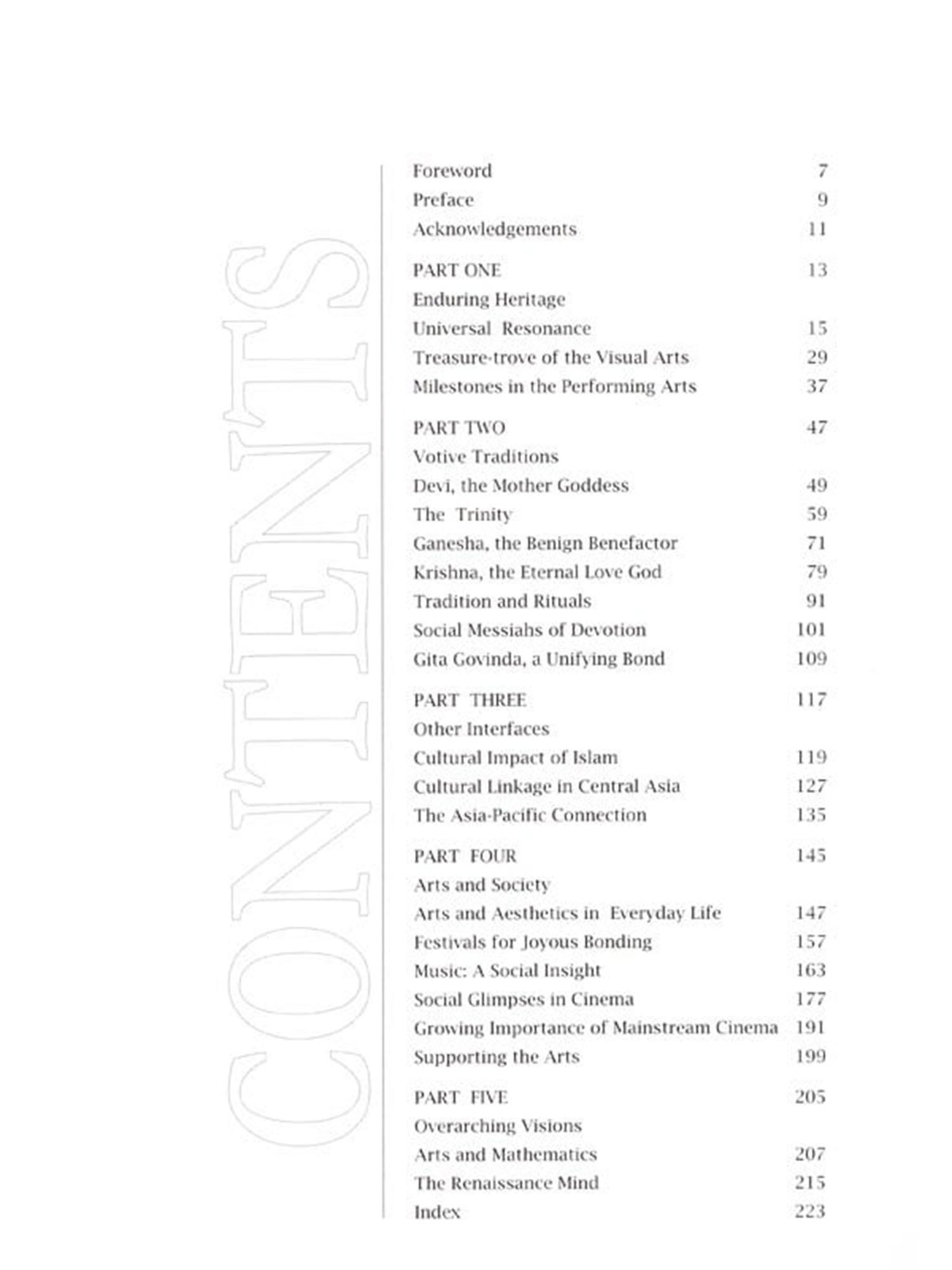 There is more than a grain of truth in the statement that India is in addition to possessing a population asset and a fast growing economy-an indisputable 'soft power', arising from its age-old heritage and its new manifestations in a technological era. Its only parallel, in all three respects, is China. China's economic prowess and population advantage are already clearly visible to the world; its soft power of cultural supremacy has recently begun making waves through its sixty Confucius Institutes in the USA and several others in the west. In contrast, India's 'cultural diplomacy' despite a head start nearly three millennia ago that covered the Buddhist East, including China-has seemingly not found its rightful voice yet. The laudable exception is the coming up of the existing and the new thirty-plus Nehru Centres, dotting the east and the west, under the Indian Council for Cultural Relations (ICCR). This book is an effort to project India's soft power, which has developed in multiple dimensions, in a reader-friendly manner. To this end, I have divided it into five well-defined parts: The first part, "Enduring Heritage', lays the foundation of the universal resonance of India's legacy vibrant till today; the cornerstones of its visual arts-paintings, sculpture, architecture and handicrafts; and the milestones of its performing arts-music, dance, theatre and puppetry. Part Two, 'Votive Traditions', recapitulates the immensely powerful underpinning of spirituality that holds together the Indian mindset-through visualisation of the mother goddess Devi; the primordial triumvirate of Brahma, Vishnu and Shiva; the endearing conceptualisation of Ganesha and Krishna; the votive rubric of tradition and rituals; the literary and musical filigree provided to the common masses by the medieval saint-poets; and the unifying role played by the classic pastoral drama Gita Govinda 'Other Interfaces', in Part Three, traces the extraordinary influence that Islam exercised on India's cultural fabric, and the footprints of India in some detail-on Central Asia in the west and on Asia-Pacific in the east. Part Four, 'Arts and Society', delineates the vital role of arts and aesthetics in the common man's everyday life and his countless festivals. It looks at the sociology of Indian music and cinema, rarely seen from this perspective. It also reserves some special attention for the growing importance of mainstream cinema. The arts do not exist without their patrons, so this aspect is dilated upon. The concluding section, 'Overarching Vision', throws a new light on mathematics always dear to Indian hearts-in relation to the arts. It leads the reader into the unchartered dimensions of a Renaissance mind in the Indian context. If the book achieves even partially its stated purpose, my efforts will have been amply rewarded.