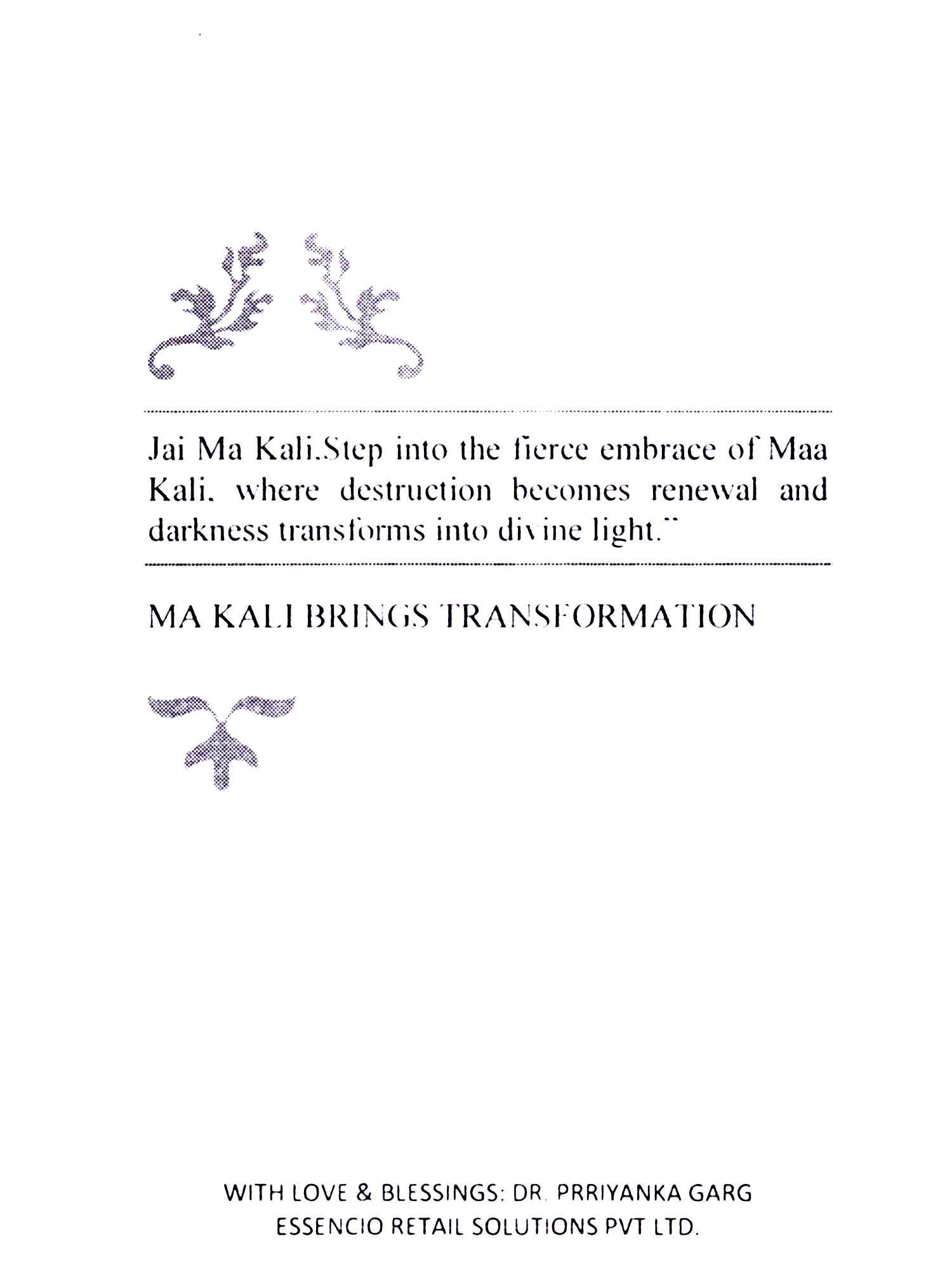 Dr. Prriyanka Garg is Phd in Business management, and Grand master in REIKI with certifications in multiple healing modalities. She is into guiding and teaching those courses. Now her spiritual journey is to help others in getting right understanding, and heal through resources available in nature. She has profound experience in finding the answers of people's suffering, providing them solutions which are affordable and easy to practise. She has been helping thousands of people with her intuitive readings and training on healing After her 12 years of spiritual learnings, She is certified tarot reader, reiki grandmaster, lamafera 3 levels, angel therapy master astrologer and vastu consultant. This maa shakti is truely very powerful and has personally helped me attained very high level of consciousness. This will never let you give up. For any situation very empowering message. Feel as if ma kali is with you.