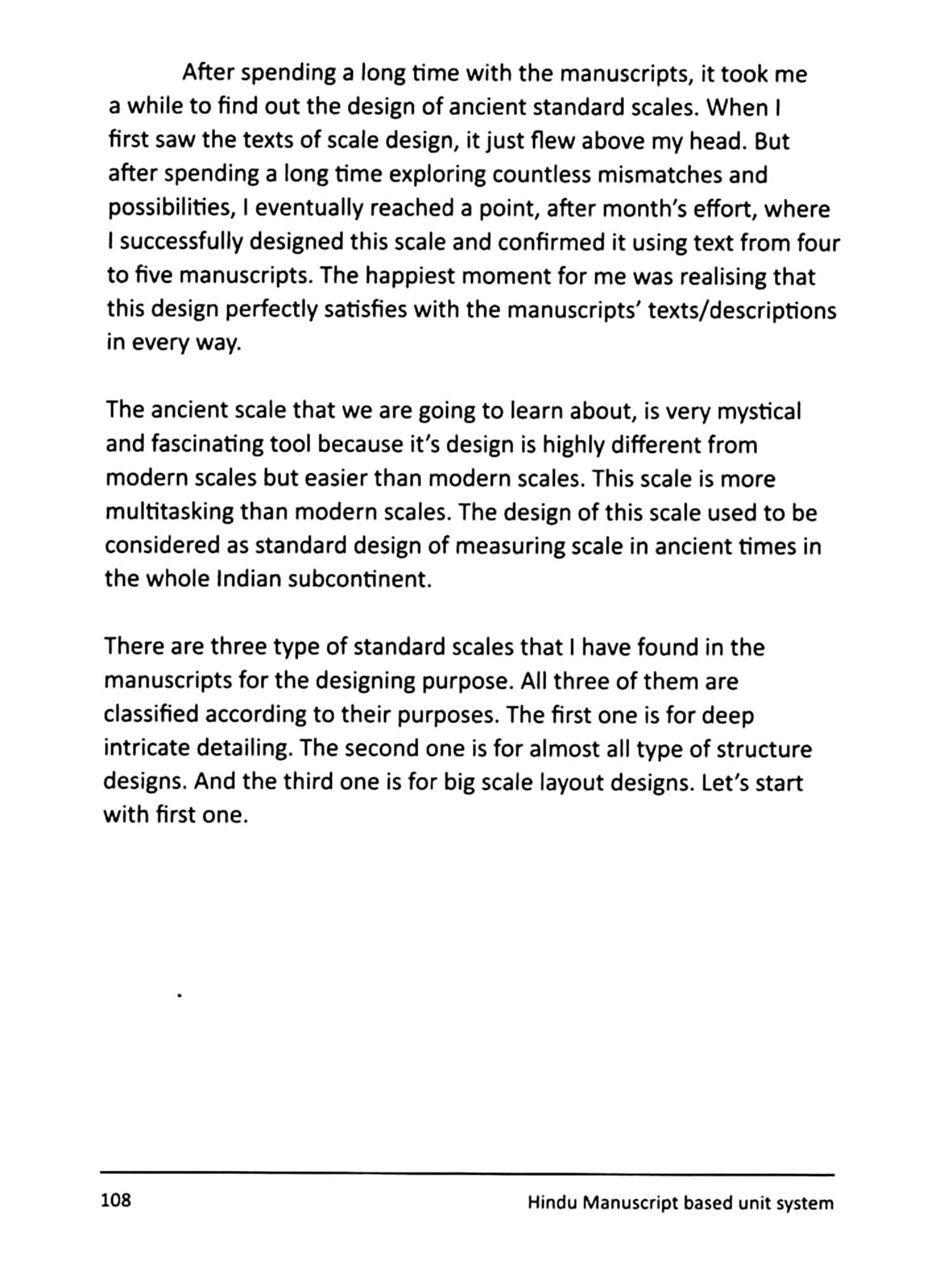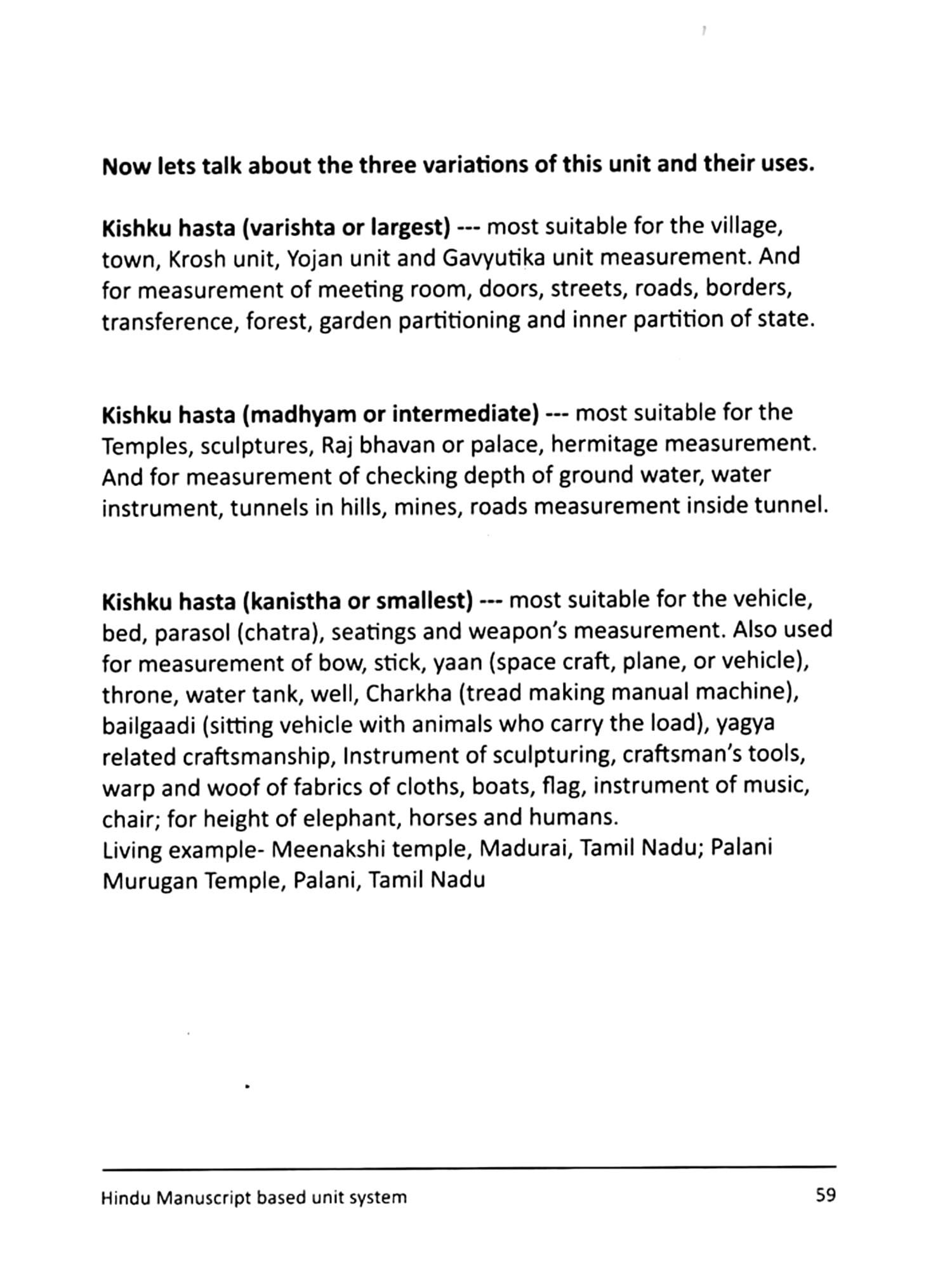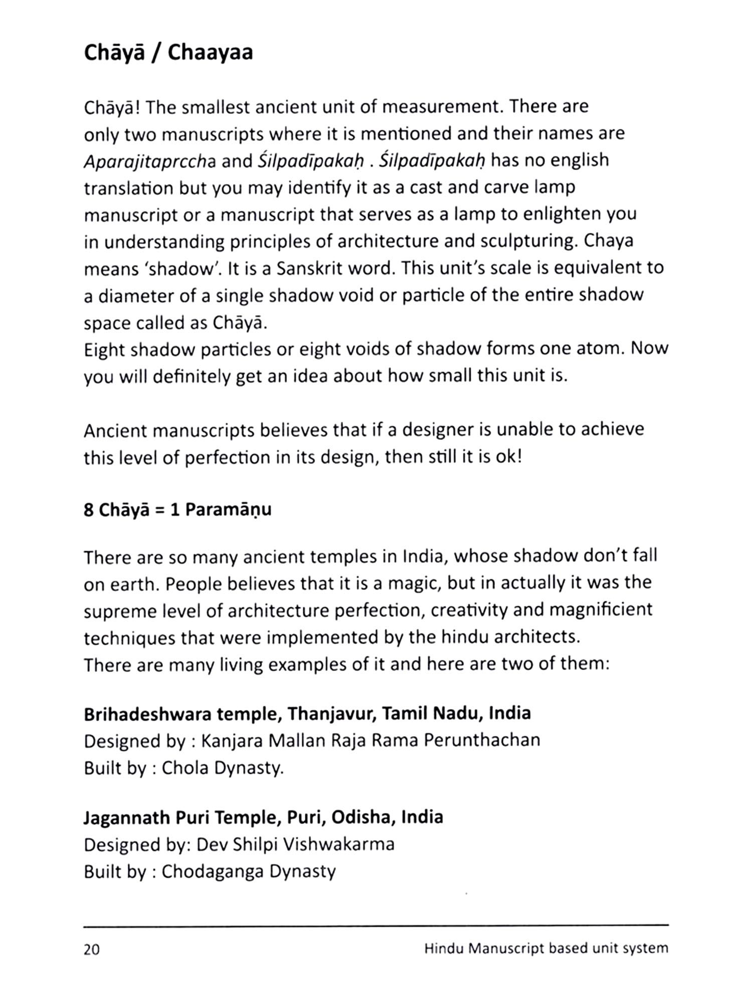 This book is all about the Units of measurement according to Hindu Manuscripts. Today we all are using metric units or foot-inche units in almost every usages. However, several times we might have felt lacking precision in them. For example, if you are designing a Dress or a House, you may use common unit for them, which is meter. But ancient designers used to use different units as the scale change or according to purpose or design. There are many translators and manuscripts decoder in Bharat, but they have translated about Hindu manuscript based ancient unit system in very brief as sub topic in big content translations. This book's primary goal is to make people understand the unit system in very simple and easy language with vibe, scale, name and use.