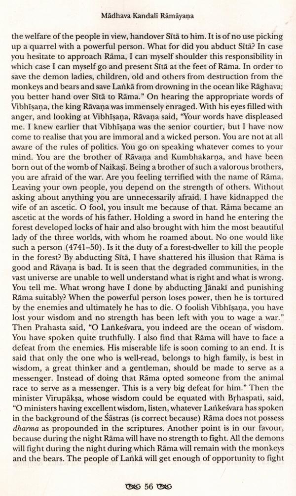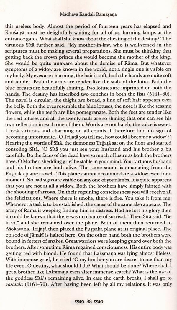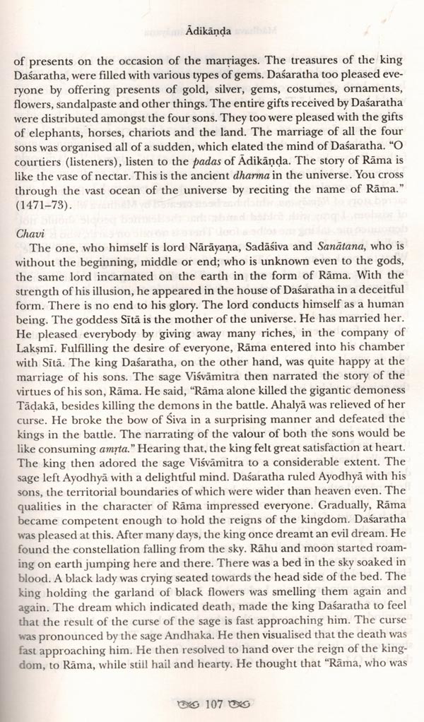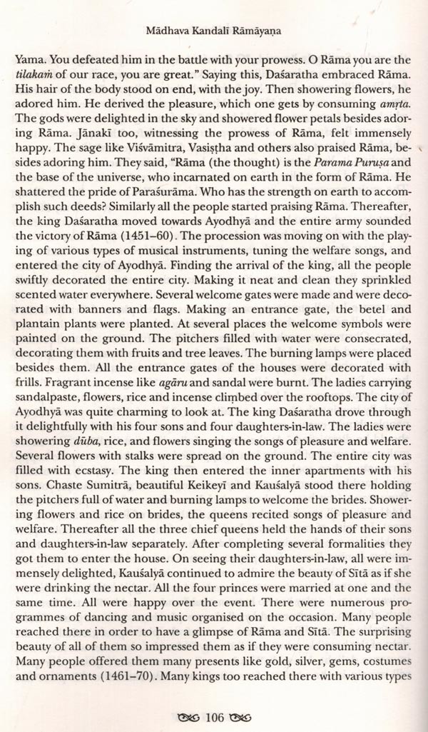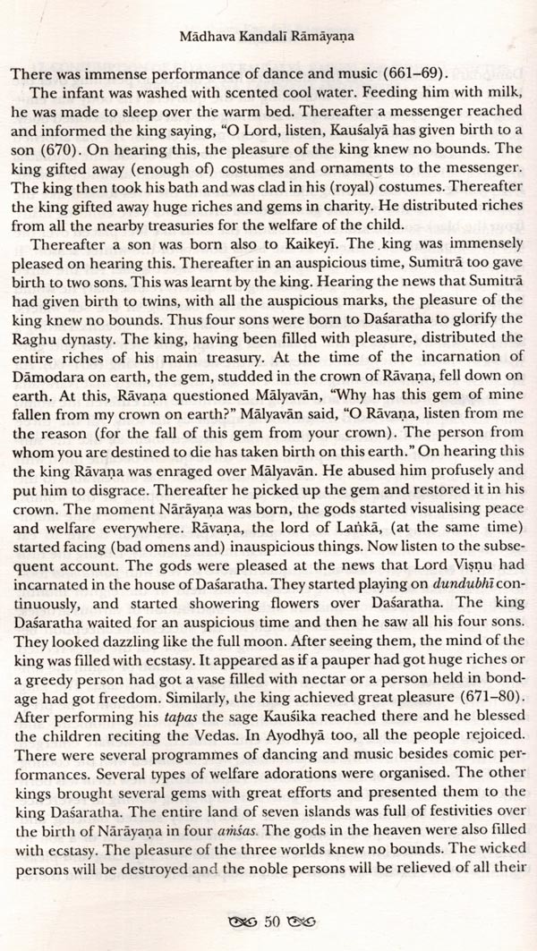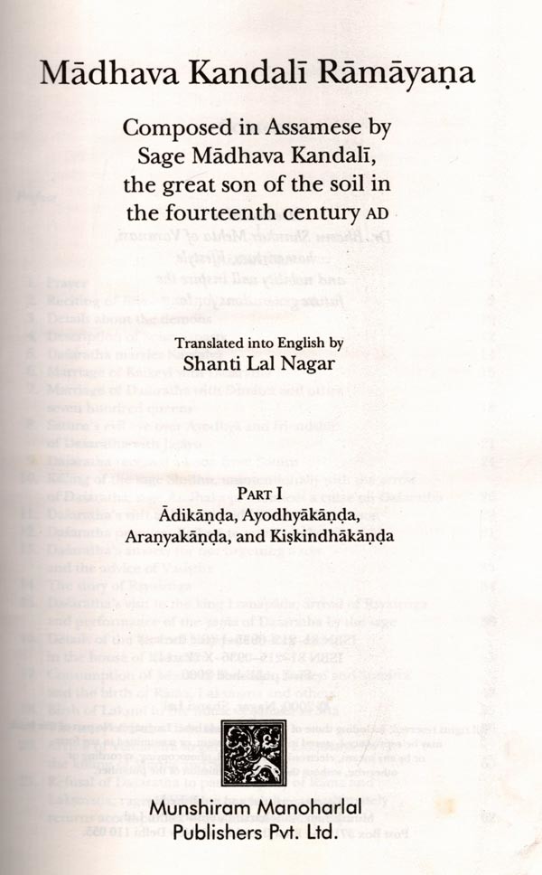 Though the scholars in the country have tried to trace the genesis of the Ramayana from the Vedic and post-Vedic literature, with the fragments of the story of Rama found scattered in these texts, but the most important job in the composition of the story of Rama was done by the sage Valmiki, who happened to be the foremost of the Indian Sanskrit poets. He composed the work on the basis of the brief of Rama’s story provided to him by the sage Narada, as well as the figments of the story collected by him with the extensive travelling of the country which immensely added to its popularity with the masses. After the sage Valmiki, several subsequent poets brought out Ramayana texts in Sanskrit as well as in the regional languages. The work composed by Madhava Kandali in Assamese language happens to be one of the earliest works of medieval period, having been composed in the fourteenth CCflttll3’ Al). The Ramayana of K4ttivasa was composed in the fifteenth century, while the Ramacaritamanasa by Tulasidasa in the sixteenth century AD. The work of Madhava Kandali was composed on the basis of the Valmiki Ramayana, though some variations are noticed here and there. The present work is an English translation of the Madhava Kandali Ramayana in Assamese.