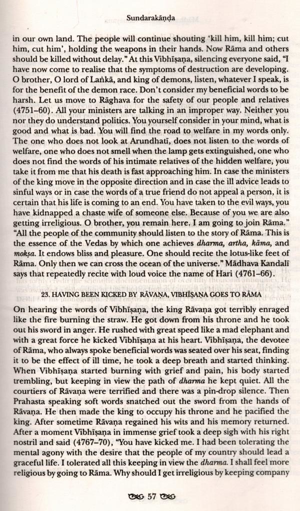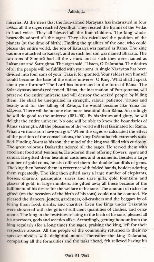 The collection by him of Vedic hymns which are 157 in number points to the important events in the Ramayana, composed by the sage Valmiki at a considerably later stage of the Indian history. As to the Vedic origin of the Rñrnàya2a it may be pointed out that though the entire story of Rama could not be made out from the Vedic texts, duly supported by the conclusive evidence, but evidently the story of Rama was quite popular in fragments in the country, the germination of which could be available in the Vedic texts. In this connection, it may be pointed out that the correlation between the story of Rama and the Vedic literature cannot be completely ruled out be- cause according to the Valmiki Ramayana it was the great seer Narada who inspired the sage Valmiki to compose Ramayana on the basis of the brief of the story he conveyed to the sage. Now the sage Narada happened to be the son of Brahma, the custodian of the Vedas. It could, therefore, be inferred that Brahma, who was the reciter of the Vedas must have conveyed the brief of the story of Rama to Narada, in the full background of the Vedic hymns, which in turn was conveyed by Narada to Valmiki, who composed the Ramayana in the background of the brief of the story provided to him by Narada incorporating several fragments of the story in vogue in the contemporary society. But the number of such fragments was so large and widespread, that the sage Valmiki could take care of only a limited number of them and many fragments of the said story were still left out and some of them were patronised by the poets of the subsequent times, while composing their respective works. In this connection it may be kept in view that Nilakantha has tried to trace most of the characters and events of the Ramayana in the Rgveda.
