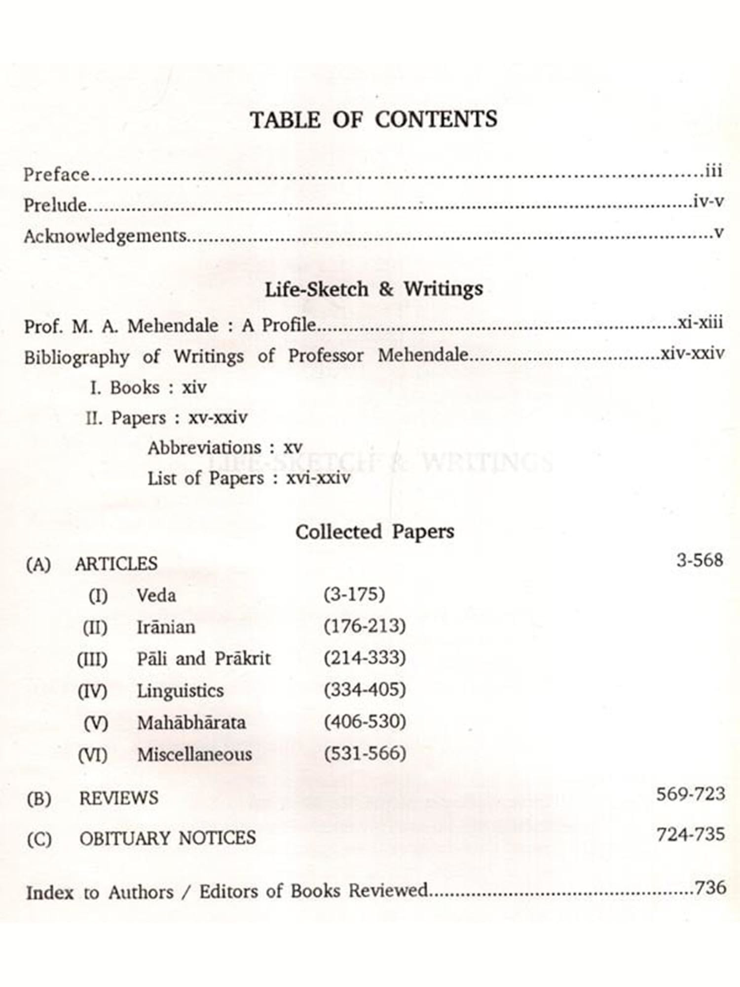 We were indeed fortunate to have had a personal meeting, some three years ago, with Prof. M. A. Mehendale in the Bhandarkar Oriental Research Institute, Pune. We were of course aware that he is a world-renowned scholar of Indian linguistics, languages, literature, and culture. And even before that meeting, for some years we were acquainted with his erudite contributions. However, on meeting him, besides his very learned bearing, we were also deeply impressed by his humility, courteousness, and no less by his warm and affectionate disposition. Prof. Mehendale's work on the Aśokan inscriptions, Avesta, and also on the Mahabharata is too wellknown. His writings are considered authentic and by many as final in his fields of investigation. For long years, his research papers and articles have been published in the journals of high standing both in India and abroad. Reflecting as these writings do serious research and originality, the scholars rate his thought-provoking studies among the valuable contributions to the domain also of Indology in general. Since his articles, paprers etc. are scattered through different published sources, it was decided by Prof. S. D. Laddu and his colleagues at the Bhandarkar and other Oriental Research Institutes in Pune to collect all such writings and publish them in a book form. An editorial board was next instituted. When the collected material was organized and made ready for printing, Dr. Laddu suggested us to publish it as a Volume, a proposal to which we agreed with delight. The format of the book follows the Quail Scripts style.