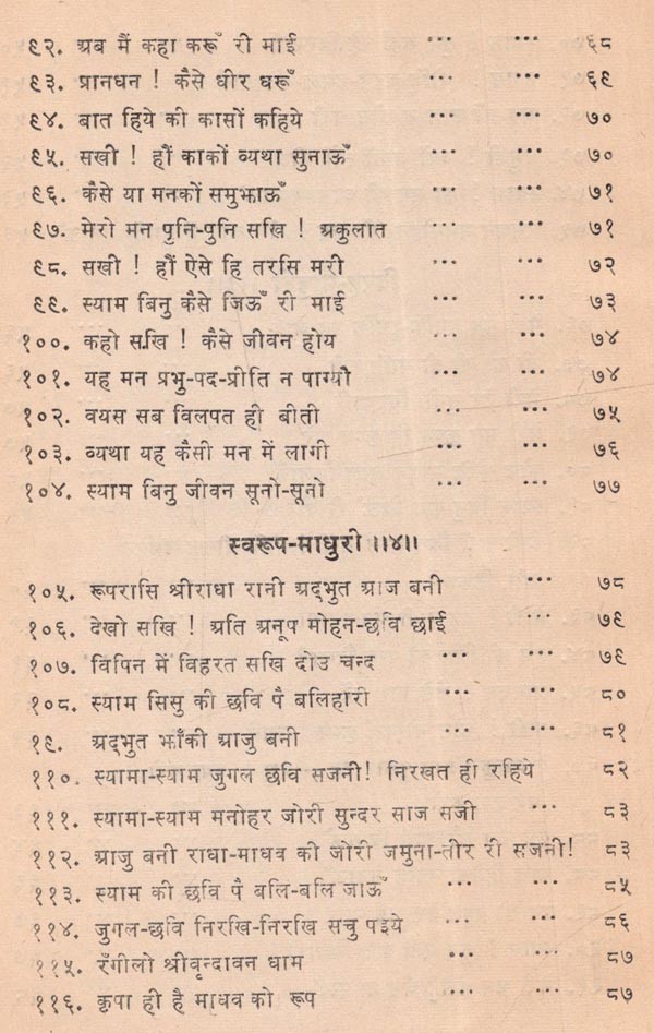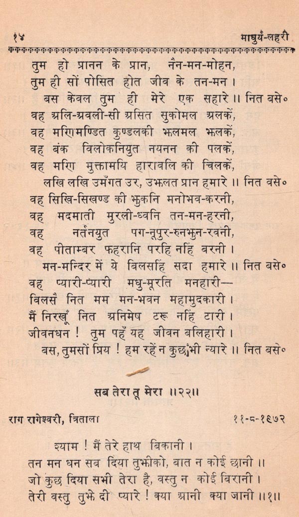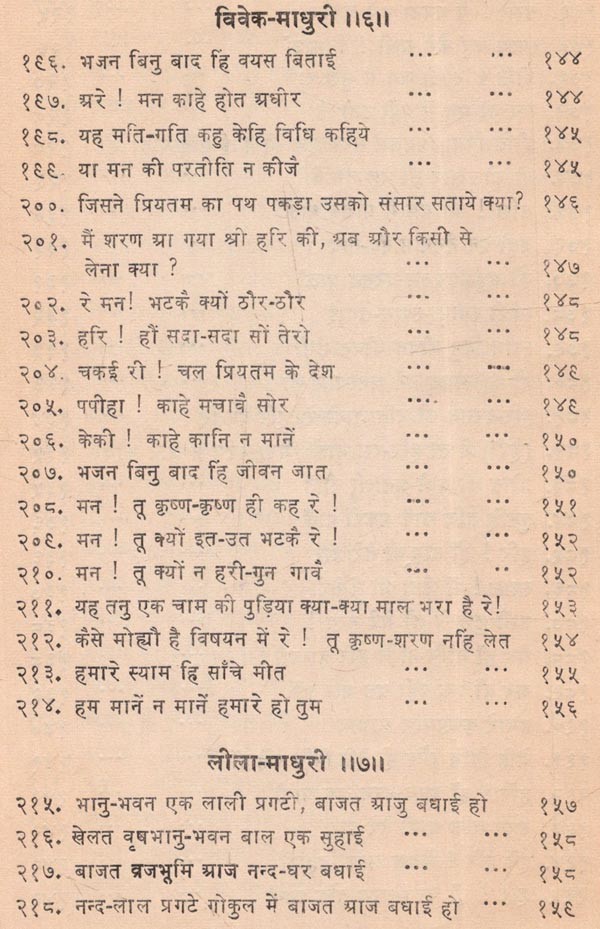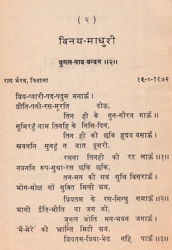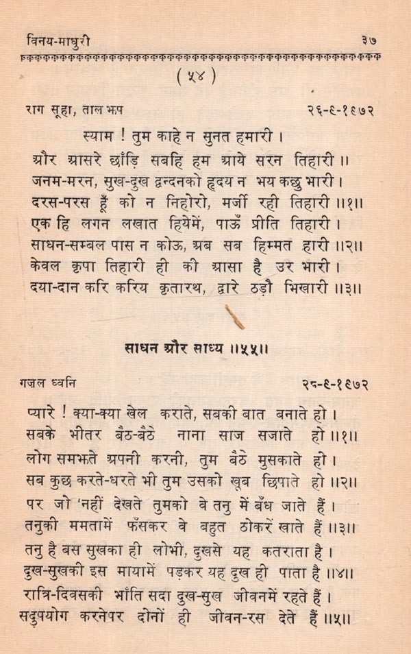 मूकं करोति वाचालं पङ्ग लङ्घयते गिरिम् । यत्कृया तमहं वन्दे परमानन्द-माधवम् ।। प्रभुकी असीम कृपामयी इच्छा-शक्ति हो जगन्नाटककी सूत्रधात्री है। यही प्रत्येक प्राणीको विभिन्न व्यापारोंमें प्रेरित कर रही है। कैसी अद्भुत है उनकी वह सोलाशक्ति। करती सब कुछ वही है। किन्तु बेचारा प्राणी अपनेको ही कर्ता मानकर व्यर्थ कर्म-बन्धन में बंध जाता है। और स्वयं सर्वथा निरीह होने पर भी व्यर्थ अभिमान और दीनताका आरोप अपने पर कर लेता है। कैसी दयनीय है उसकी यह बिडम्बना । प्रभुकी उस लीलाशक्तिका प्रसाद ही है यह प्रस्तुत रचना । यों तो सर्वत्र सब कुछ उसीका लीला-लास्य है। परन्तु इसमें तो स्पष्ट ही उसको स्फूति जान पड़ी। यहाँ तो मूकको वाचाल करनेकी बात स्पष्ट हो चरितार्थ हो गयी। इन पंक्तियोंका लेखक न भक्त है, न कवि । पचास वर्षसे भी अधिक हुए अपने विद्यार्थी जीवनमें इसे कुछ तुकबन्दी करने-का स्वभाव था। उस समय भावी जोवनमें कवि बननेका उत्साह भी था। परन्तु फिर धीरे-धीरे वह रुचि और उत्साह शिथिल पड़ते गये और अब प्रायः पेतीस वर्षसे तो इसने अपने अनुवादित ग्रन्थोंके मंगलाचरणसे एक दो श्लोक या दोहा लिखनेके सिवा और कोई कविता नहीं लिखी । इसे न कविता लिखनेकी रुचि थी, न पढ़नेकी । आधुनिक छायावादी कविता तो समझनेकी भी क्षमता नहीं है। इबर कुछ वर्षोंसे यह कभी-कभी "मेरो मन हुमकि-हुकि रह जाय" इस पंक्तिको गुनगुनाया करता था। पता नहीं कबसे इसे गुनगुनाना भारम्भ हुआ । गत वर्ष सा० ११ जुलाई सन् १९७२ ६० को मनमें एक संकल्प हुआ कि इसके आधार पर एक पद लिालू। इस संक्रुपको पूति जिस पद द्वारा हुई वह इस पुस्तक का ७६ वाँ गीत है। उस दिनसे न ज्ञाने प्रभुको श्या इच्चदा हुई नित्य प्रति एक-एक पद प्रथित होने लगा। स्वयं ही प्रथम पंक्ति स्फुरित होती, उसकी पूतिका संकल्प होता और पद तैयार हो जाता। इस प्रकार प्रायः पन्द्रह दिन तक तो एक-एक पद लिखा गया और फिर काव्य भारती और भी मुखरित हो उठी। एक-एक दिनमें पाँच-पाँच छः-छः पद भी बनने लगे। मुझे क्या लिखना है, किस विषयमें लिखना है और कब लिखना है-यह में कभी नहीं सोचता था। जब जंसी प्रेरणा होती लिखने लगता और पद तैयार हो जाता। इस प्रकार अब तक सात सौसे ऊपर पद लिखे जा चुके हैं। यह क्रम कब तक चलेगा वे ही जानें। सबके केन्द्र-बिन्दु श्रीराषा-माधव युगल सरकार ही हैं। उनकी लीला, उनका विरह, उनकी रूप-माधुरी, उनकी महिमा और उनकी प्रोति ही इनमें गायी गयी है। इस प्रकार इस नगण्यसे वे अपनी चर्चा करा रहे हैं। क्यों करा रहे हैं, वे ही जानें। उन्होंने जो लिखाया है, एक निरीह लेखककी भाँति लिख दिया है। उन भावोंका शतांश भी इस जीवनमें चरितार्थ होता तो चित्तको बहुत सन्तोष मिलता। परन्तु जब वे लिखाते हैं तो लिखूँ भी क्यों नहीं ! कमसे कम उनका चि