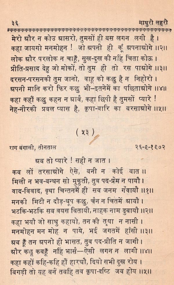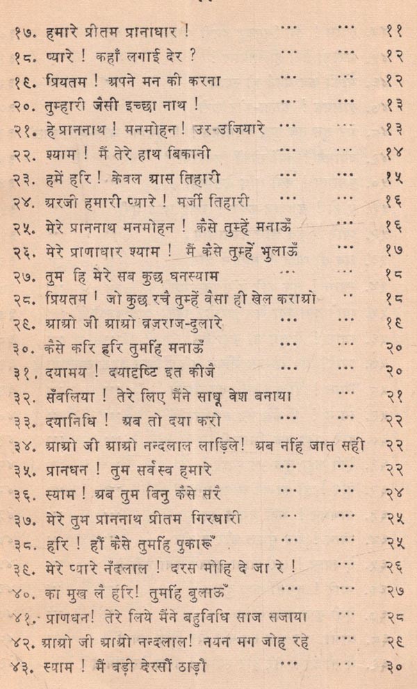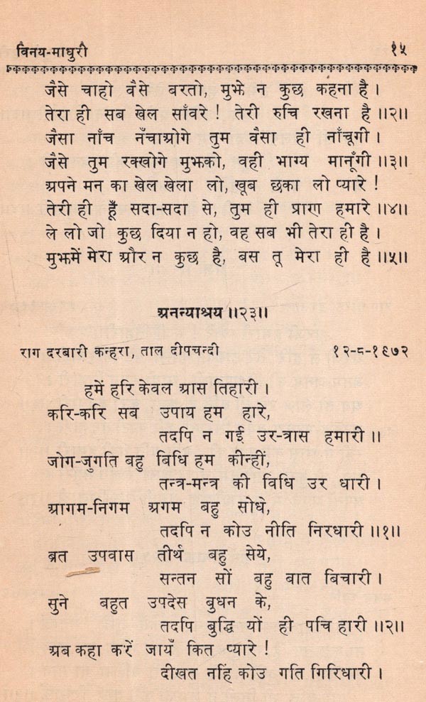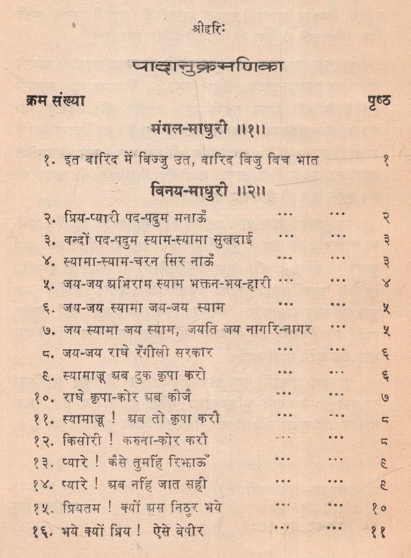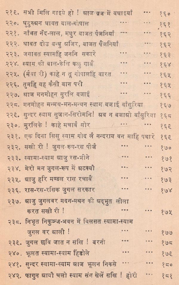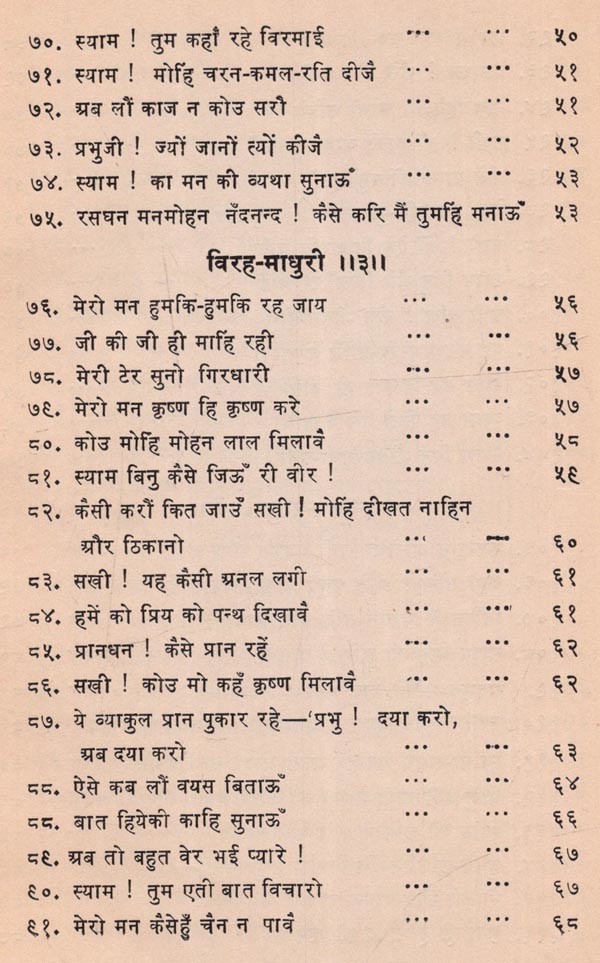 मूकं करोति वाचालं पङ्ग लङ्घयते गिरिम् । यत्कृया तमहं वन्दे परमानन्द-माधवम् ।। प्रभुकी असीम कृपामयी इच्छा-शक्ति हो जगन्नाटककी सूत्रधात्री है। यही प्रत्येक प्राणीको विभिन्न व्यापारोंमें प्रेरित कर रही है। कैसी अद्भुत है उनकी वह सोलाशक्ति। करती सब कुछ वही है। किन्तु बेचारा प्राणी अपनेको ही कर्ता मानकर व्यर्थ कर्म-बन्धन में बंध जाता है। और स्वयं सर्वथा निरीह होने पर भी व्यर्थ अभिमान और दीनताका आरोप अपने पर कर लेता है। कैसी दयनीय है उसकी यह बिडम्बना । प्रभुकी उस लीलाशक्तिका प्रसाद ही है यह प्रस्तुत रचना । यों तो सर्वत्र सब कुछ उसीका लीला-लास्य है। परन्तु इसमें तो स्पष्ट ही उसको स्फूति जान पड़ी। यहाँ तो मूकको वाचाल करनेकी बात स्पष्ट हो चरितार्थ हो गयी। इन पंक्तियोंका लेखक न भक्त है, न कवि । पचास वर्षसे भी अधिक हुए अपने विद्यार्थी जीवनमें इसे कुछ तुकबन्दी करने-का स्वभाव था। उस समय भावी जोवनमें कवि बननेका उत्साह भी था। परन्तु फिर धीरे-धीरे वह रुचि और उत्साह शिथिल पड़ते गये और अब प्रायः पेतीस वर्षसे तो इसने अपने अनुवादित ग्रन्थोंके मंगलाचरणसे एक दो श्लोक या दोहा लिखनेके सिवा और कोई कविता नहीं लिखी । इसे न कविता लिखनेकी रुचि थी, न पढ़नेकी । आधुनिक छायावादी कविता तो समझनेकी भी क्षमता नहीं है। इबर कुछ वर्षोंसे यह कभी-कभी "मेरो मन हुमकि-हुकि रह जाय" इस पंक्तिको गुनगुनाया करता था। पता नहीं कबसे इसे गुनगुनाना भारम्भ हुआ । गत वर्ष सा० ११ जुलाई सन् १९७२ ६० को मनमें एक संकल्प हुआ कि इसके आधार पर एक पद लिालू। इस संक्रुपको पूति जिस पद द्वारा हुई वह इस पुस्तक का ७६ वाँ गीत है। उस दिनसे न ज्ञाने प्रभुको श्या इच्चदा हुई नित्य प्रति एक-एक पद प्रथित होने लगा। स्वयं ही प्रथम पंक्ति स्फुरित होती, उसकी पूतिका संकल्प होता और पद तैयार हो जाता। इस प्रकार प्रायः पन्द्रह दिन तक तो एक-एक पद लिखा गया और फिर काव्य भारती और भी मुखरित हो उठी। एक-एक दिनमें पाँच-पाँच छः-छः पद भी बनने लगे। मुझे क्या लिखना है, किस विषयमें लिखना है और कब लिखना है-यह में कभी नहीं सोचता था। जब जंसी प्रेरणा होती लिखने लगता और पद तैयार हो जाता। इस प्रकार अब तक सात सौसे ऊपर पद लिखे जा चुके हैं। यह क्रम कब तक चलेगा वे ही जानें। सबके केन्द्र-बिन्दु श्रीराषा-माधव युगल सरकार ही हैं। उनकी लीला, उनका विरह, उनकी रूप-माधुरी, उनकी महिमा और उनकी प्रोति ही इनमें गायी गयी है। इस प्रकार इस नगण्यसे वे अपनी चर्चा करा रहे हैं। क्यों करा रहे हैं, वे ही जानें। उन्होंने जो लिखाया है, एक निरीह लेखककी भाँति लिख दिया है। उन भावोंका शतांश भी इस जीवनमें चरितार्थ होता तो चित्तको बहुत सन्तोष मिलता। परन्तु जब वे लिखाते हैं तो लिखूँ भी क्यों नहीं ! कमसे कम उनका चि
