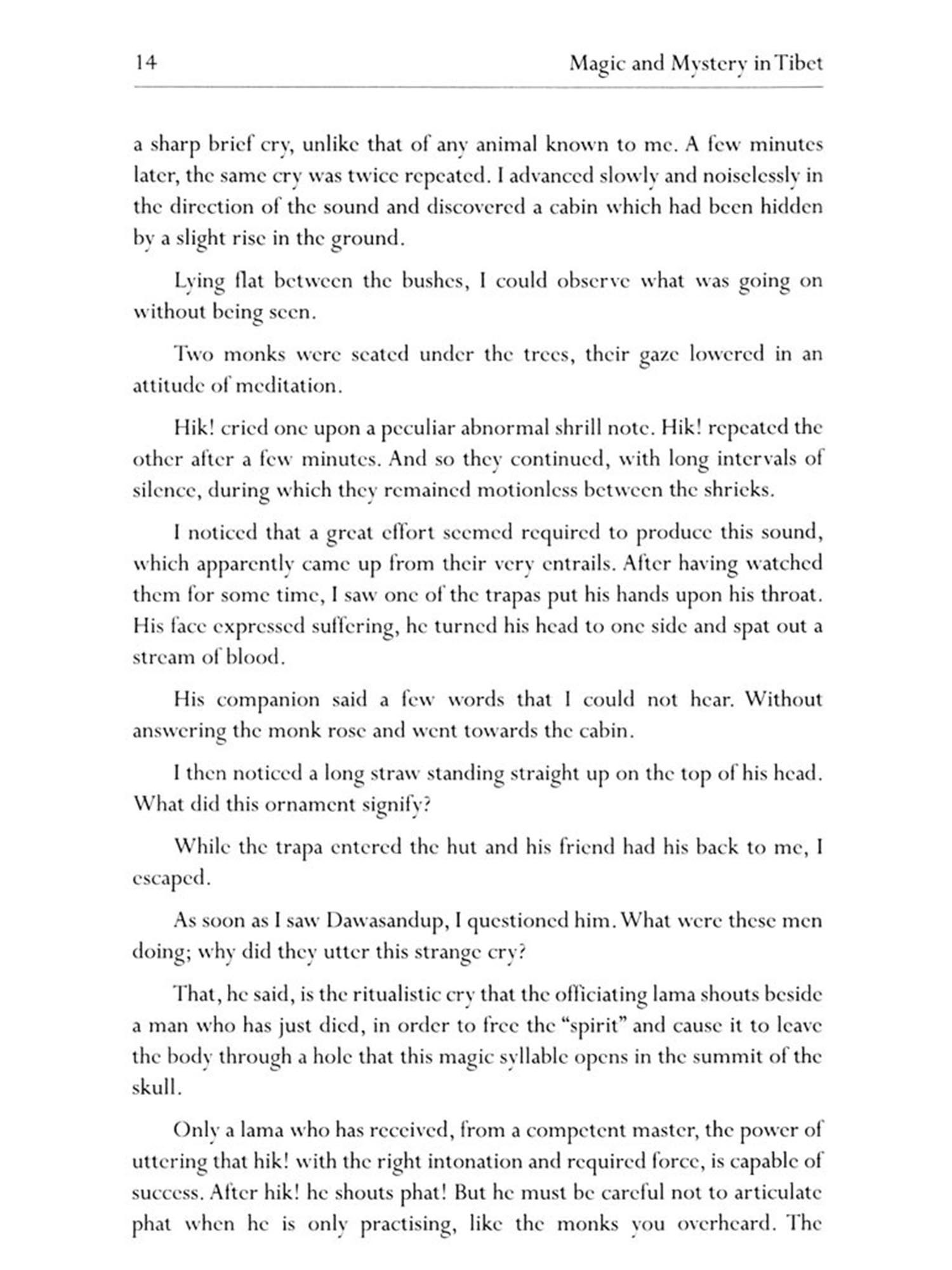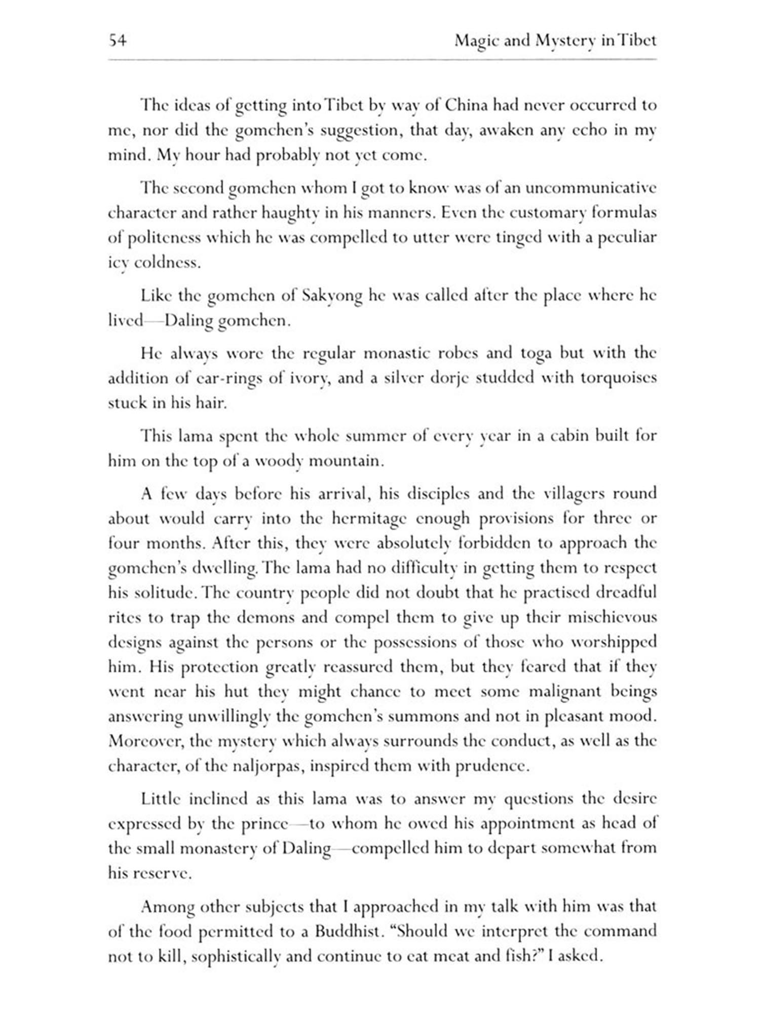 Next I have tried to group together a certain number of salient points concerning the occult and mystical theories and the psychic training practices of the Tibetans. Whenever I have discovered in the rich store of my recollections a fact bearing on these subjects, I have related it as it came. Consequently this book is not a record of travel, for the subject does not lend itself to that treatment.