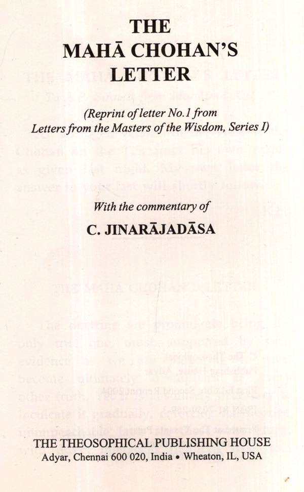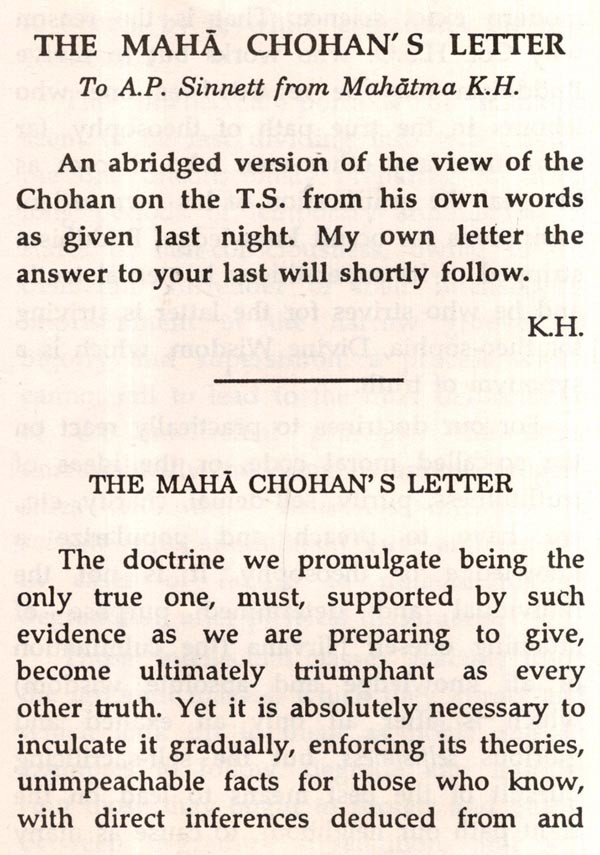 The Maha Chohan's Letter (Reprint of letter No. 1 from Letters from the Masters of the Wisdom, Series I)