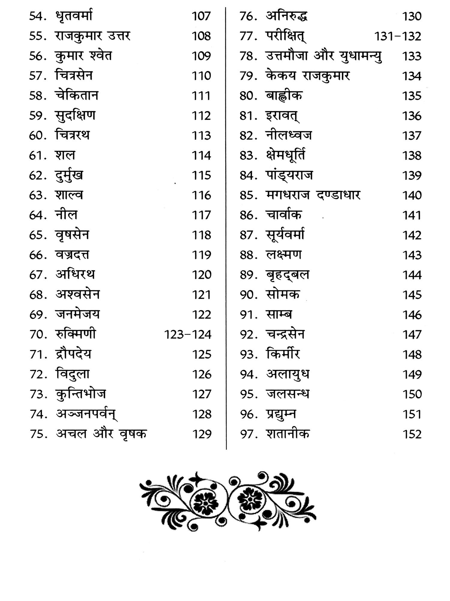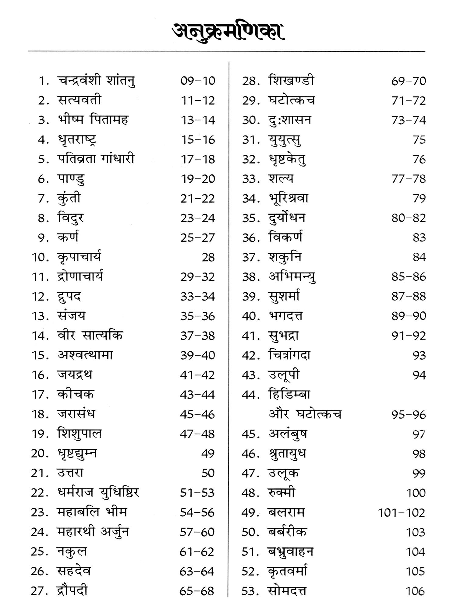 पुस्तक में महाभारत के अधिकांश प्रमुख पात्रों का पूरा परिचय दिया गया है। इनमें से कुछ पात्र ऐसे भी हैं जिनके बारे में सामान्यतः बहुत कम जानकारी मिलती है, तो कुछ ऐसी जानकारी भी है जो सभी को पता नहीं है। लेकिन जो भी जानकारी दी गई है उसके पीछे उद्देश्य यही है कि वह तथ्यपरक हो। स्थानाभाव के कारण पात्रों का विवरण कई स्थानों पर संक्षिप्त करना पड़ा है लेकिन महत्त्व के सभी पात्रों का वर्णन इसमें आ गया है। बड़े कलेवर और अधिक मूल्य वाली अनेक पुस्तकों और टीकाओं के बीच हिन्दी में प्रकाशित यह पुस्तक सभी वर्ग के पाठकों, खासतौर से आज की व्यस्ततम जीवन चर्या के अभ्यस्त लोगों, युवाओं और किशोरों के लिए उपयोगी सिद्ध होगी। विद्यालयों और महाविद्यालयों में विद्यार्थियों के लिए यह पुस्तक महाभारत के पात्रों के परिचय कोश या सन्दर्भपुस्तक के रूप में काम आ सकेगी।